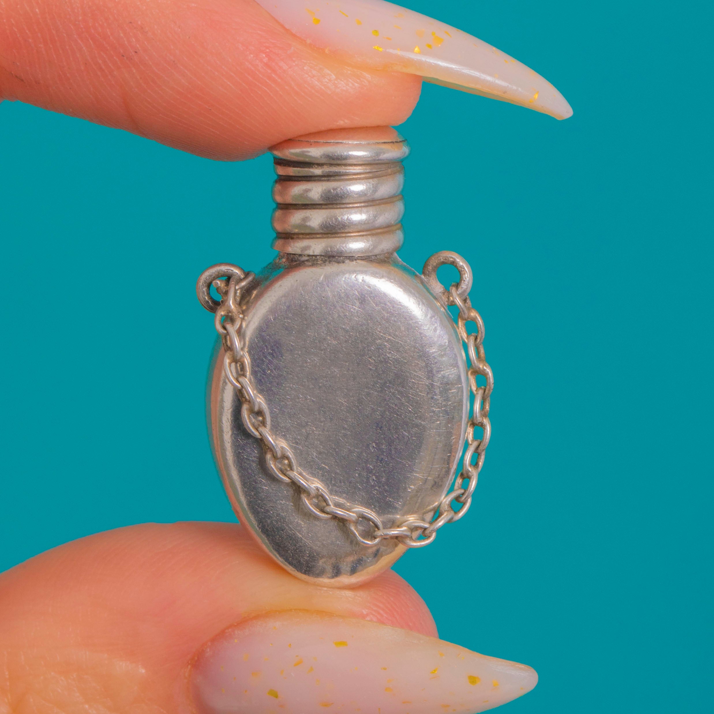 A wonderfully whimsical Arts and Crafts perfume bottle pendant in Silver, finished with bright blue enamel and flowing, organic lines. It’s the sort of piece that feels like a tiny treasure – practical, pretty, and full of character.