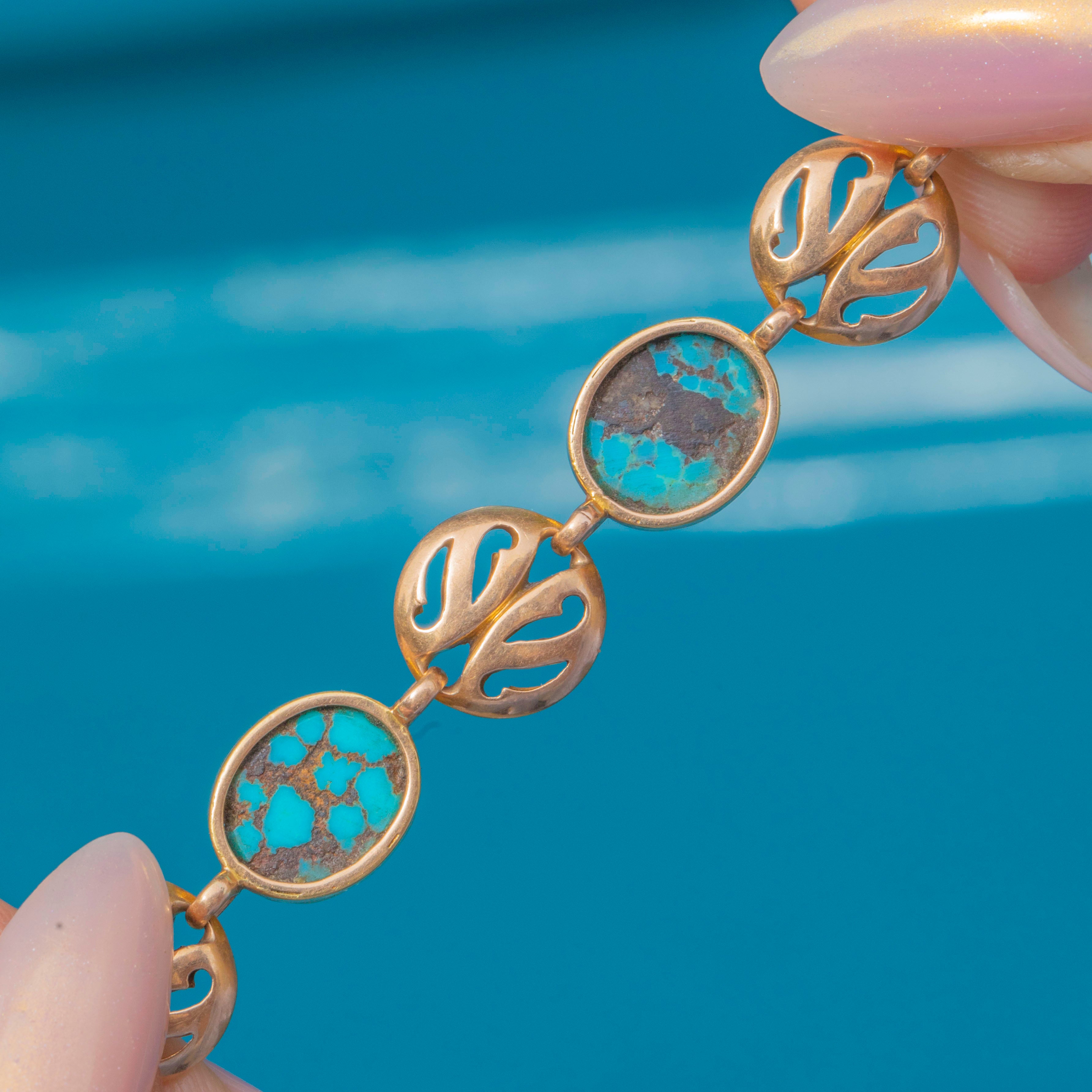 EXCELLENT: The bracelet is in superb condition. The Turquoise stones are intact and vibrant, and the Gold settings are secure. There is one minor repair beneath a single link, discreet and stable, ensuring the piece remains fully wearable and beautifully presented.