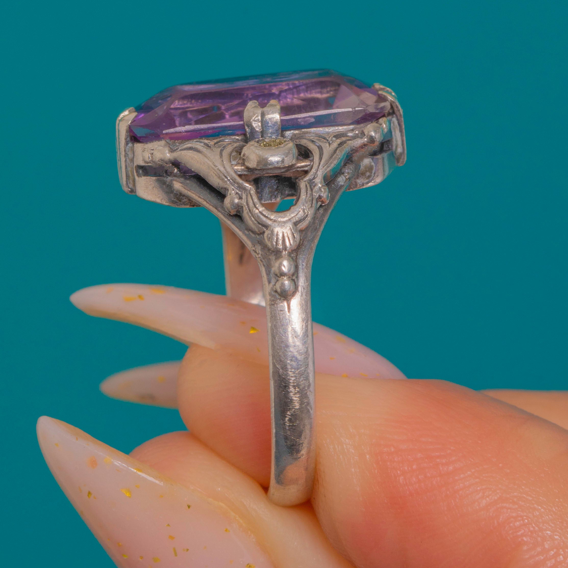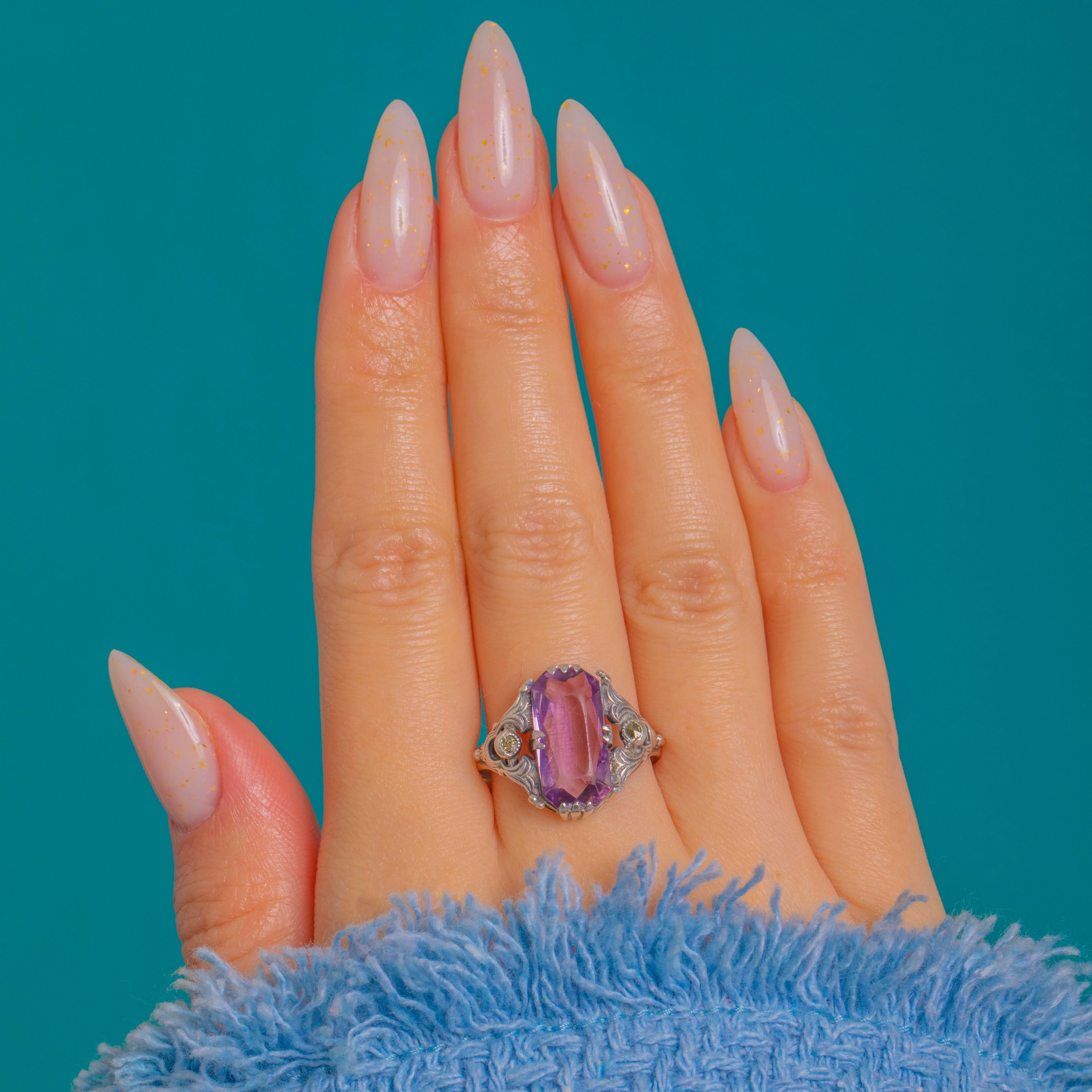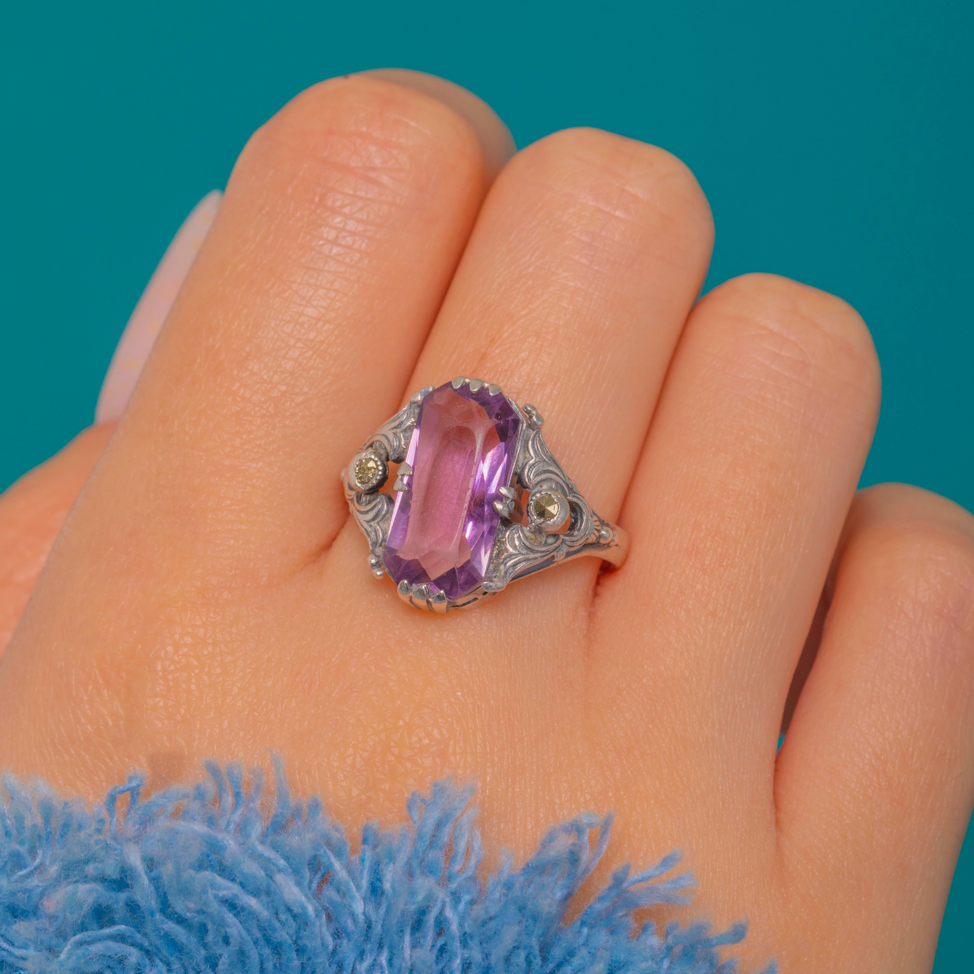 An ornate Arts & Crafts Amethyst dress ring, hand-crafted in gleaming Silver and alive with sculptural detail. An elongated, step-cut Amethyst of approximately 2.35ct takes centre stage in a softly geometric claw setting, its pretty mauve hue flanked by twinkling Marcasite accents set in fine milgrained bezels. Pierced scrolls and foliate engraving flow through the open gallery and shoulders, giving this finger‑spanning beauty a refined, romantic silhouette.