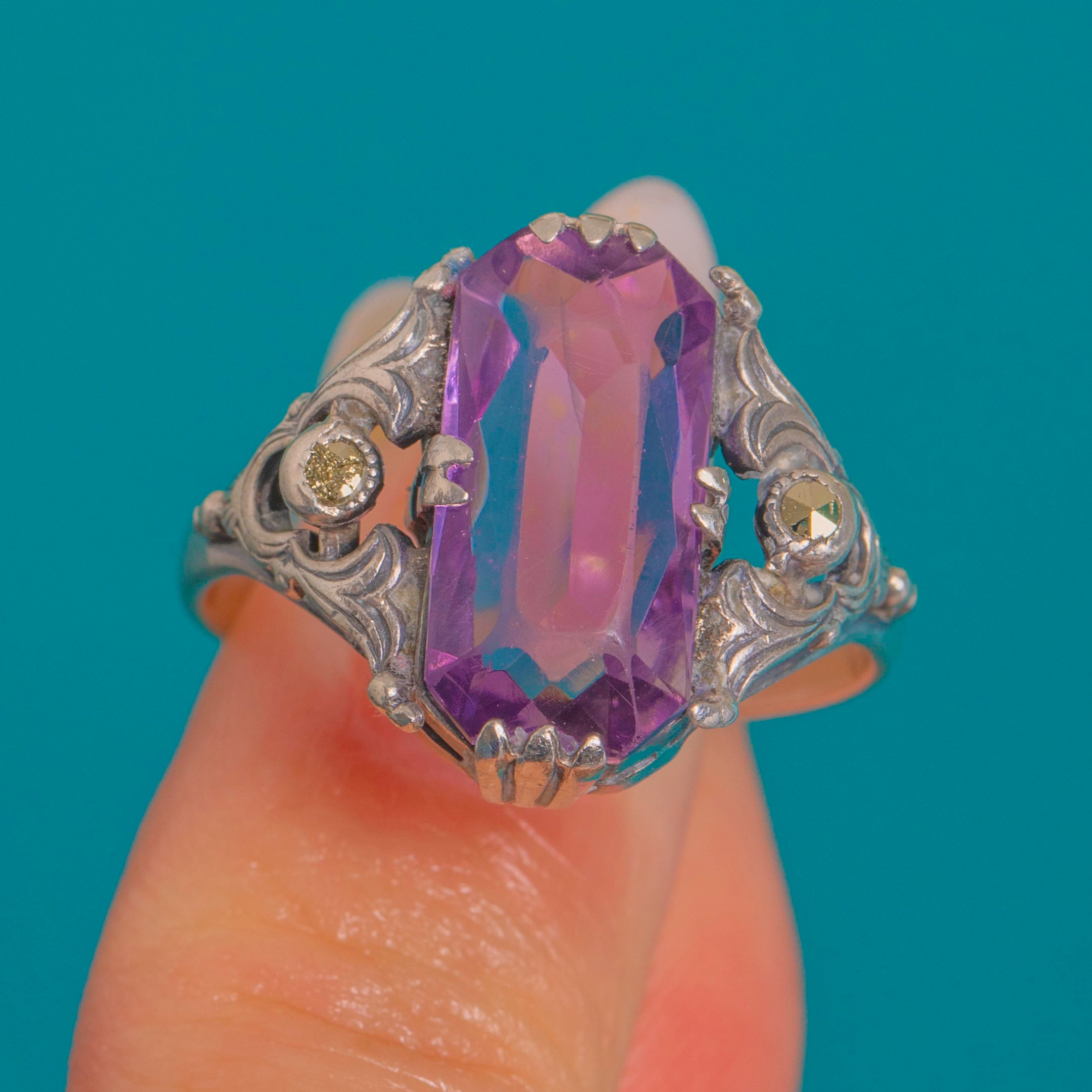 VERY GOOD: The Amethyst is bright with even colour, showing only minor facet-edge abrasions consistent with age; the Marcasite accents are intact and secure. The Silver setting, open gallery and engraved shoulders remain crisp with a lovely aged patina, and the claws and bezels hold the stones securely. Under magnification a small localised solder point is noted to one side of the gallery; overall wear is light and the ring has been well cared for.