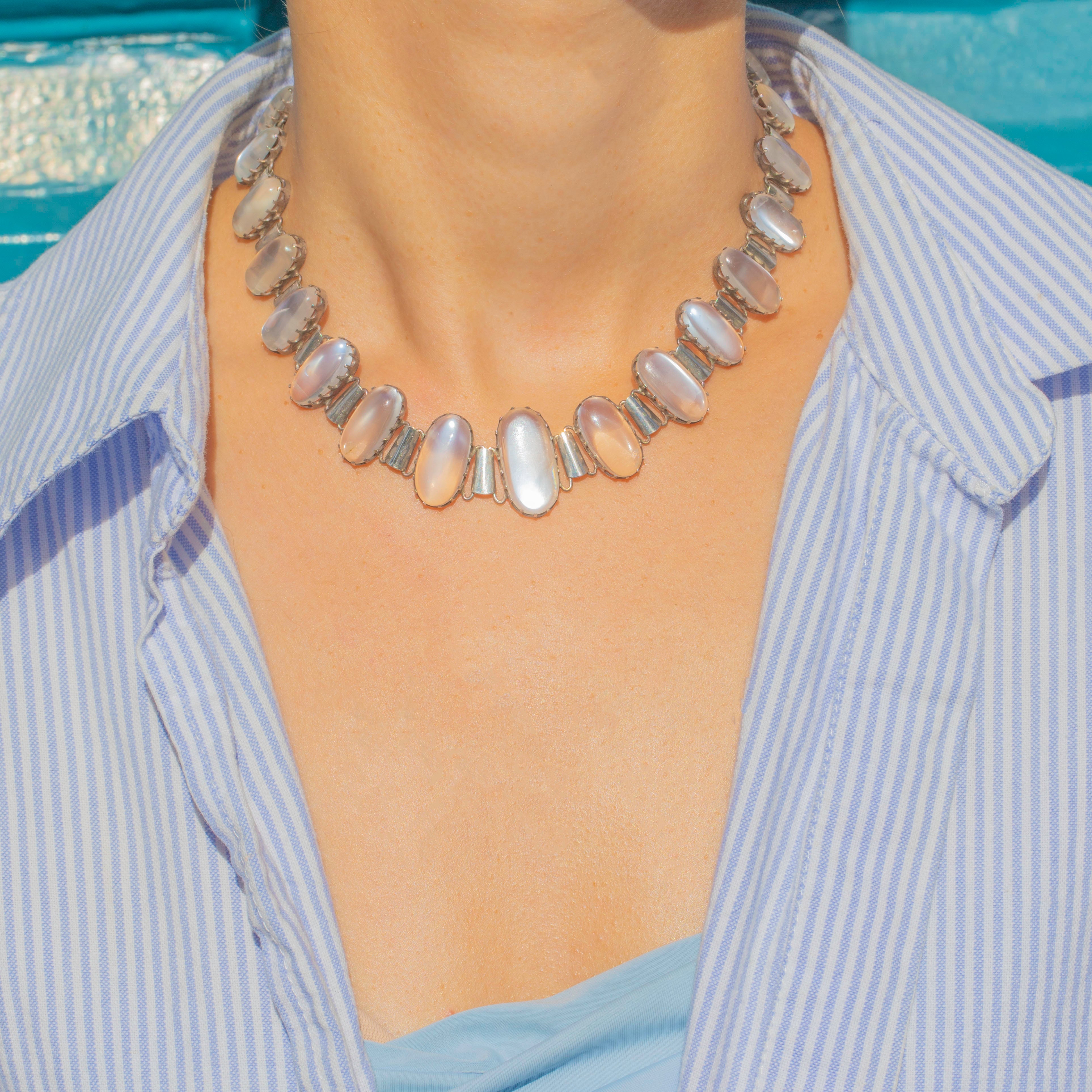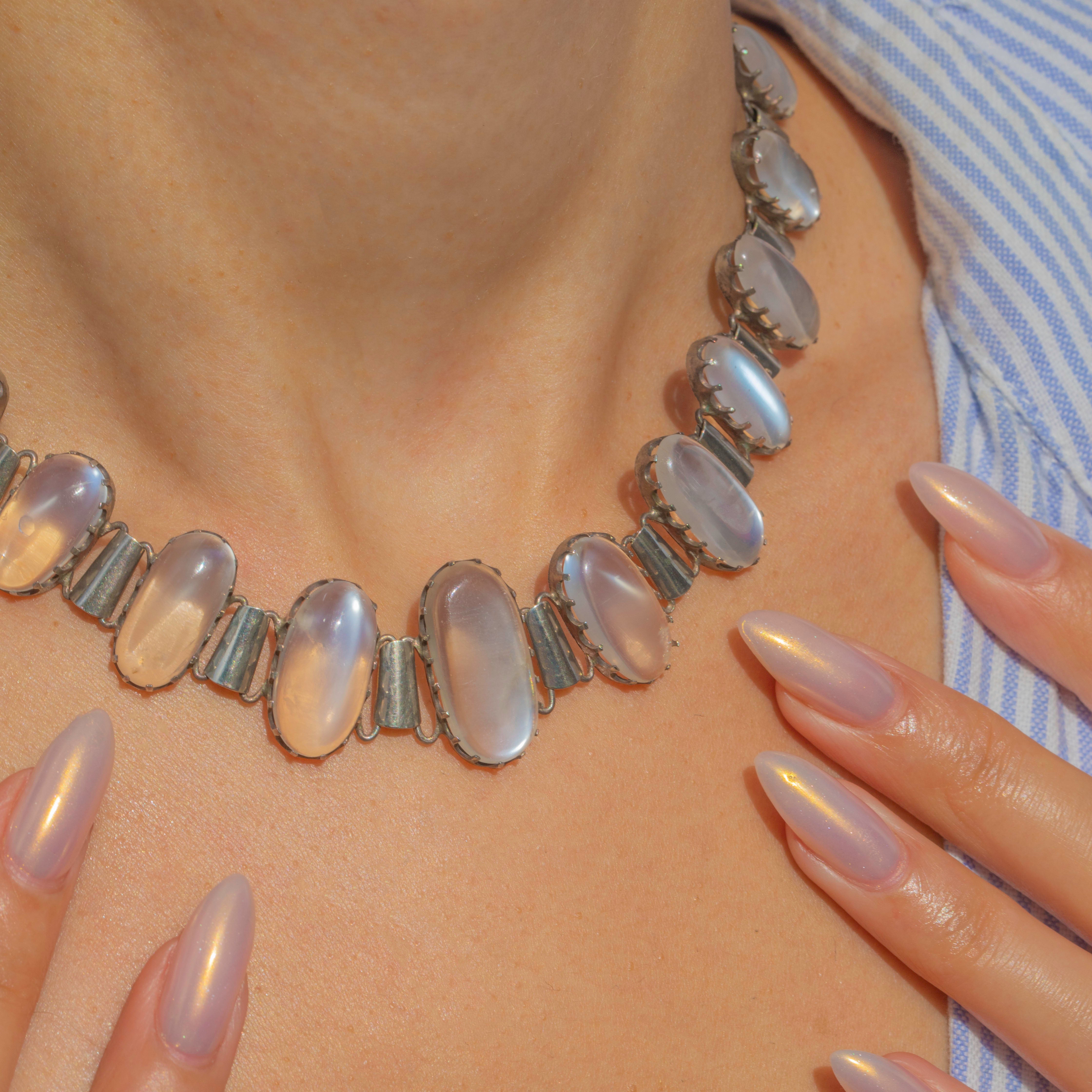A luminous Arts & Crafts necklace set with a graduated row of Moonstone cabochons, each gently domed to billow the light. The stones are displayed within stylistic Sterling Silver piecrust settings that let the soft adularescence of the Moonstones take centre stage. Wear alone to create an antique statement, or layered with modern pieces for contrast.
