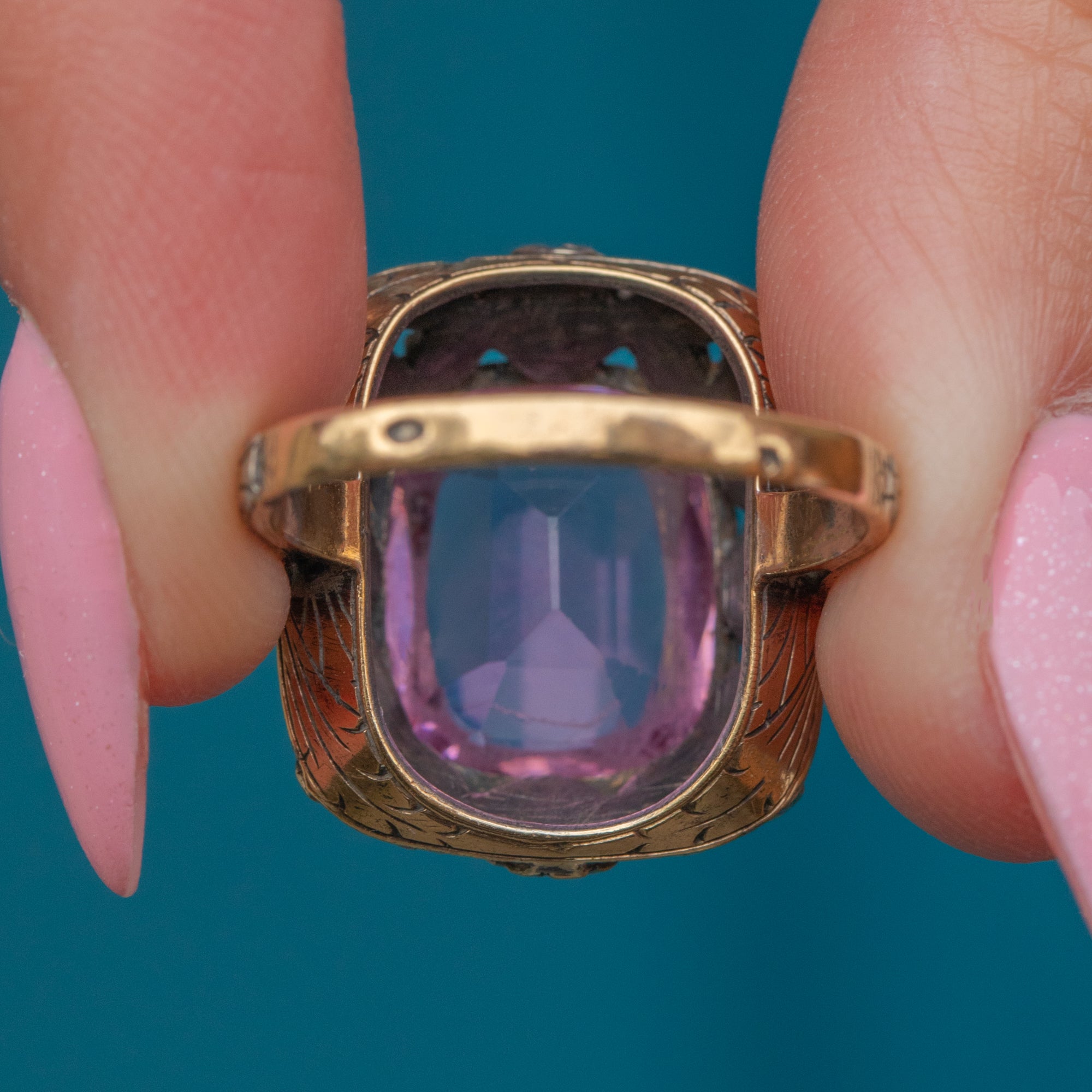 VERY GOOD: Arts & Crafts French 18ct Gold & Silver Pink Paste dress ring is in very good condition overall, with only a few light scuffs to her Paste gemstone and some gentle wear to the band. These minor signs of age are barely noticeable when worn and do nothing to take away from her beauty. She remains a striking and wearable piece, full of charm.
