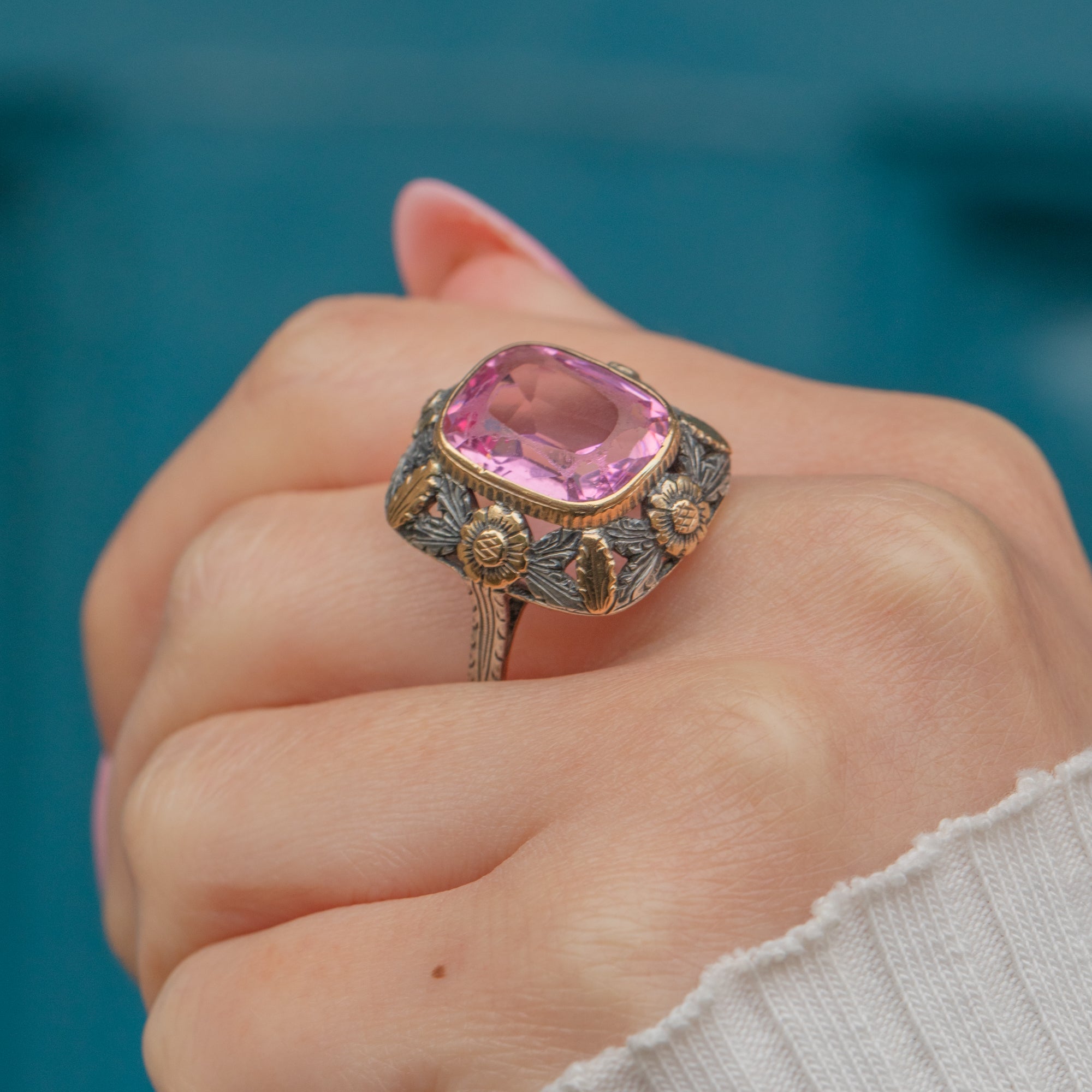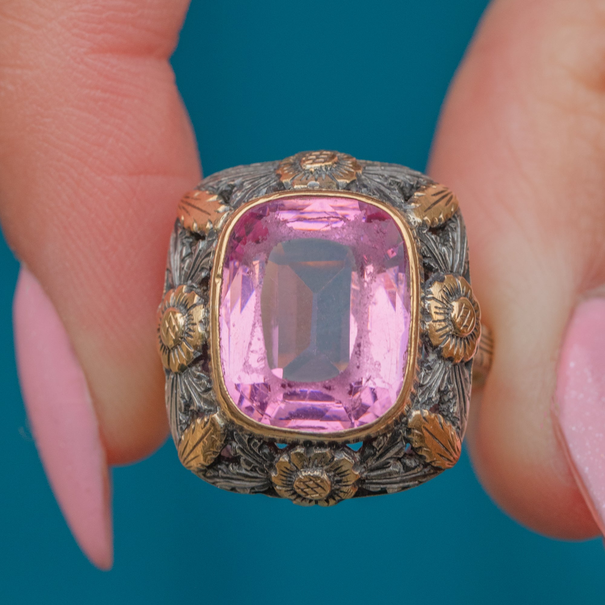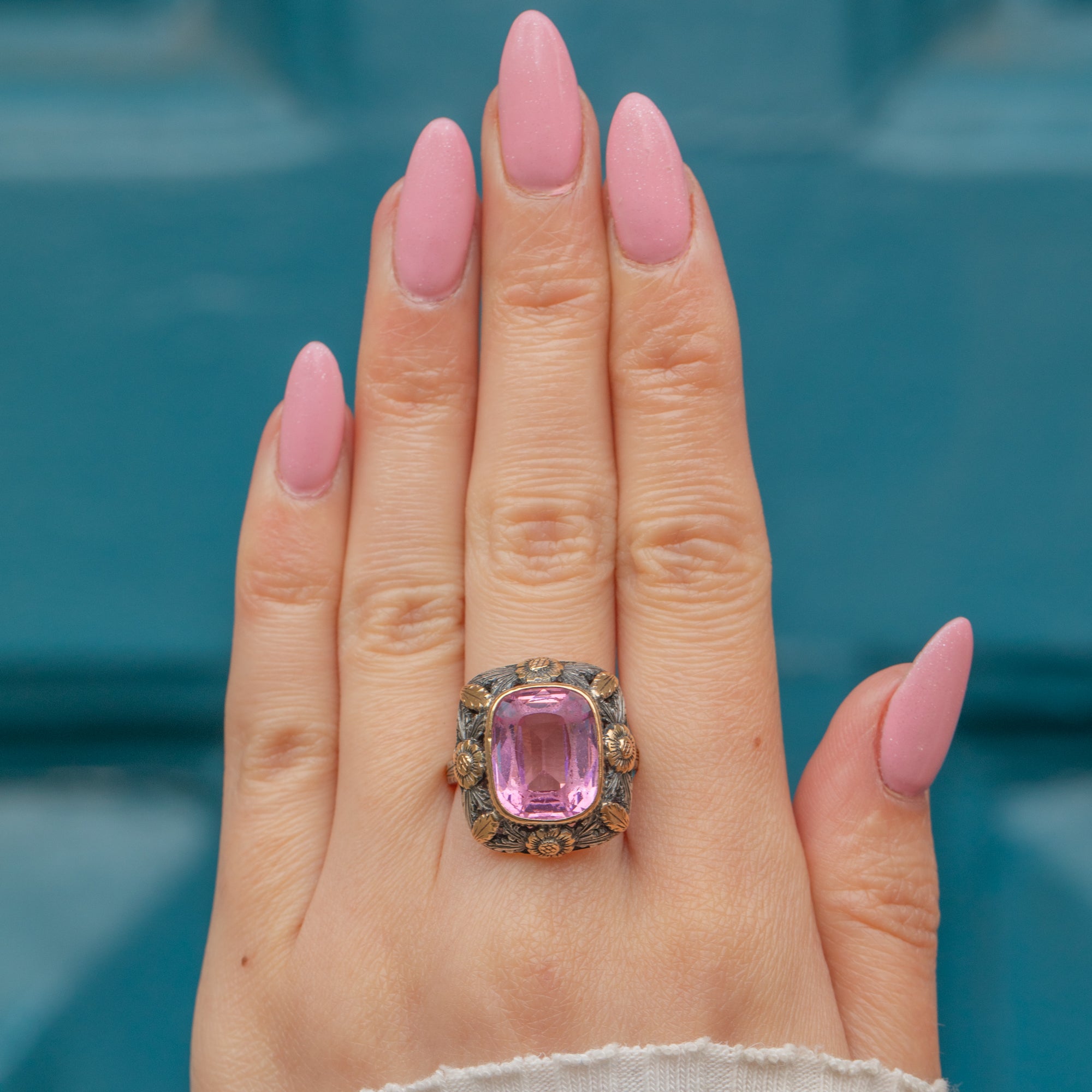 This French Arts and Crafts era ring is n eye-catching dress ring 18ct Gold and Silver, with a delectable Pink Paste centre. Crafted with a combination of rich, saturated 18ct Gold and Silver with a beautifully aged patina, this ring showcases intricate golden floral details tin the shape of gorgeous sunflowers and delicate Silver leaf accents, creating a standout piece.
