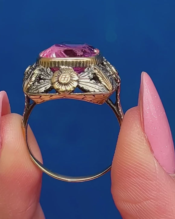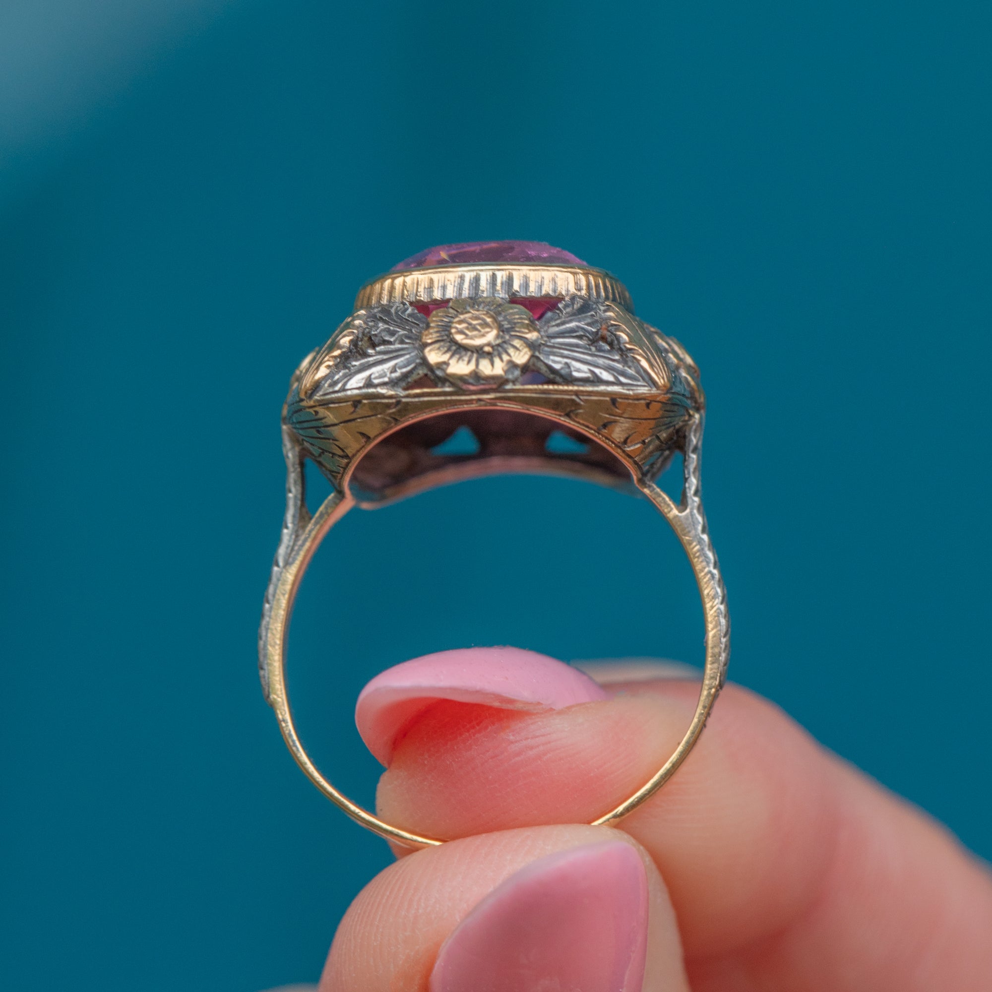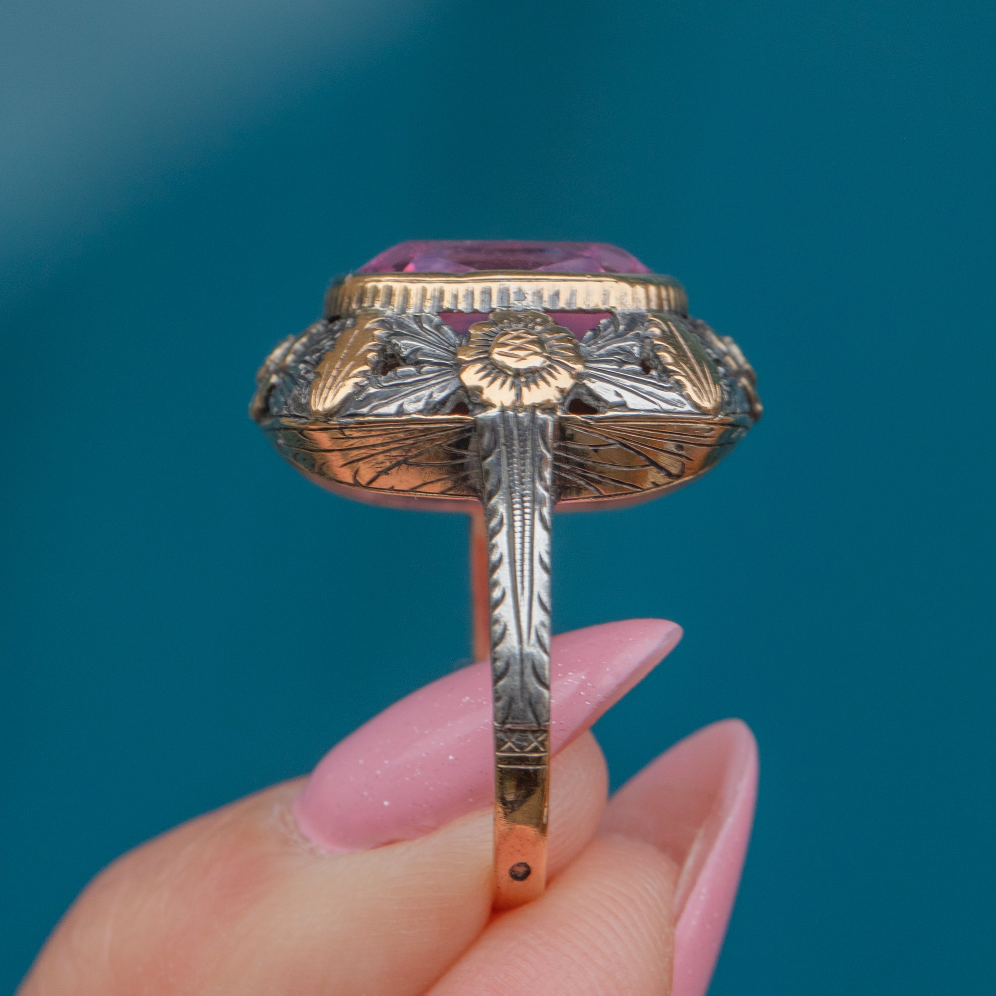 This French Arts and Crafts era ring is n eye-catching dress ring 18ct Gold and Silver, with a delectable Pink Paste centre. Crafted with a combination of rich, saturated 18ct Gold and Silver with a beautifully aged patina, this ring showcases intricate golden floral details tin the shape of gorgeous sunflowers and delicate Silver leaf accents, creating a standout piece.