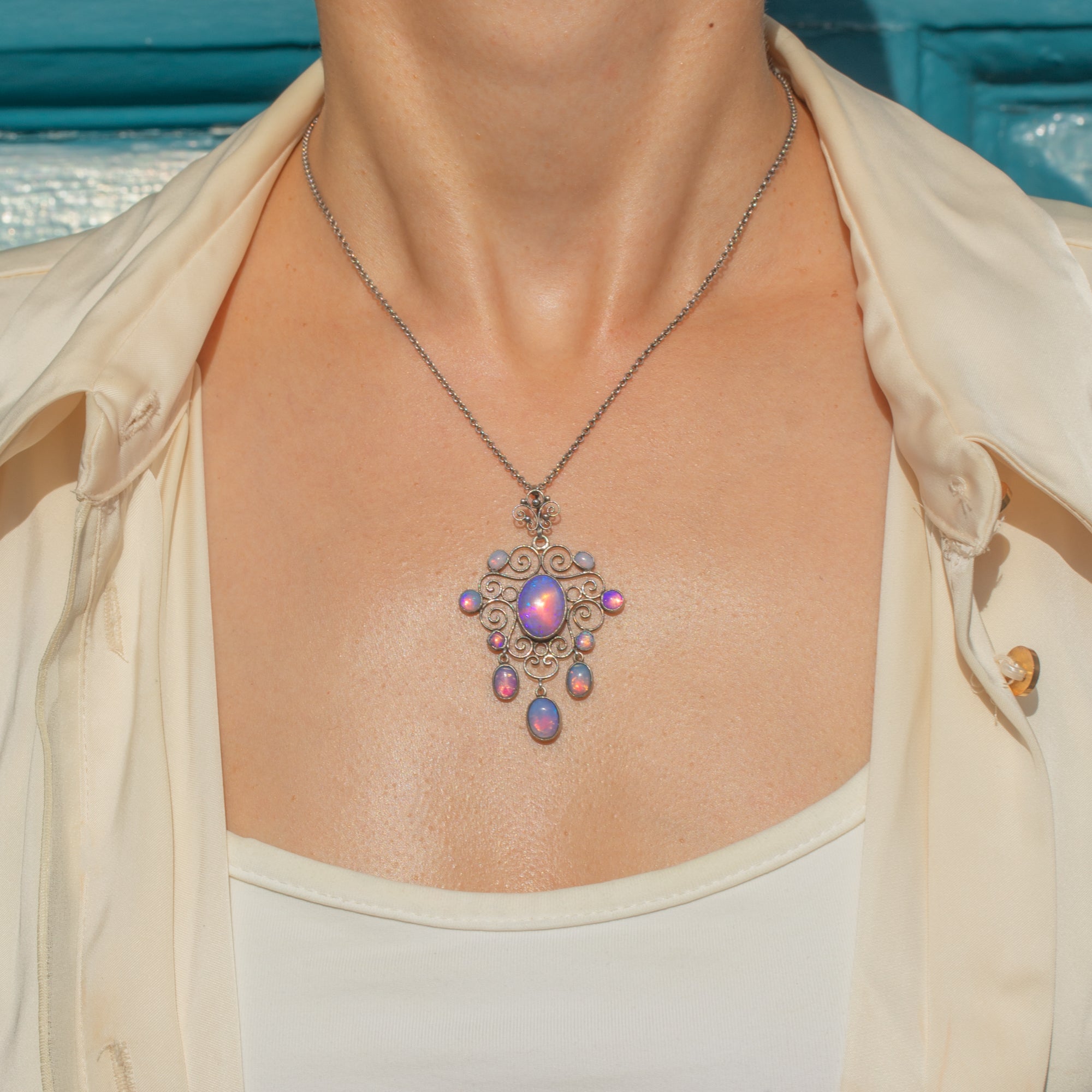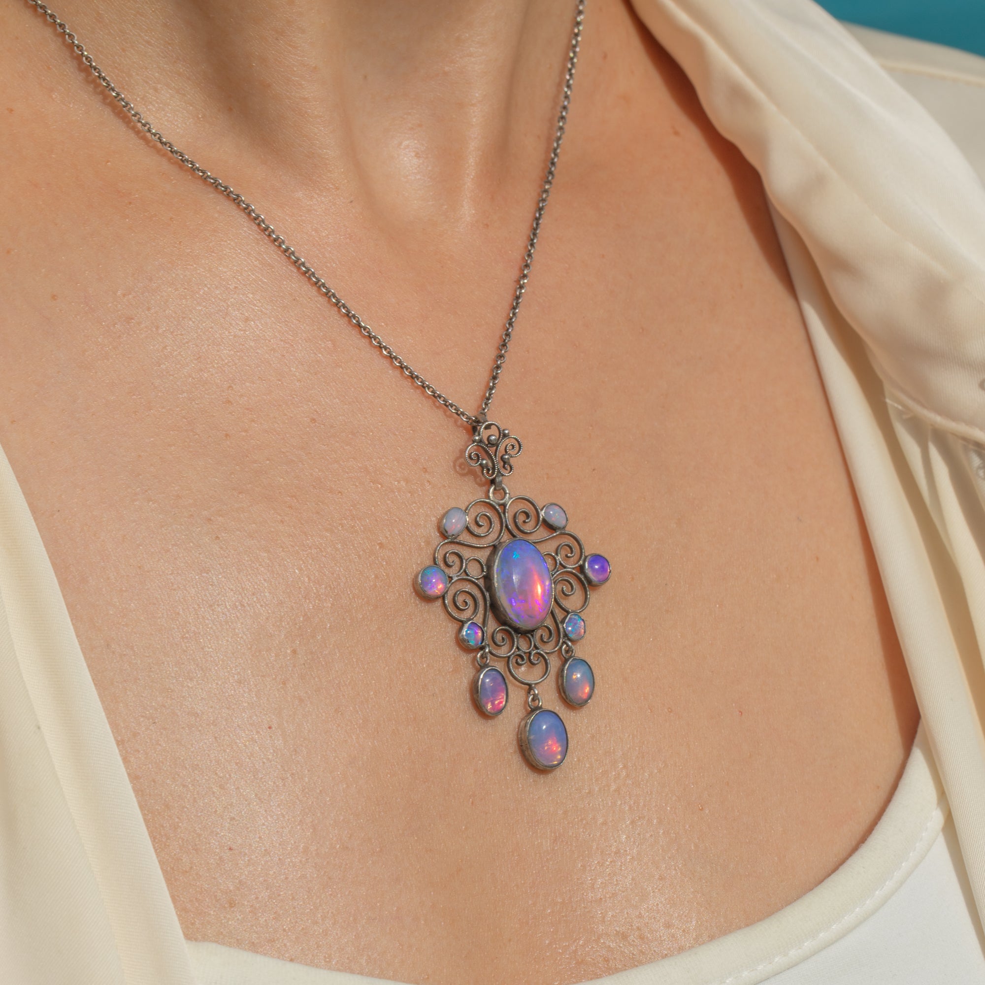 This Arts & Crafts pendant is set with captivating “Dragonsbreath” Glass cabochons, glowing with pink tones and a characteristic iridescent flash. The large 10 x 13mm central stone is framed by an ornate arrangement of smaller pink glass gems, graduating in size for a harmonious, handcrafted look.