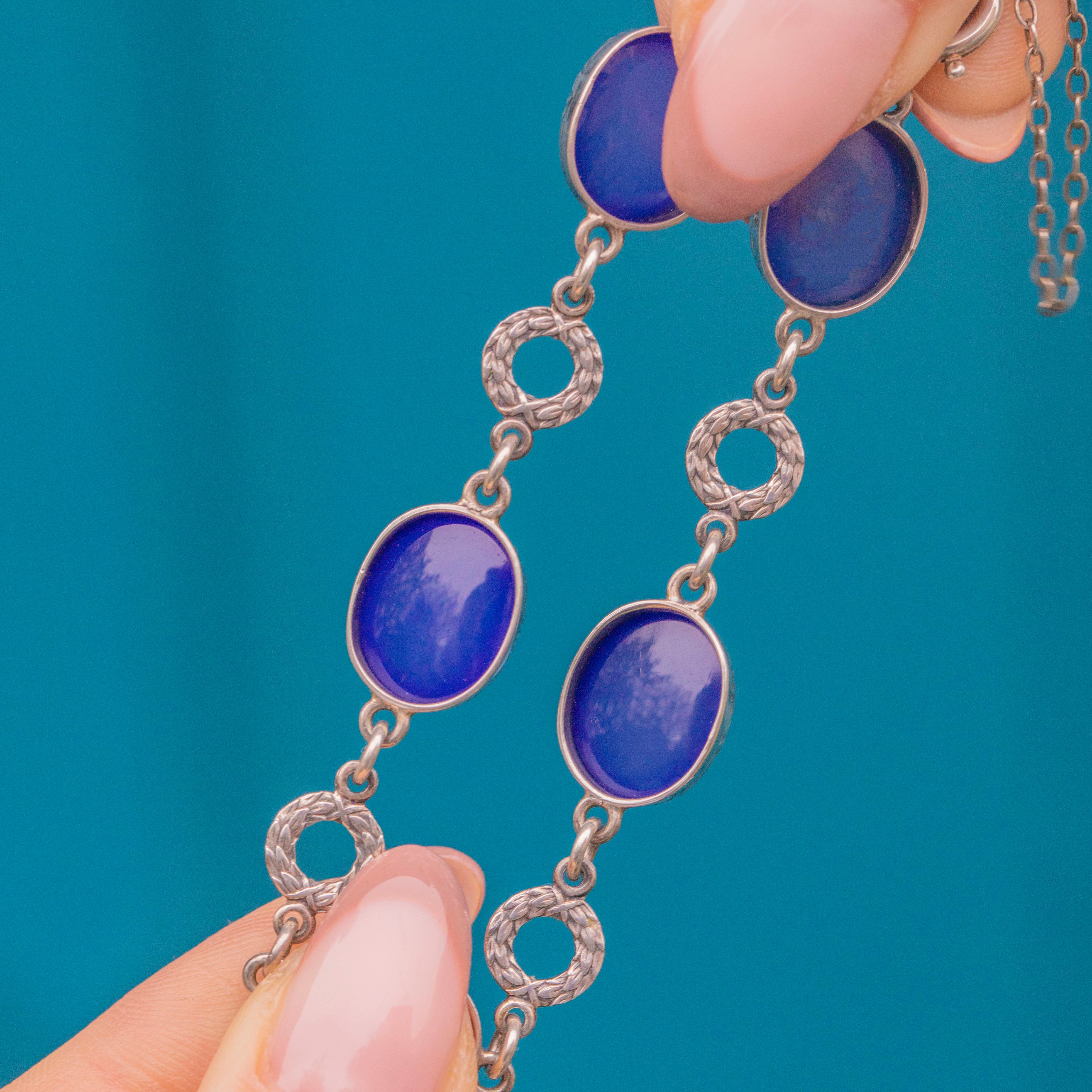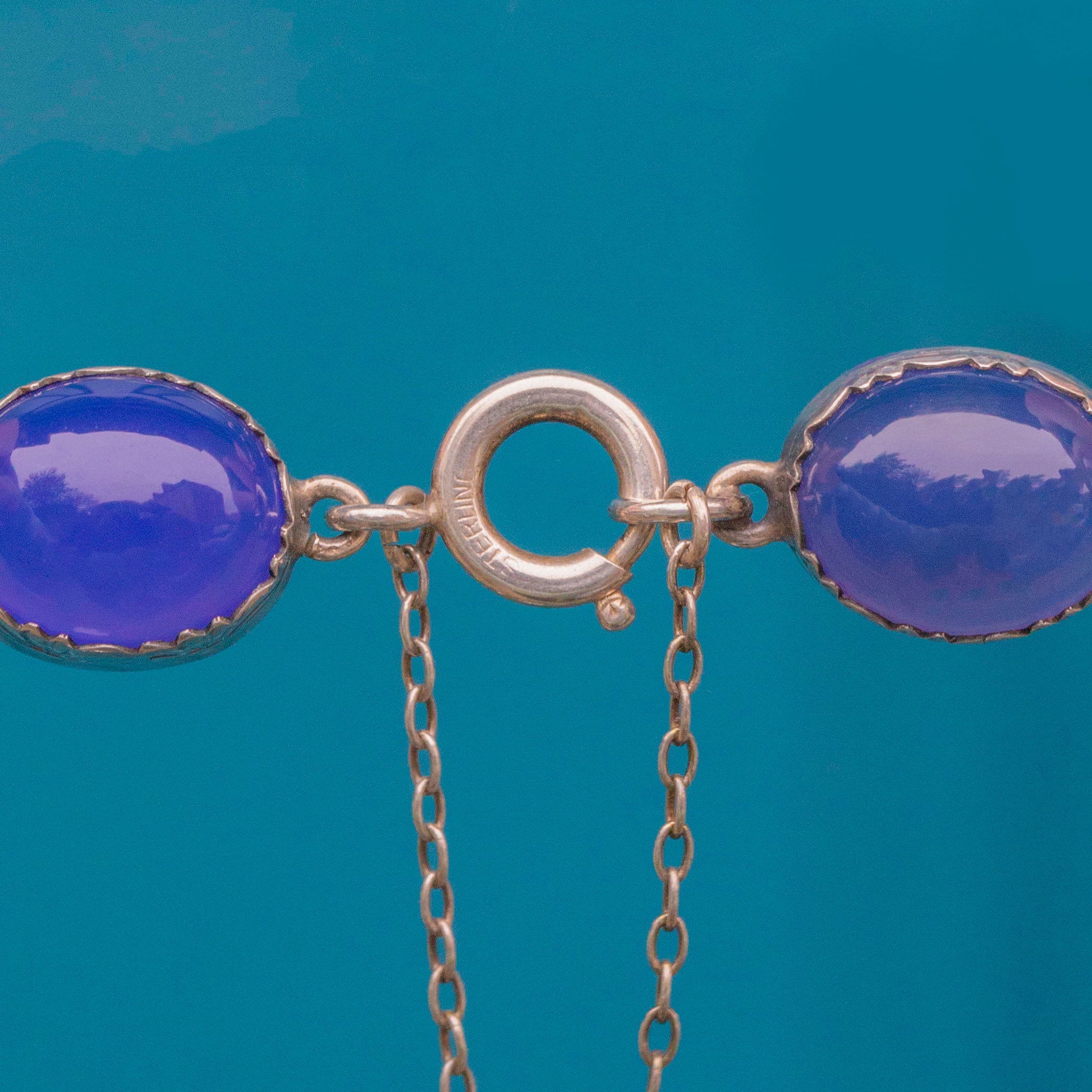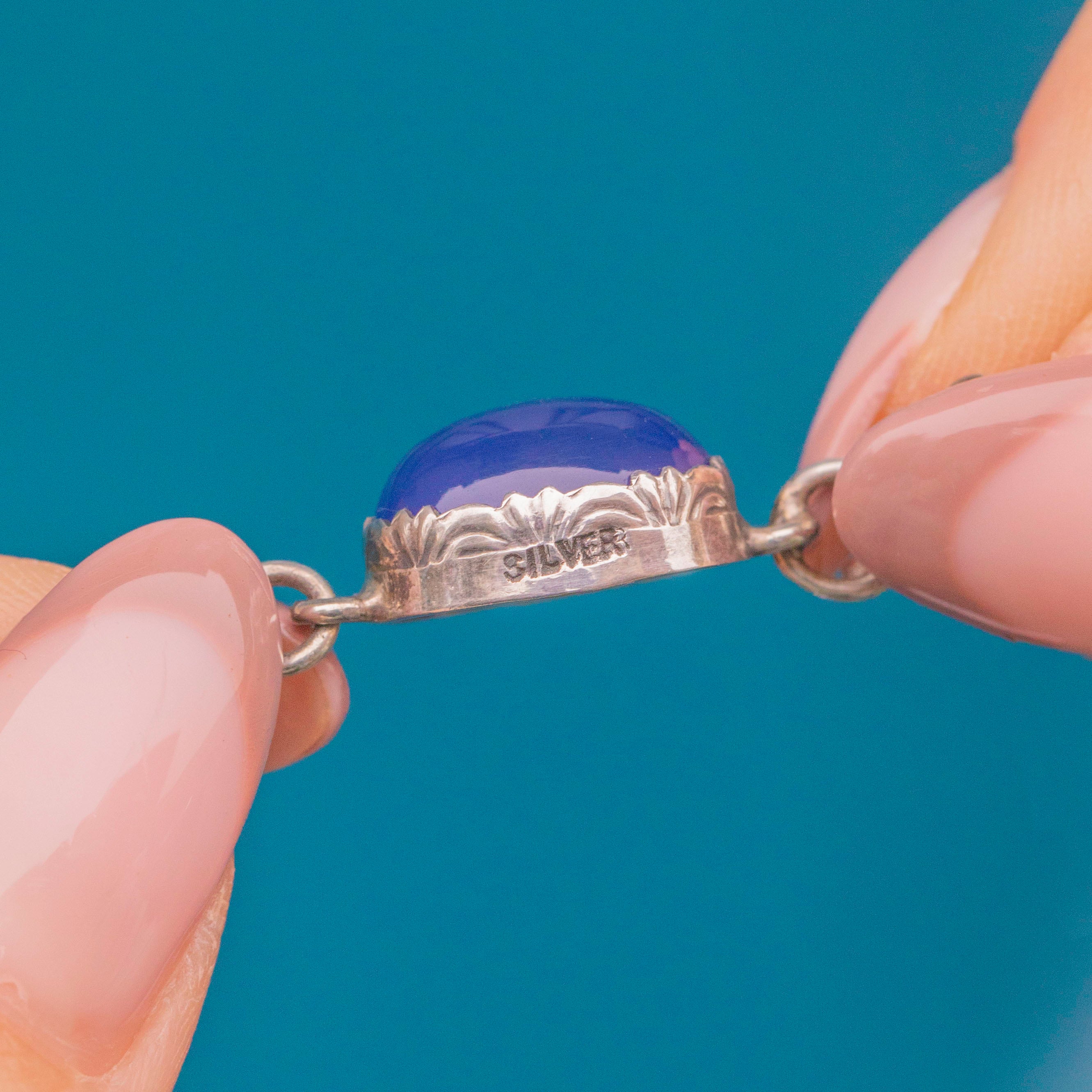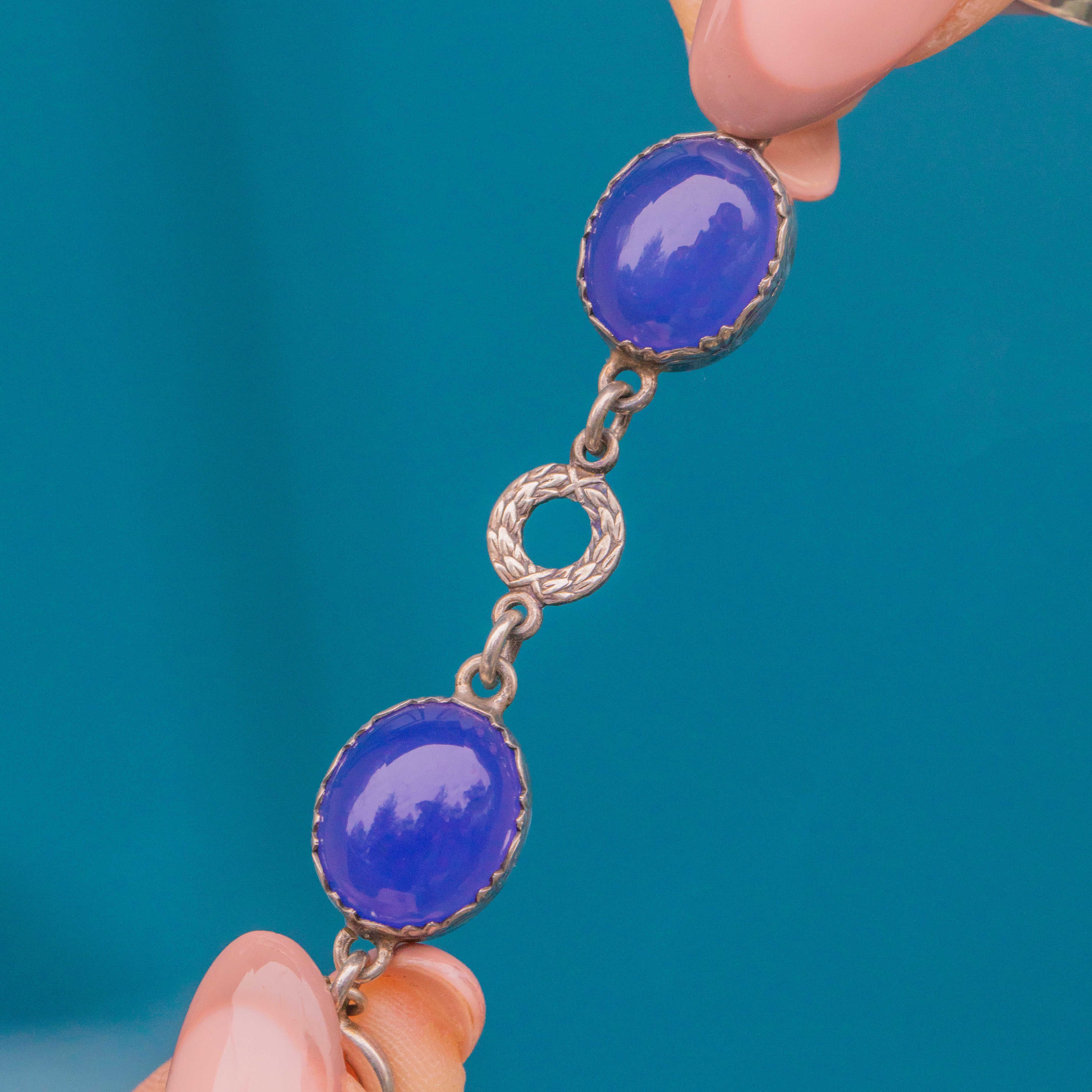 EXCELLENT. This Arts & Crafts Silver blue Chalcedony bracelet is in excellent condition! The blue Chalcedony cabochons sit securely within their settings, possess a beautifully glossy finish, and have no damage to note. The Sterling Silver has accrued an admirable patina and each link is firmly connected to one another. With a bolt-ring in perfect working condition, this antique Chalcedony bracelet can be worn with the utmost confidence!