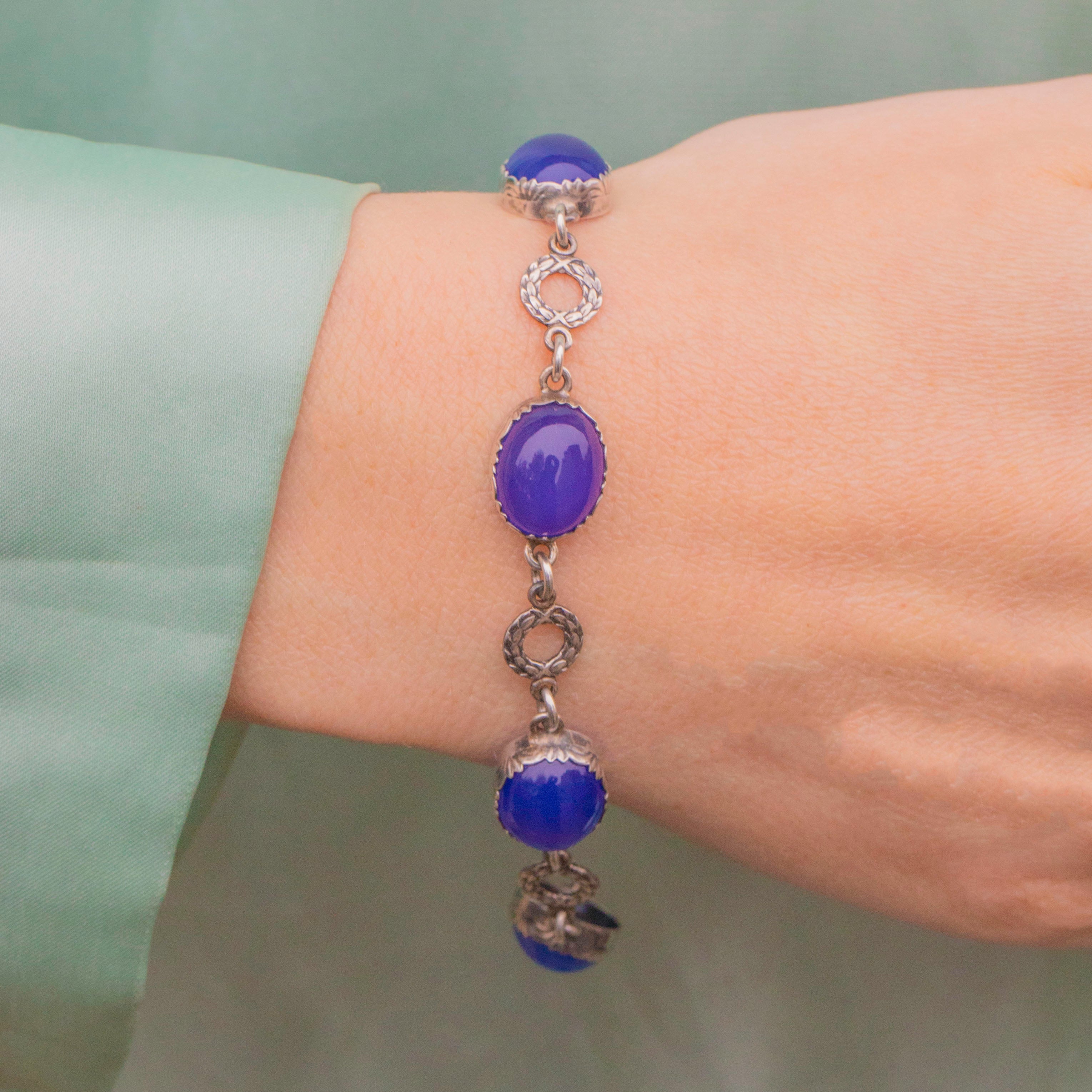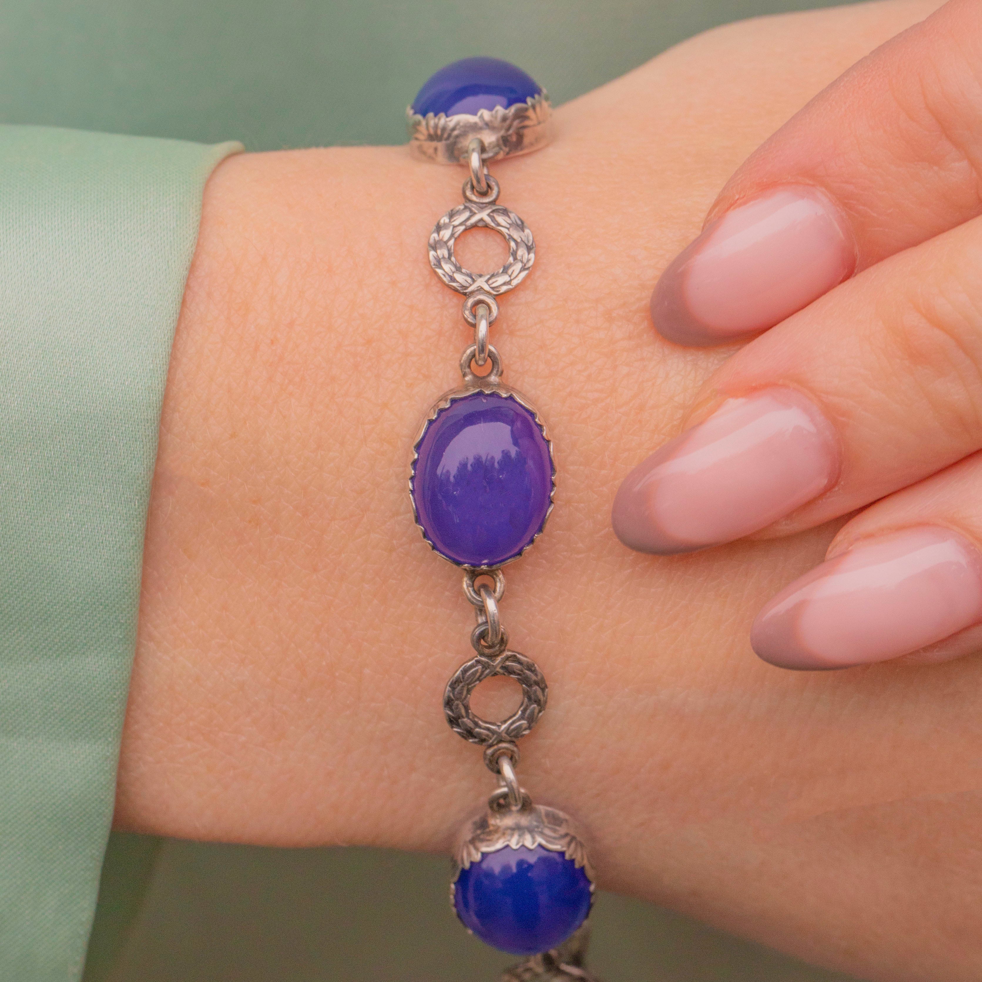 Foliate wreaths crafted from Sterling Silver bind this Arts and Crafts bracelet together to form her 7.5 inch length. Created during one of the most prevalent eras for developing organic and artistic designs, this Silver Chalcedony bracelet is bursting with intricate detail.