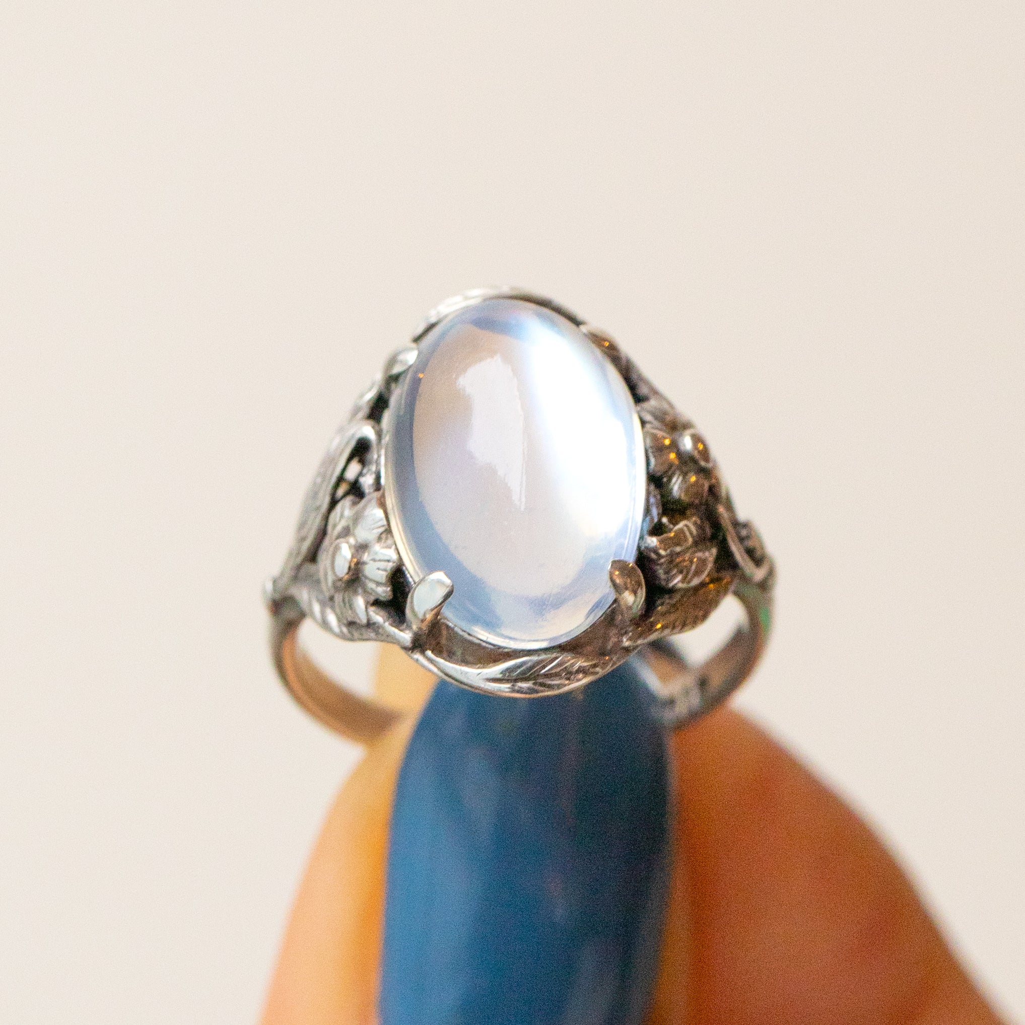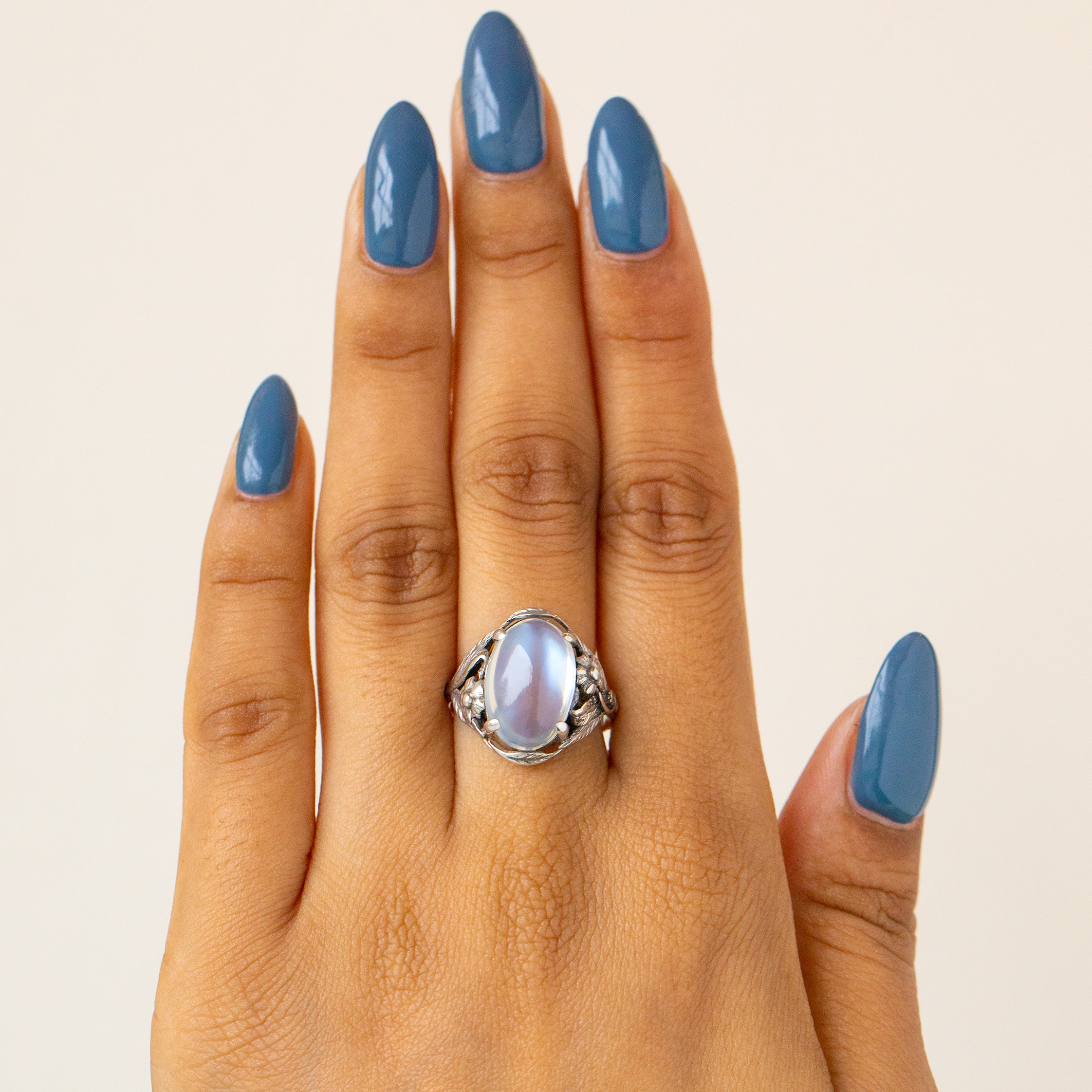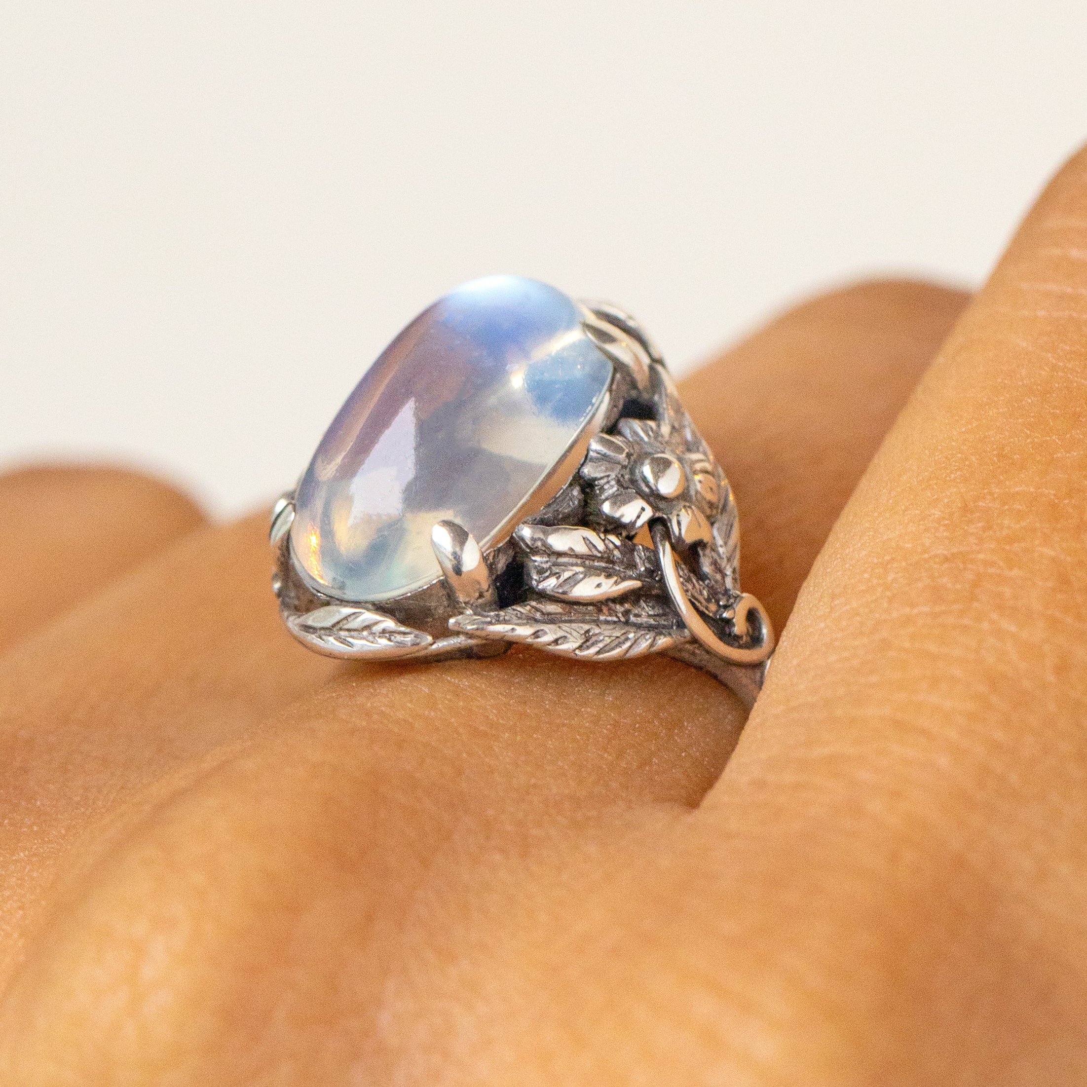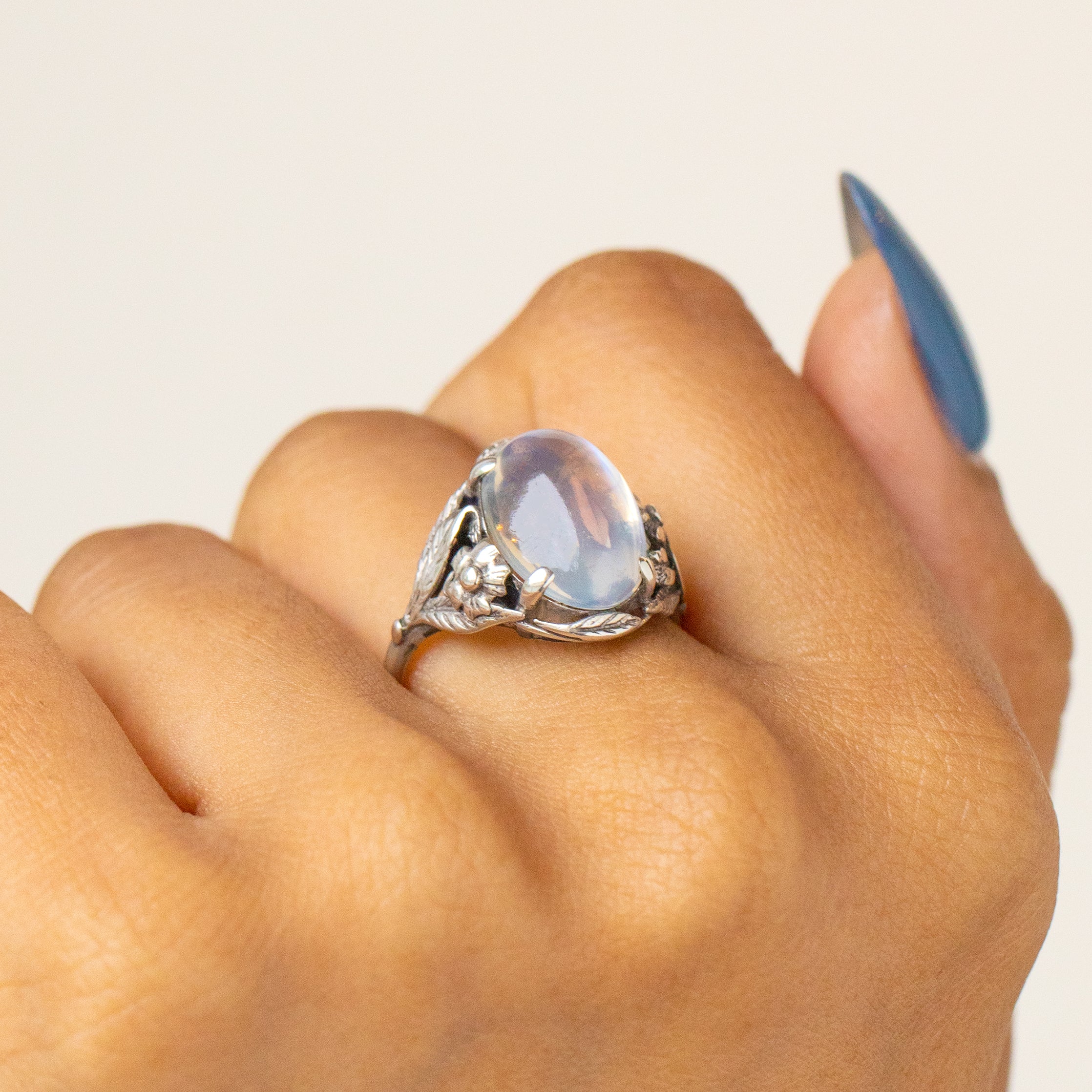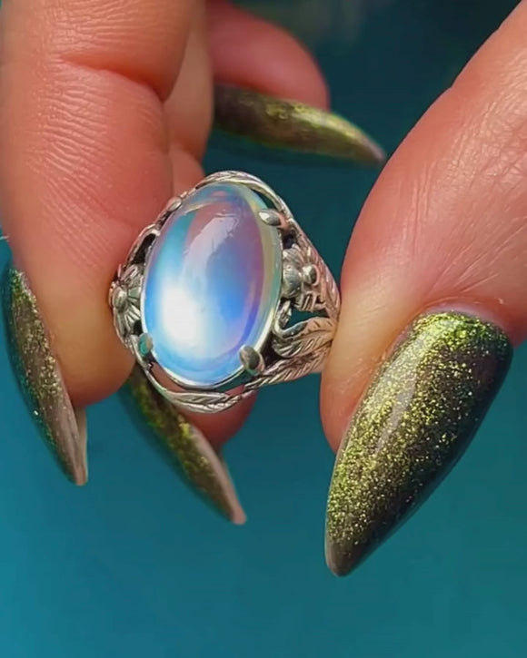 This antique ring features a 3.35ct Moonstone with a soft adularescence billowing from every angle, embraced by whimsical leaves entwined with dainty flowers crafted entirely from Sterling Silver. With such a charismatic and feminine design, this antique Moonstone ring encapsulates the organic beauty of the Arts and Crafts era.