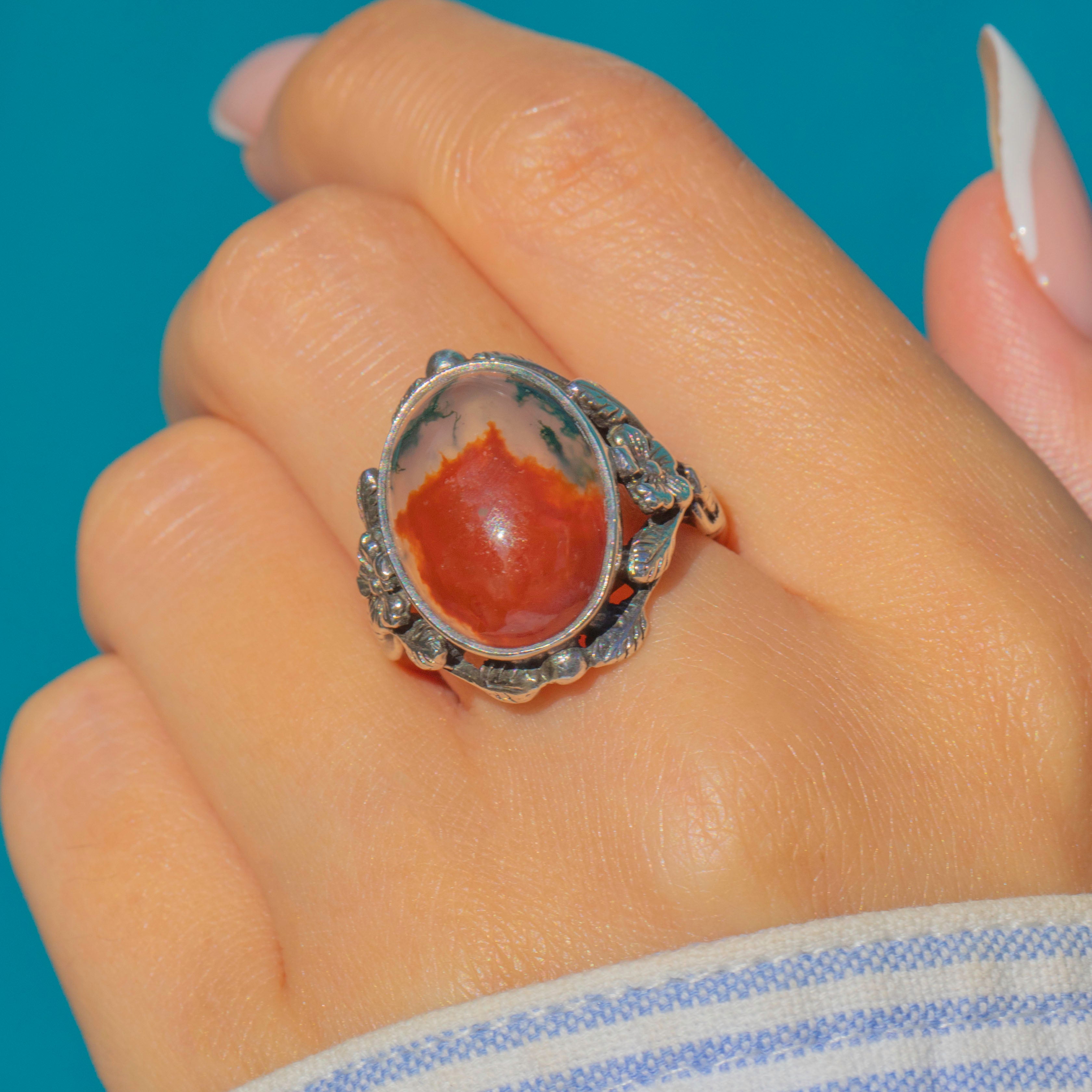 EXCELLENT. The Moss Agate is free from chips or scratches, and the Silver band shows no signs of wear. The patina is deep and attractive, complementing the natural tones of the gemstone beautifully.