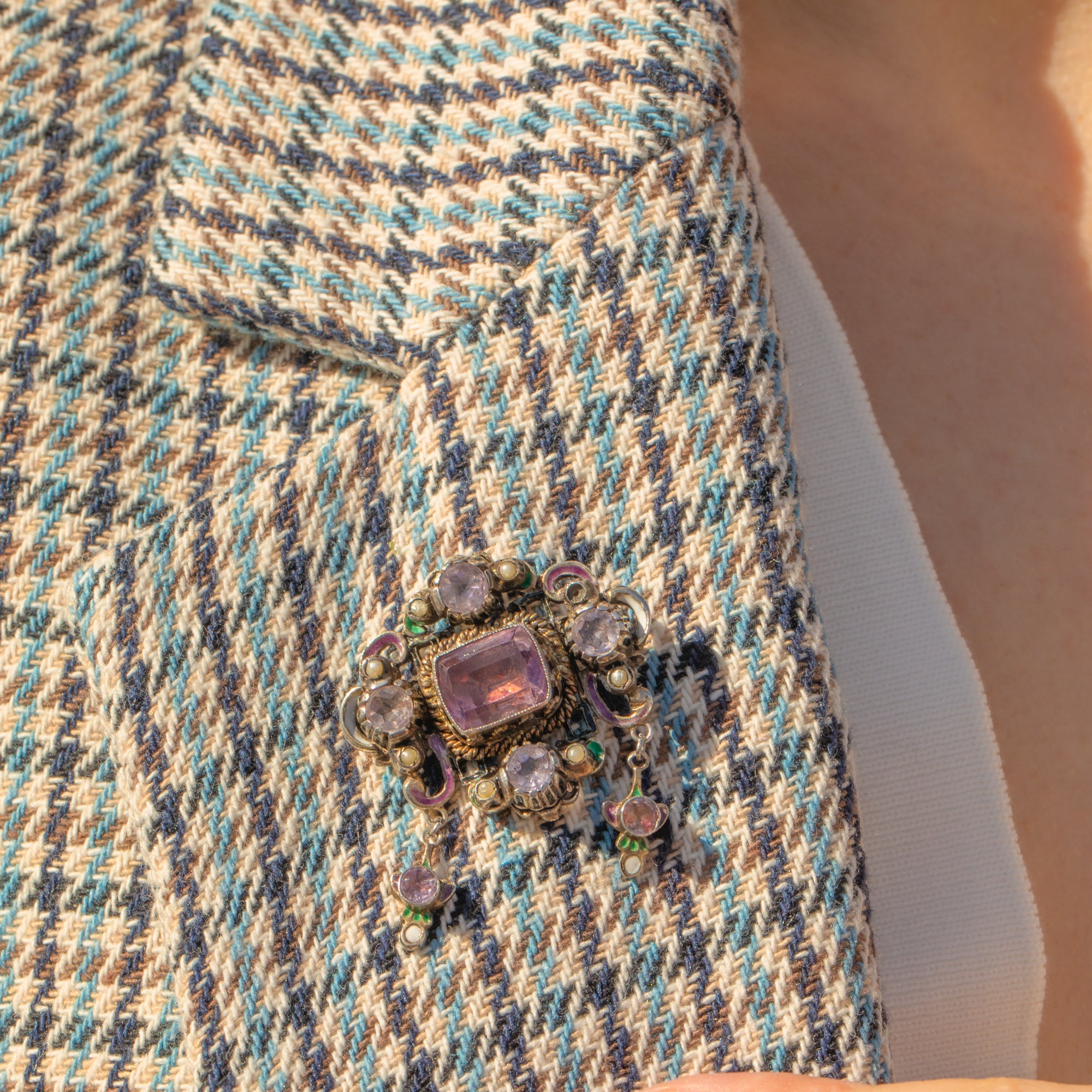 This Austro Hungarian Enamel Amethyst Pearl brooch is a wonderful and beguiling piece of 19th-century jewellery! Inlaid with regal foiled Amethysts, lustrous Pearls and accented with Enamel, this spectacular Gothic pendant will instantly transform you into a divine sorceress!