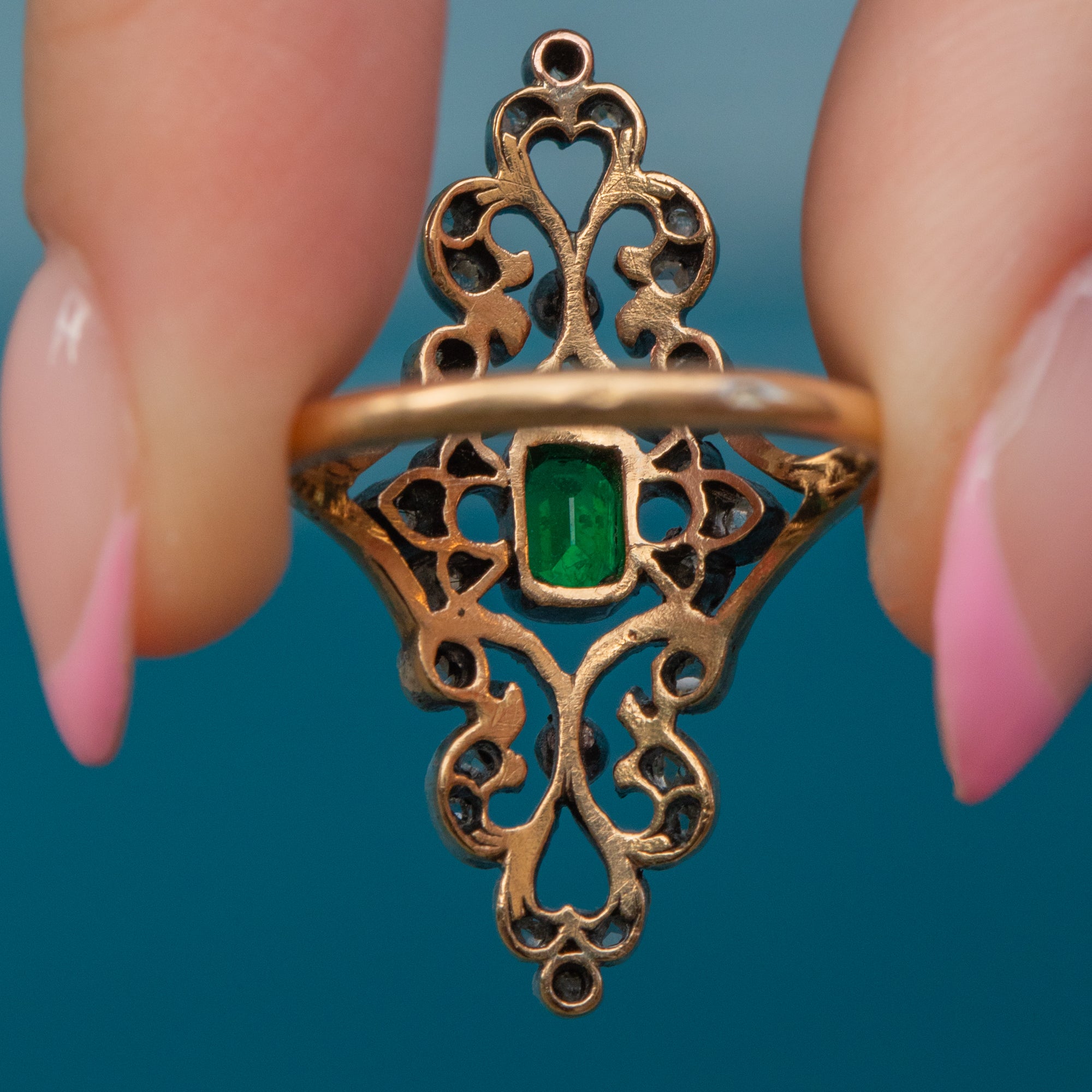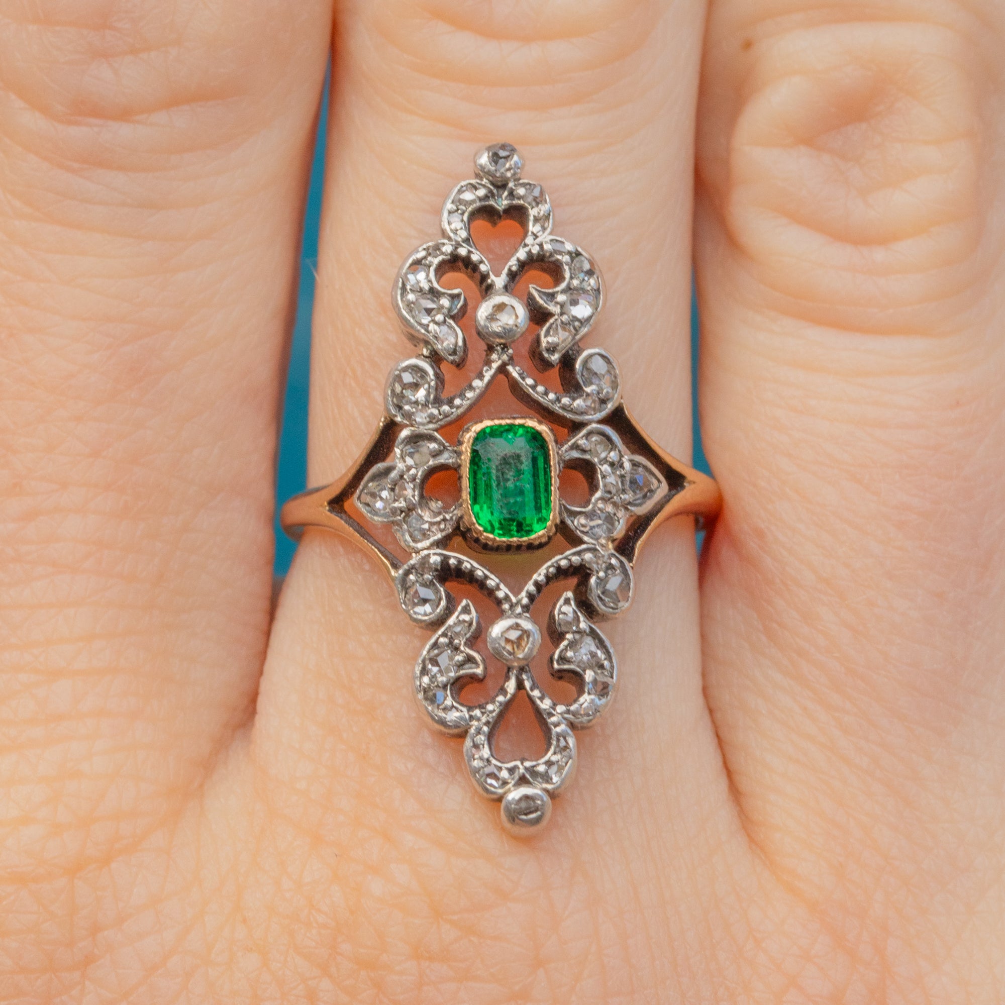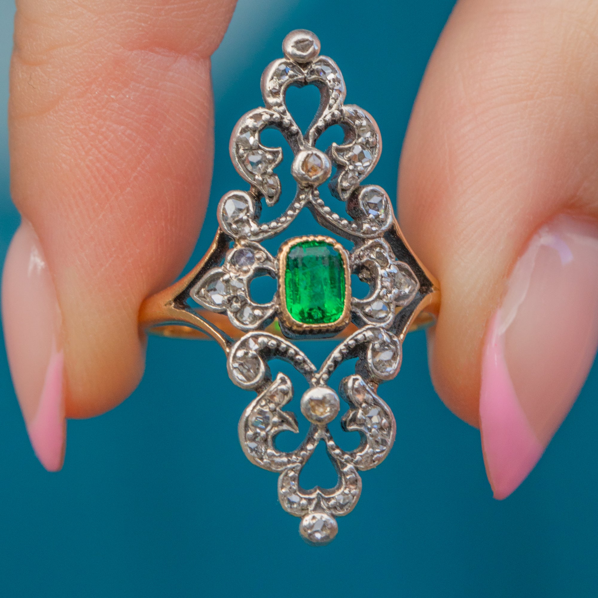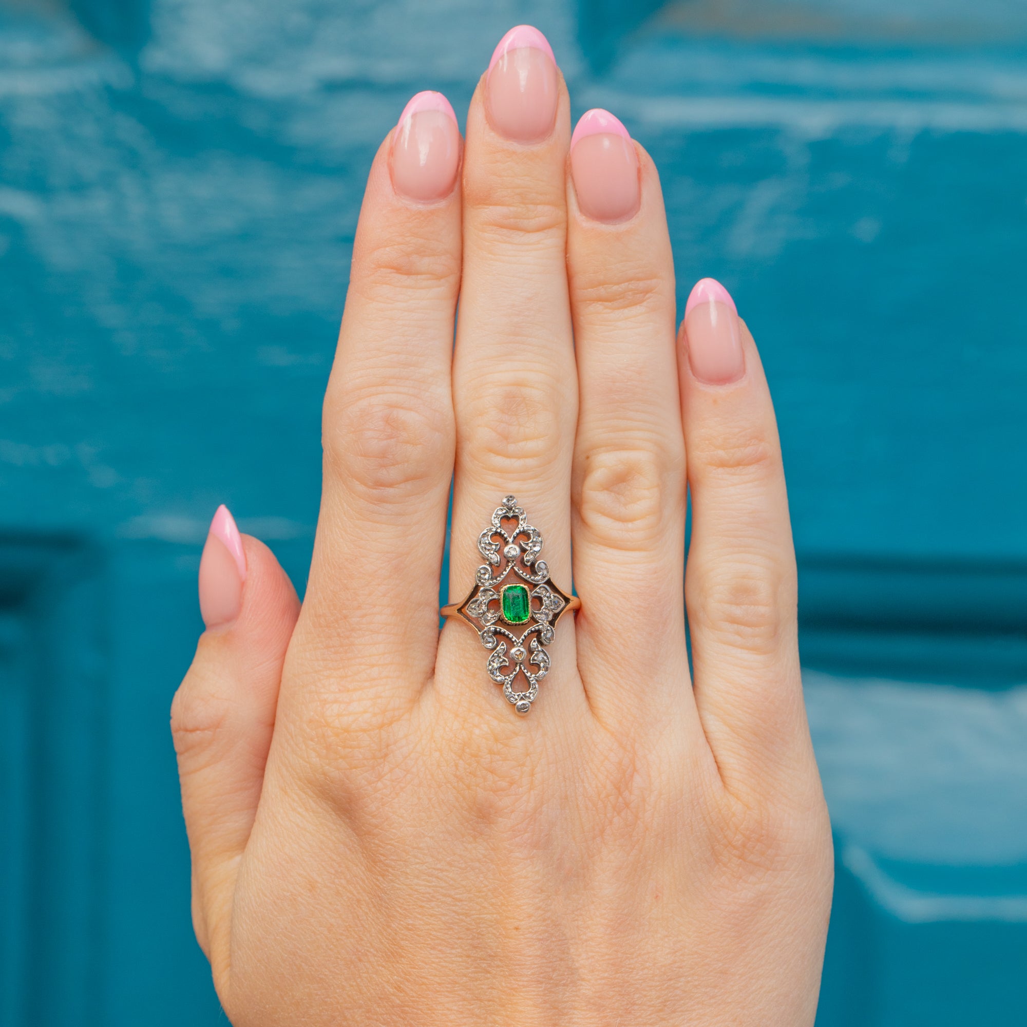 Bring instant grandeur to your hand with this Belle Époque 18ct Gold Diamond and Paste dress ring! The term Belle Époque translates to 'Beautiful era' and this dress ring certainly fits the bill, inlaid with an Emerald green Paste at her centre, with ornate Silver work embellished with rose-cut Diamonds.