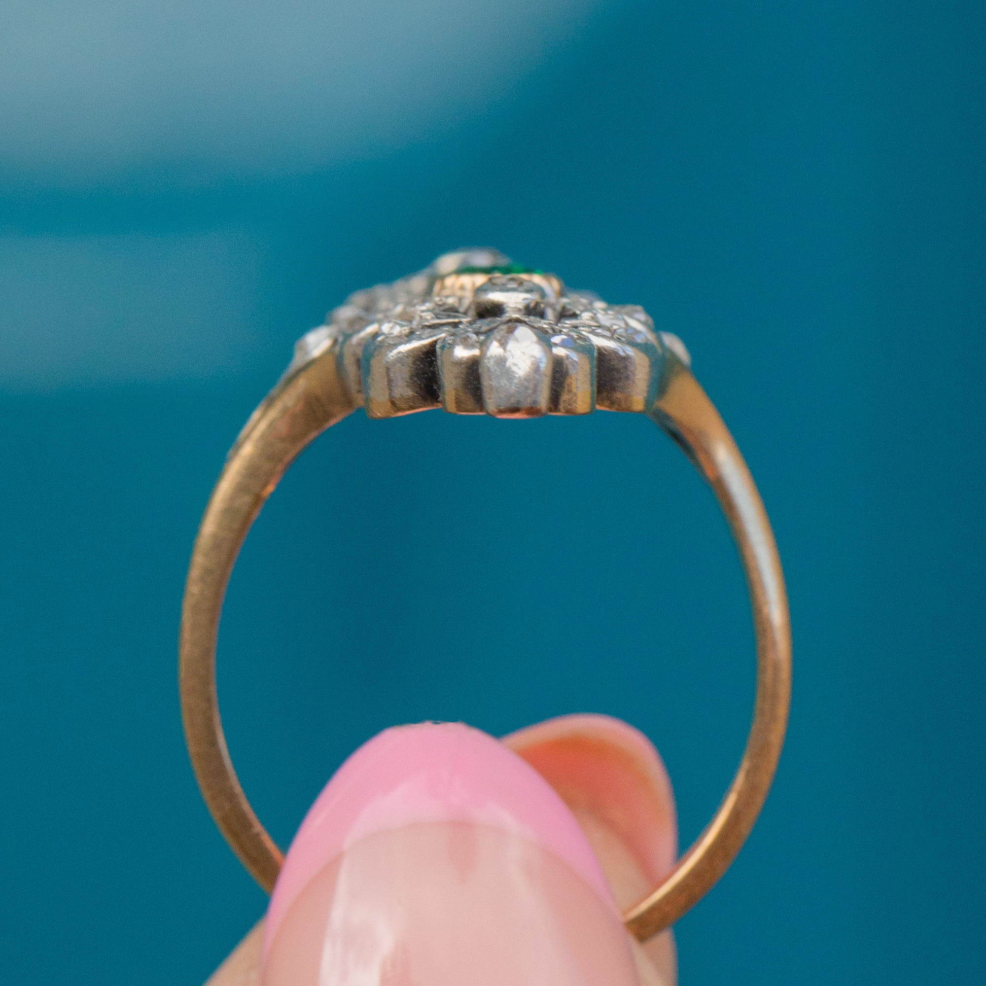 MATERIALS: Tests as 18ct Gold shank, Sterling Silver settings, Rose-Cut Diamonds, Green Paste.