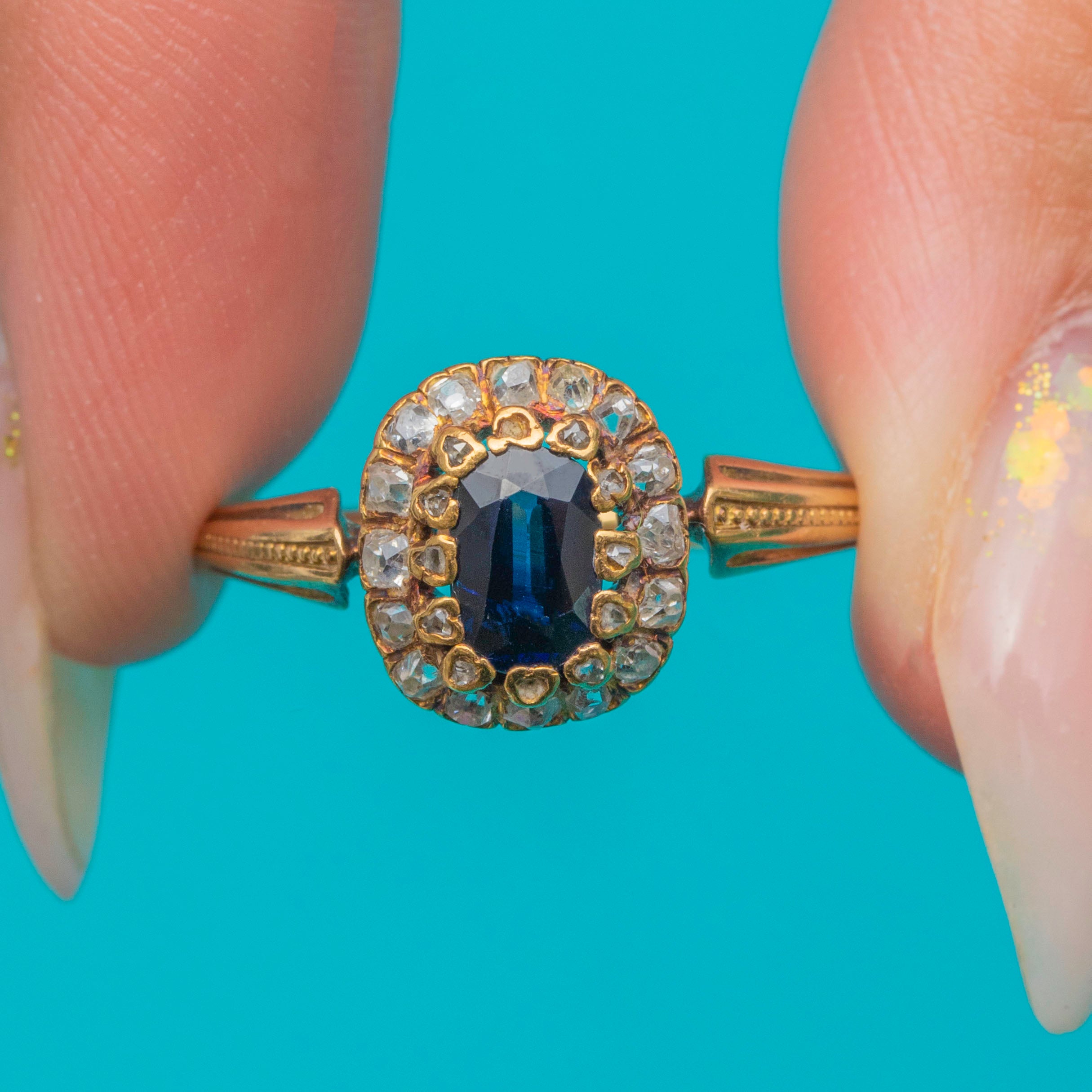 EXCELLENT: The Sapphire and Diamonds are in superb condition with no chips or damage, all securely set. The band retains its shape and strength, with a visible resize mark to the back, which does not detract from wear or beauty.