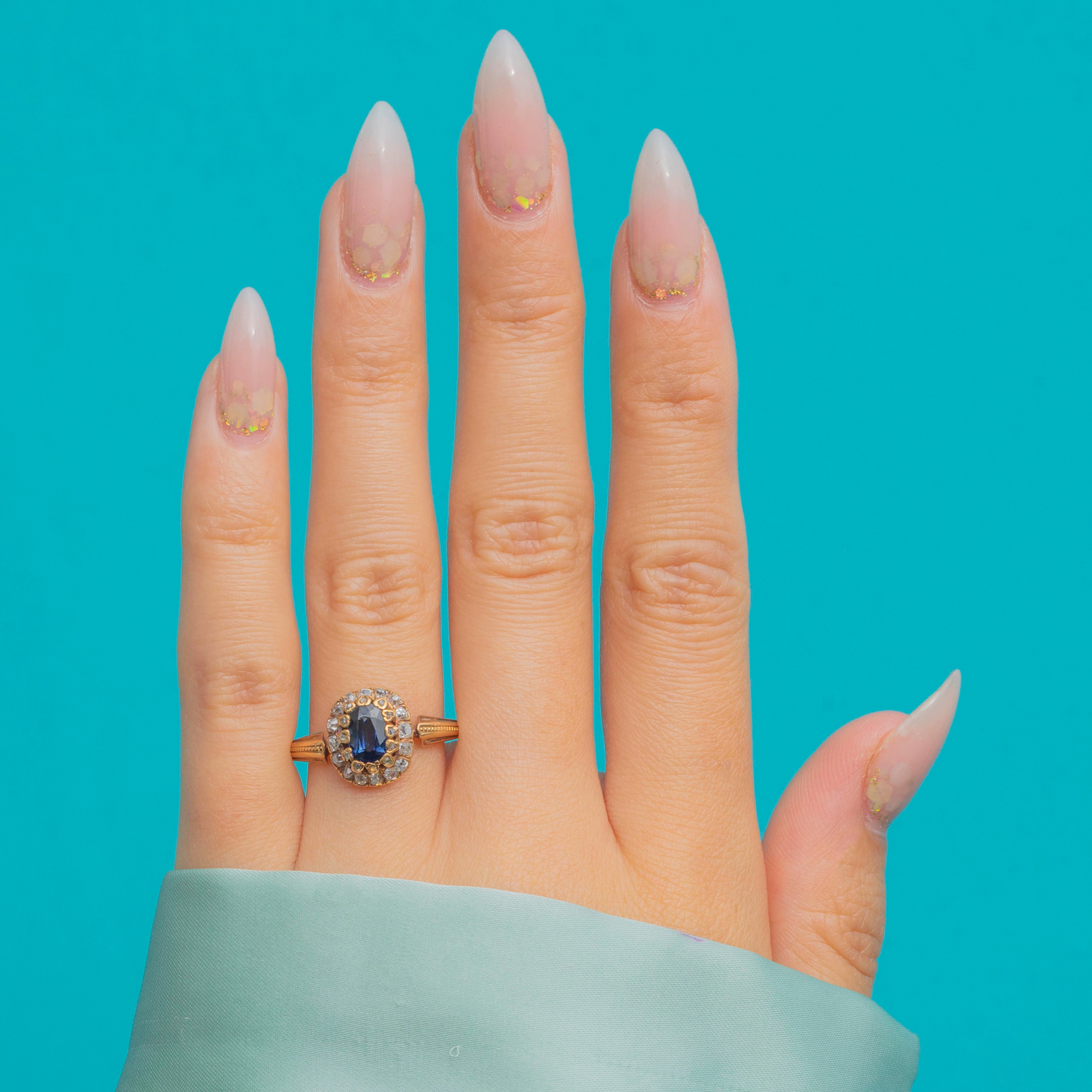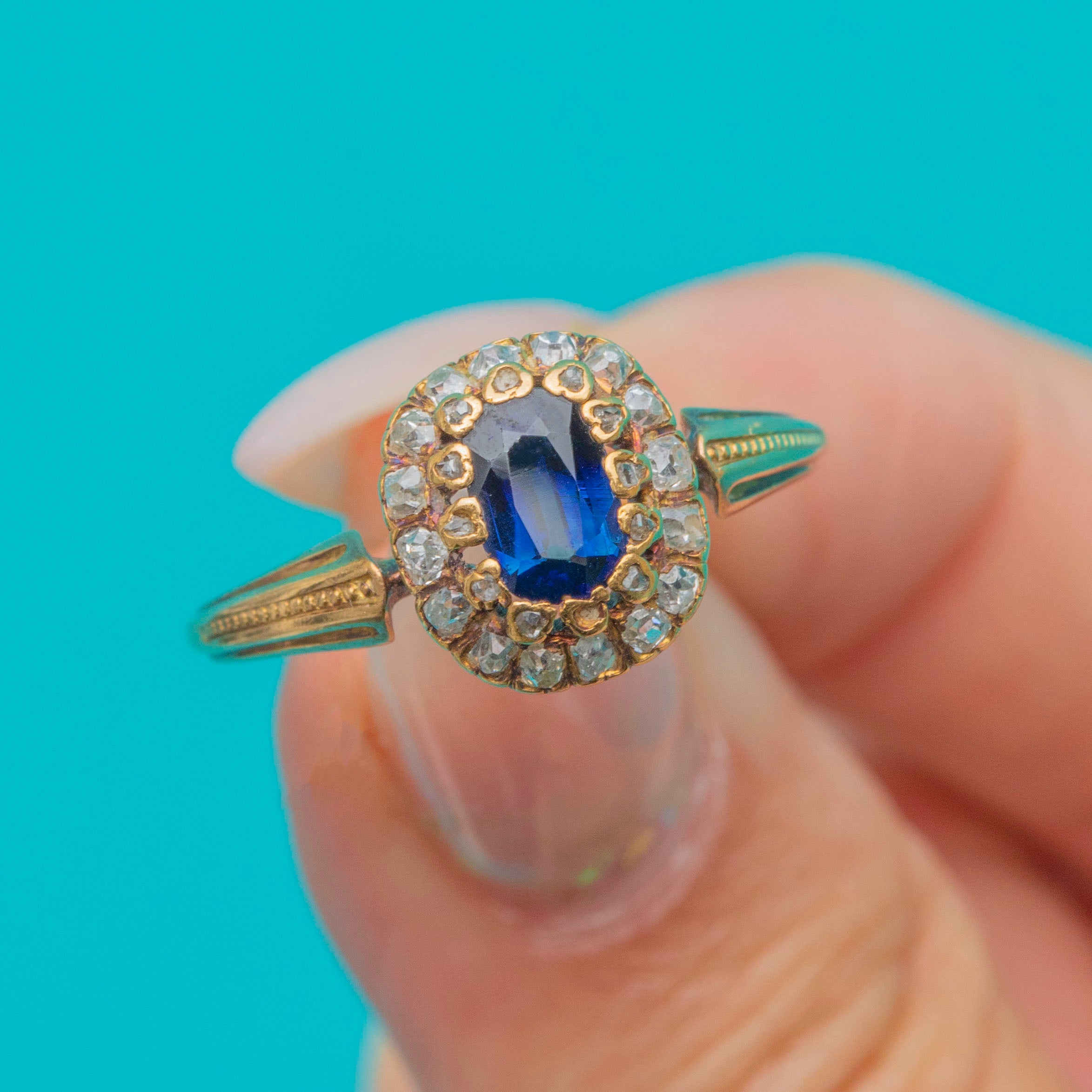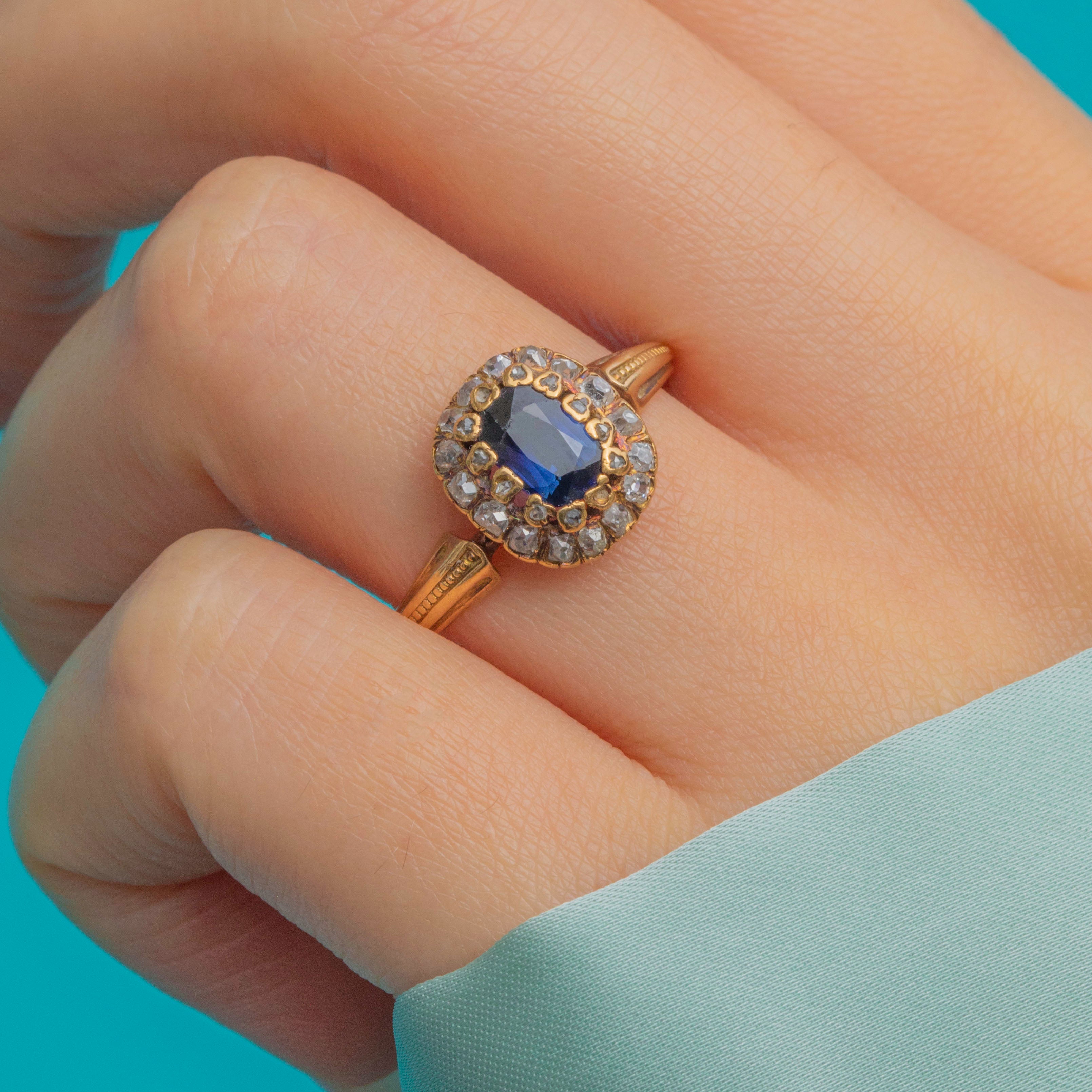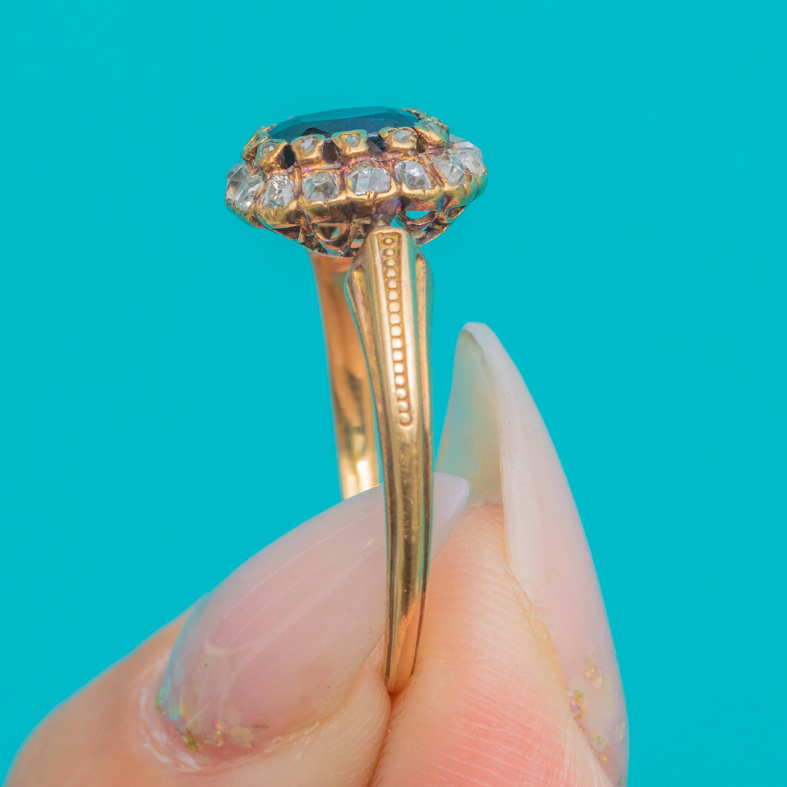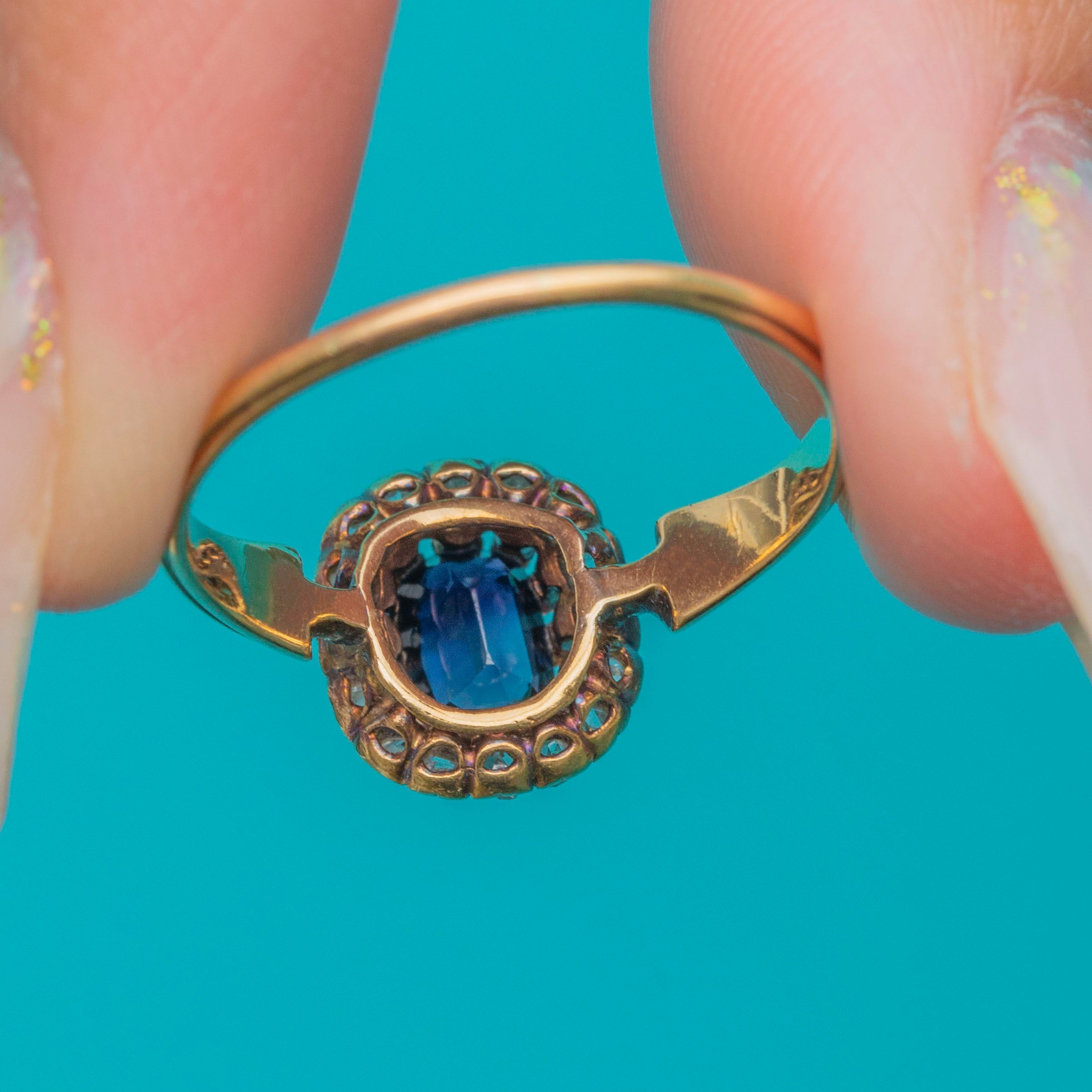 A charming French Belle Époque cluster ring in 18ct Gold, set with a rich deep blue oval Sapphire surrounded by a halo of glittering old-cut Diamonds. The stones are beautifully proportioned, with the Diamonds adding a soft sparkle that enhances the intensity of the Sapphire’s colour.