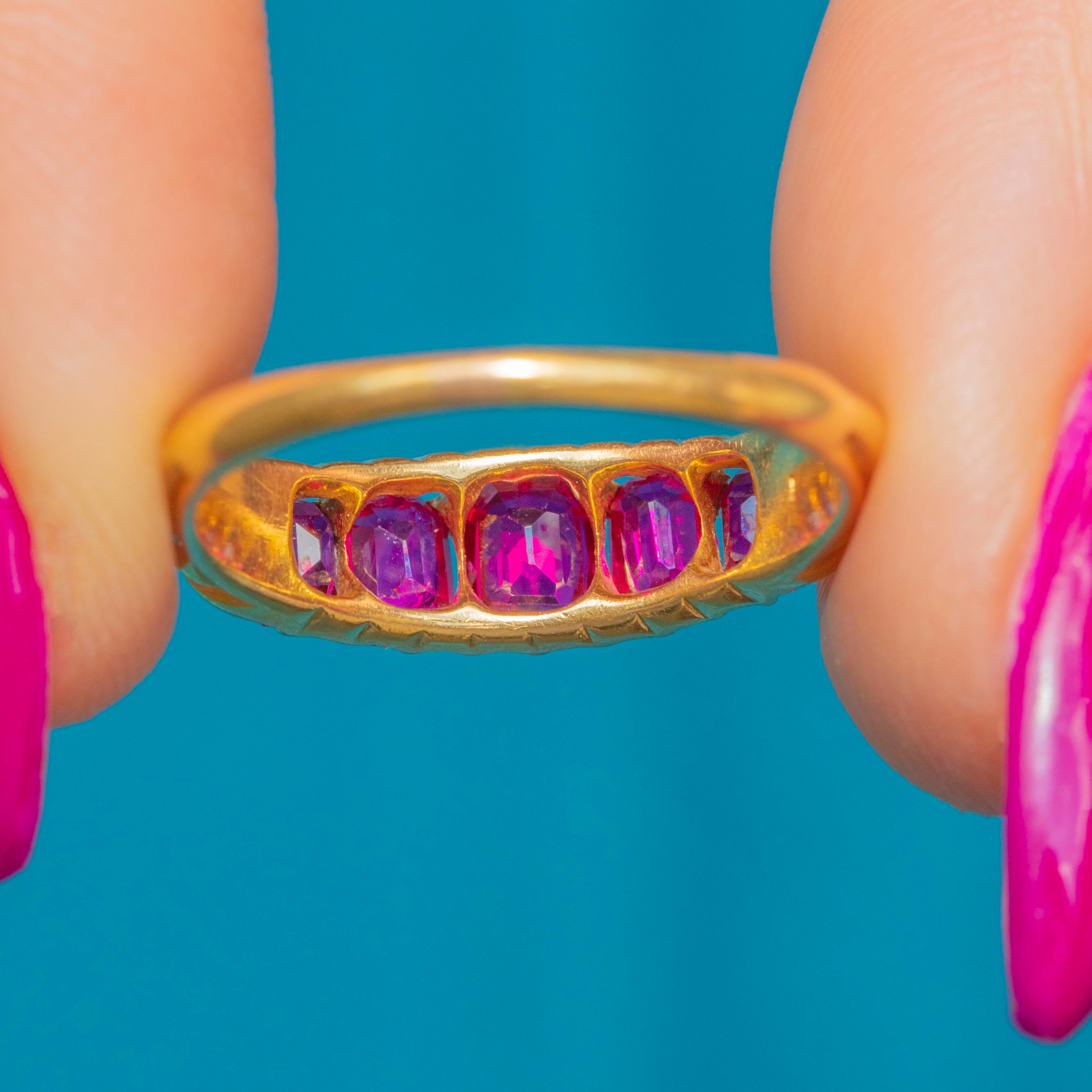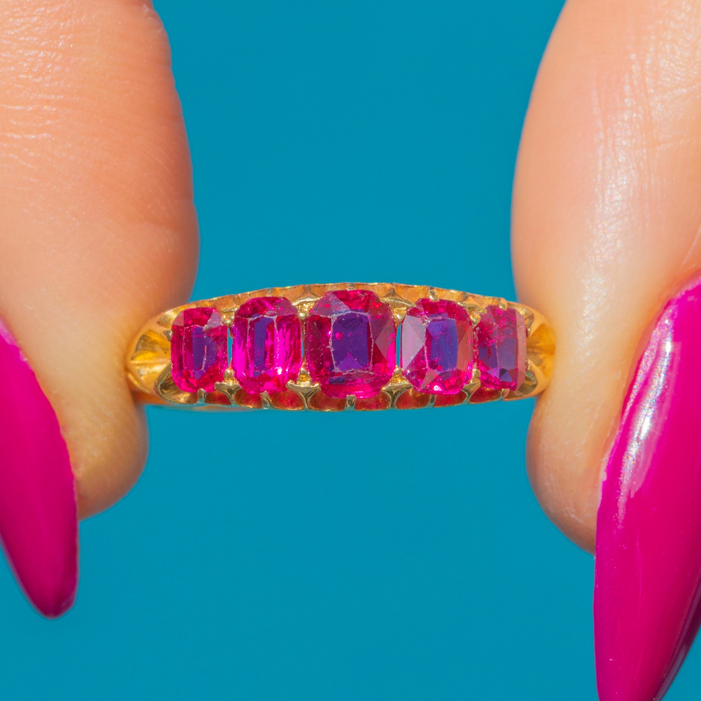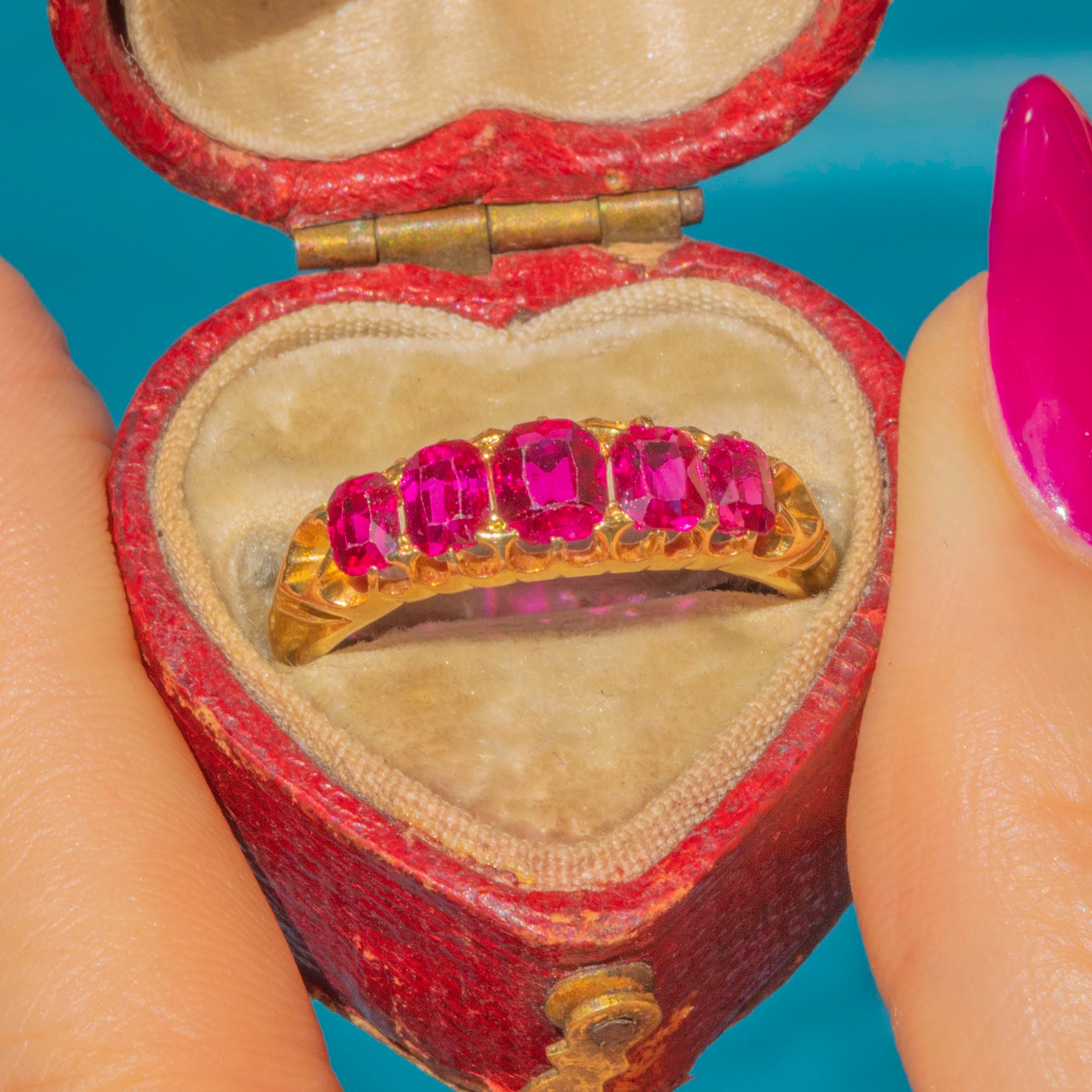 VERY GOOD-EXCELLENT. Set with five Rubies, each secure and with a stunning hue, this ring is a must for your collection! The 18ct Gold shank is robust and is stamped 18 on the inside. The Rubies are all beautifully preserved, with some minor nibbles to the middle two stones. The centre stone has a surface reaching inclusion, visible beneath a jeweller's loupe, but to the naked eye, this ring is impeccable! The ring comes with a certificate of authentication, making it a highly coveted piece of Victorian jewellery!