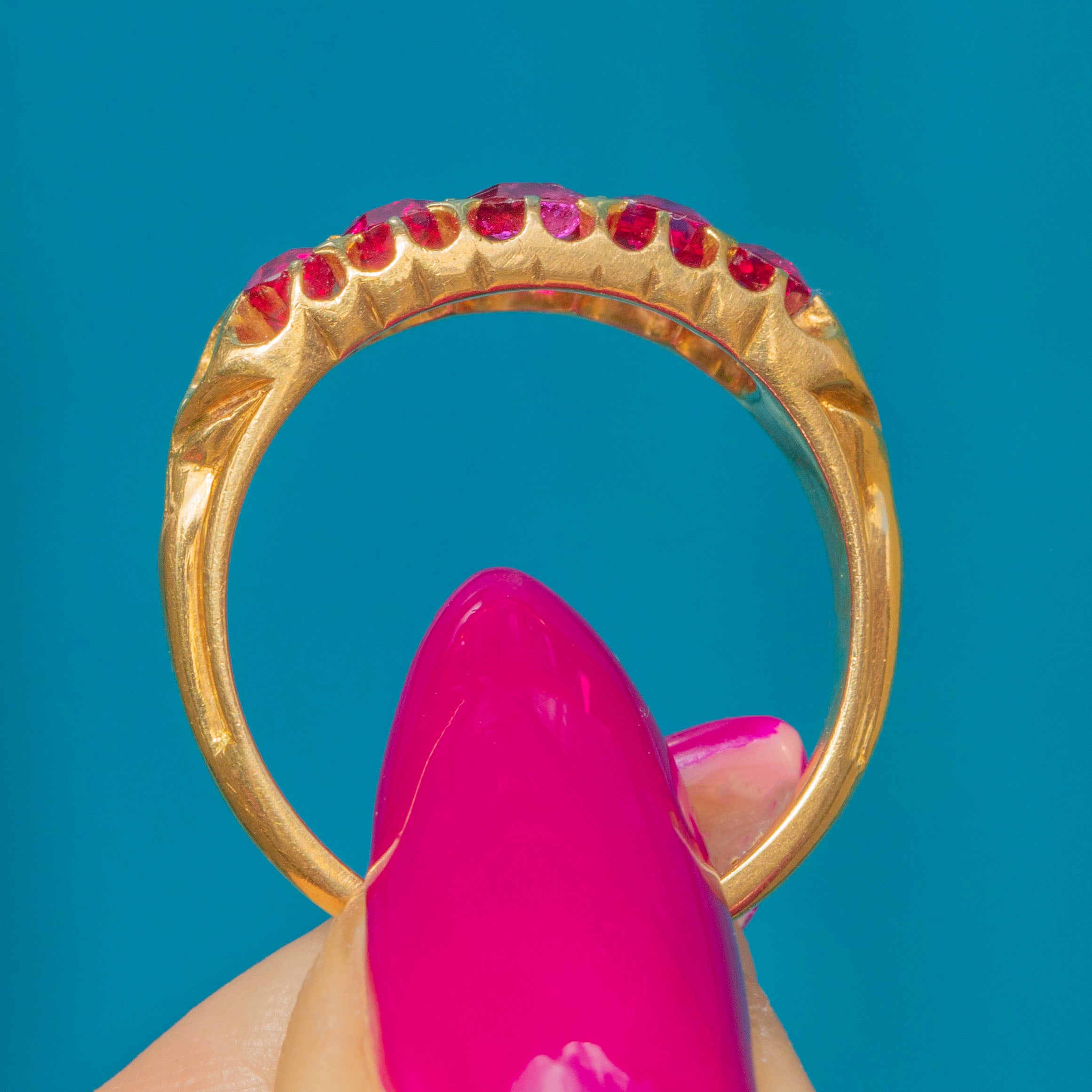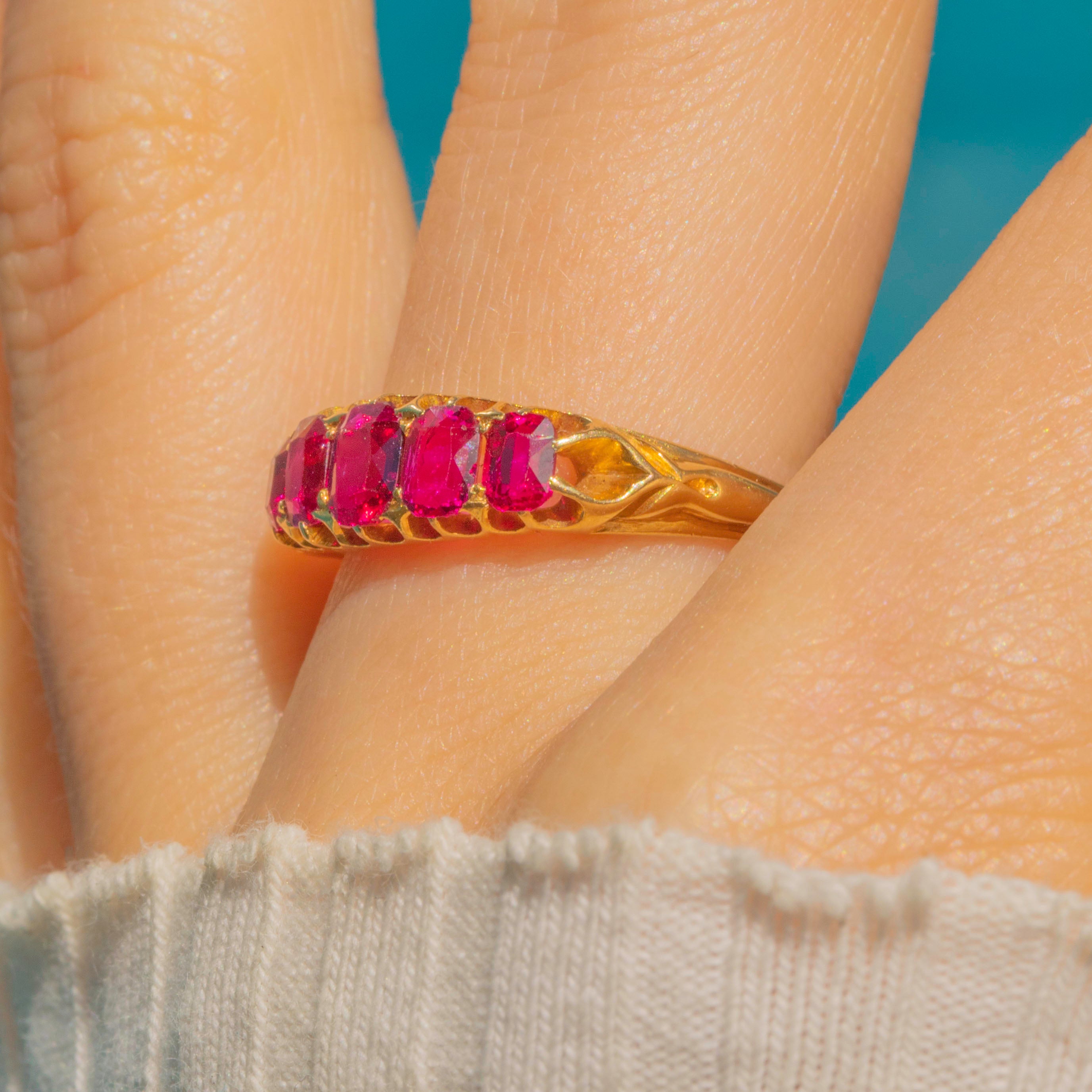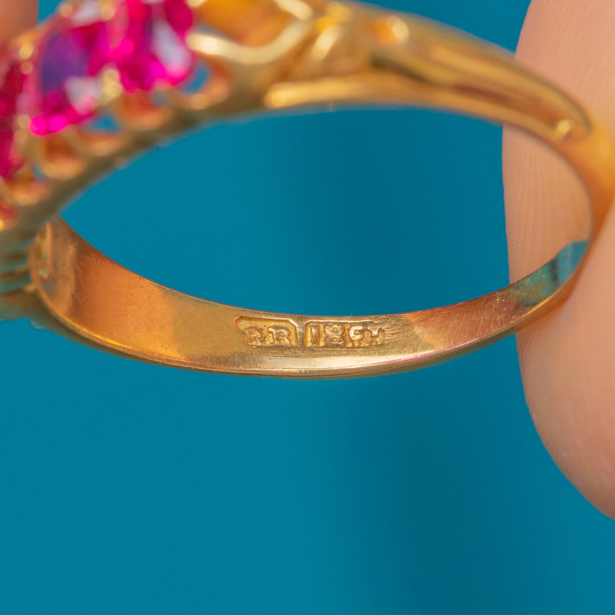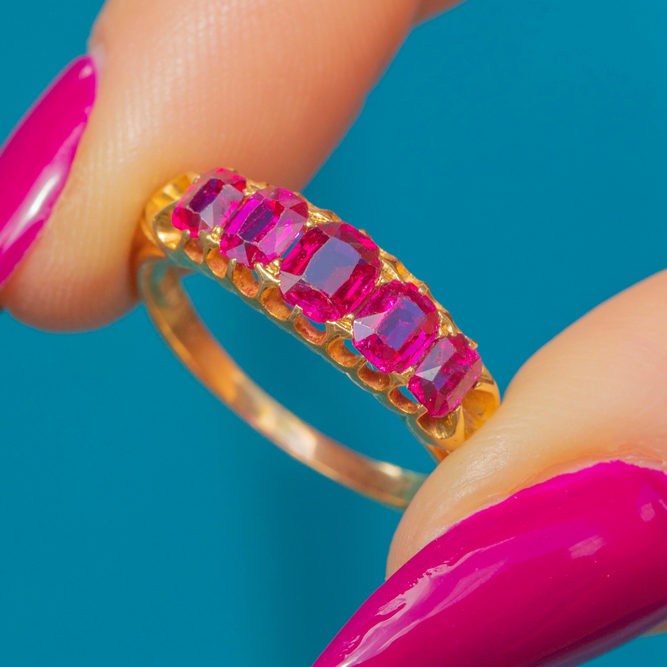 VERY GOOD-EXCELLENT. Set with five Rubies, each secure and with a stunning hue, this ring is a must for your collection! The 18ct Gold shank is robust and is stamped 18 on the inside. The Rubies are all beautifully preserved, with some minor nibbles to the middle two stones. The centre stone has a surface reaching inclusion, visible beneath a jeweller's loupe, but to the naked eye, this ring is impeccable! The ring comes with a certificate of authentication, making it a highly coveted piece of Victorian jewellery!