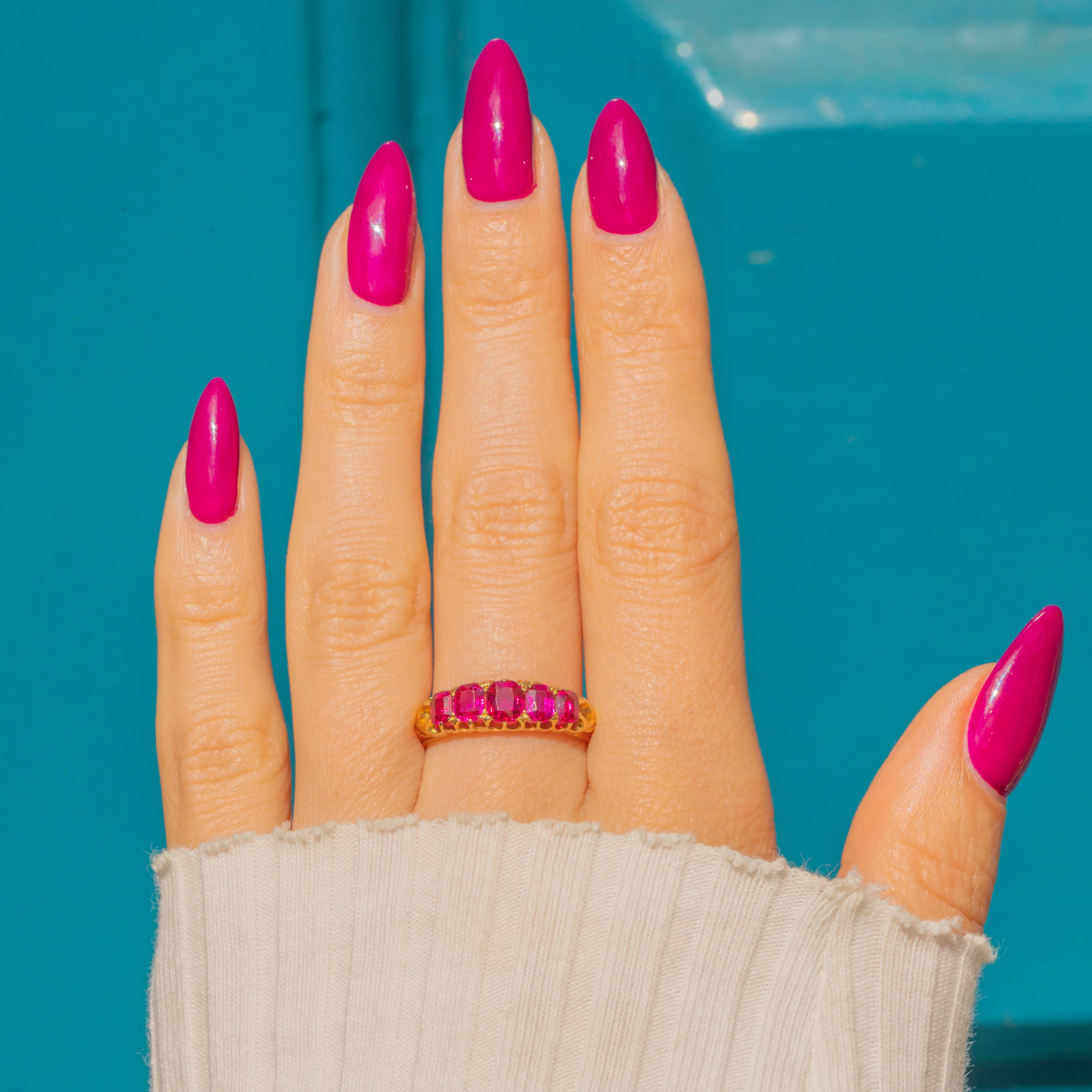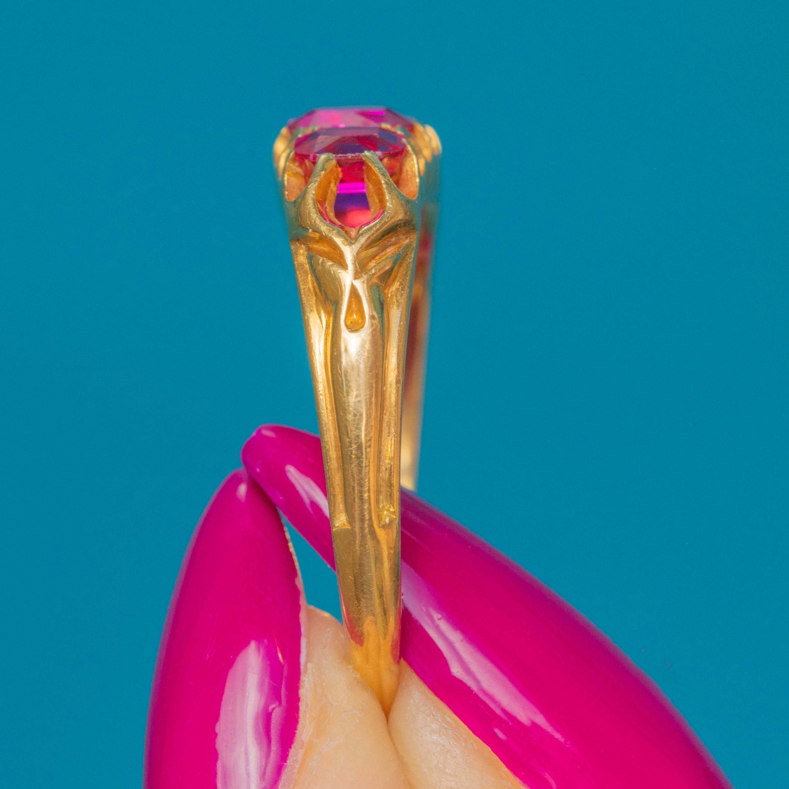 The deeply saturated Rubies span the width of the finger, showcasing that rich fuchsia hue from all angles. Allow this impressive Victorian ring to become a treasured pink centrepiece in your collection!