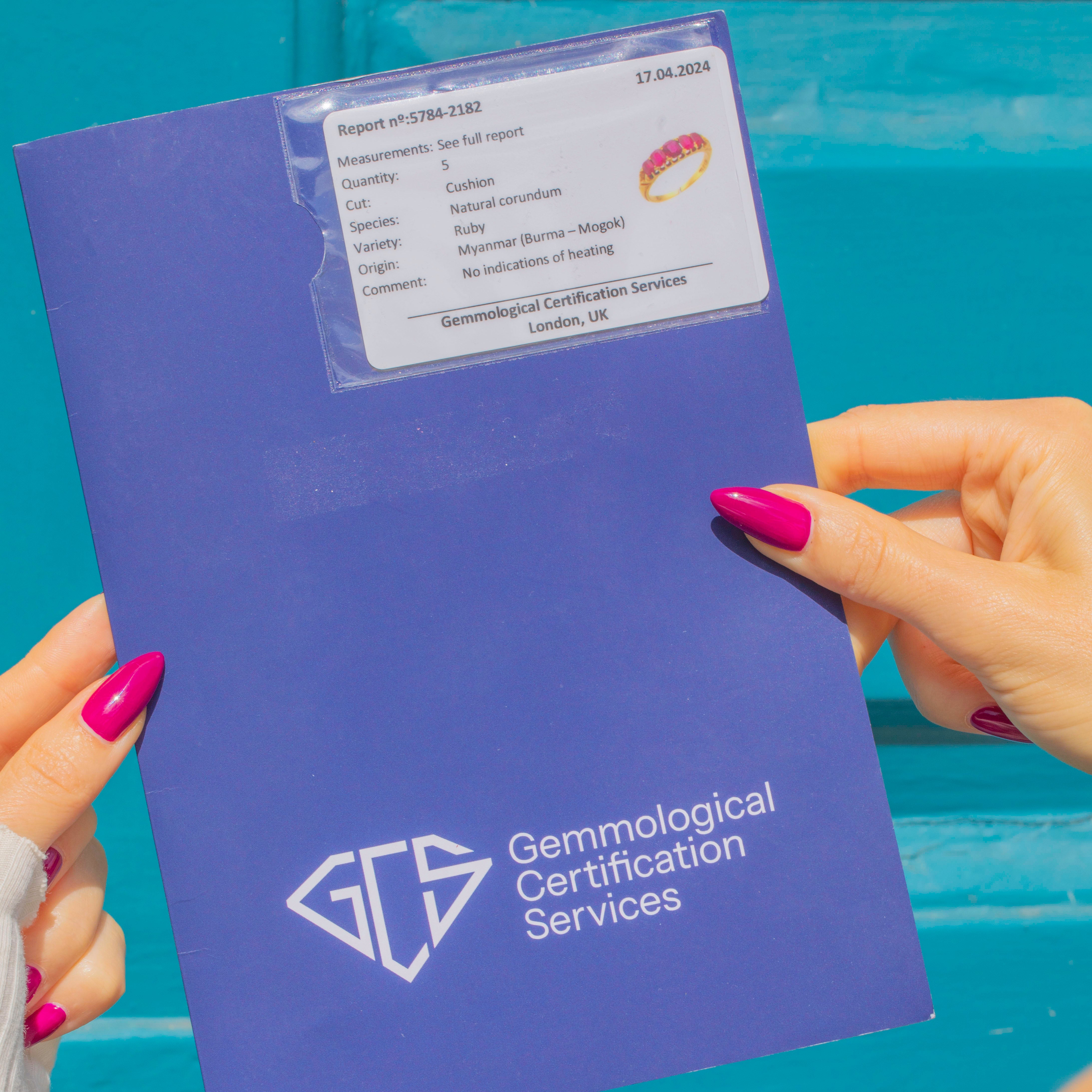 MATERIALS: Tests as 18ct Gold, Certified natural Burma Rubies with no evidence of heat treatment.