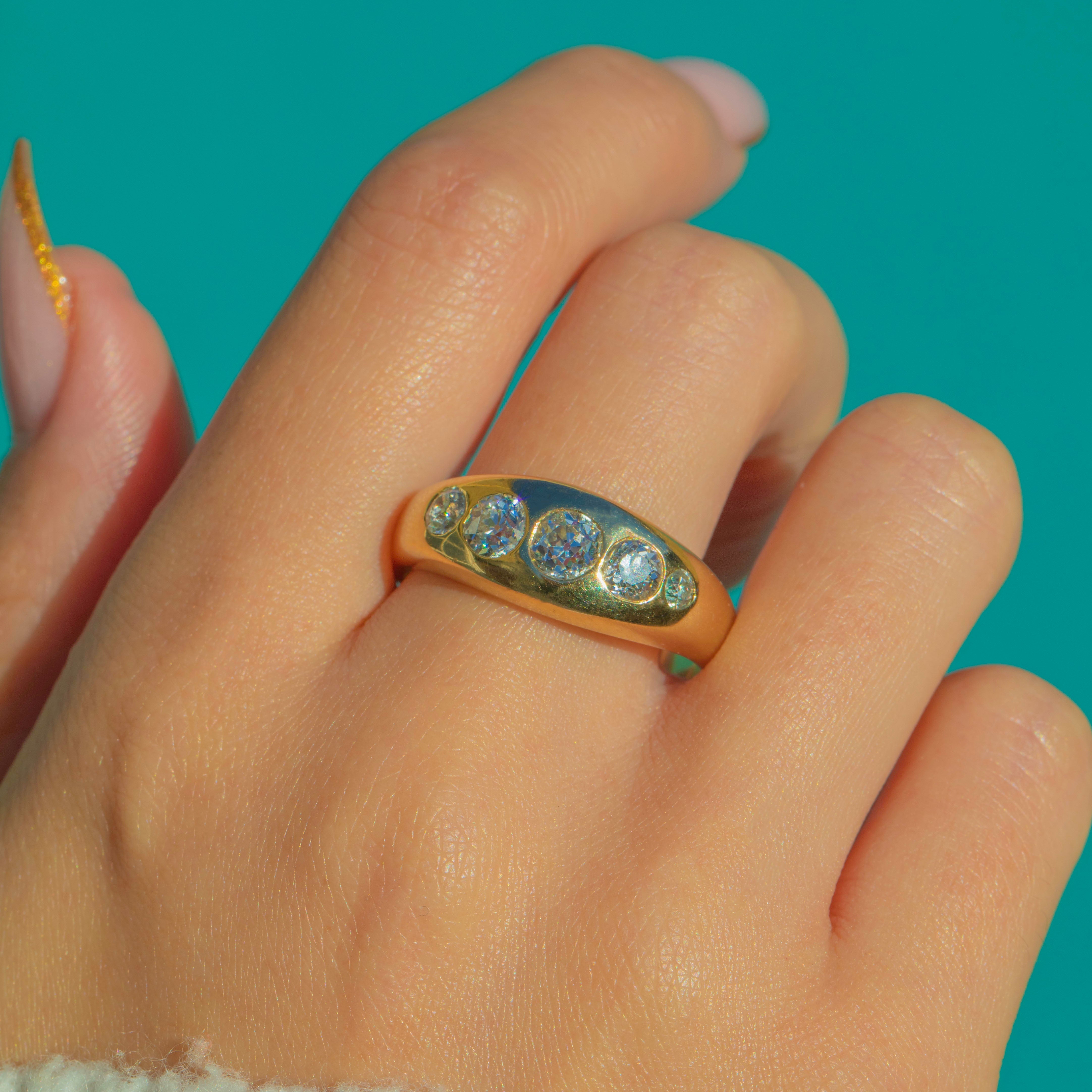 The graduated arrangement of stones gives the ring a strong, sculptural presence, with a central Diamond of approximately 0.45ct framed by a pair of 0.30ct stones and two outer accent Diamonds. The smooth, weighty Gold enhances their sparkle, creating a sleek and luxurious everyday statement piece.