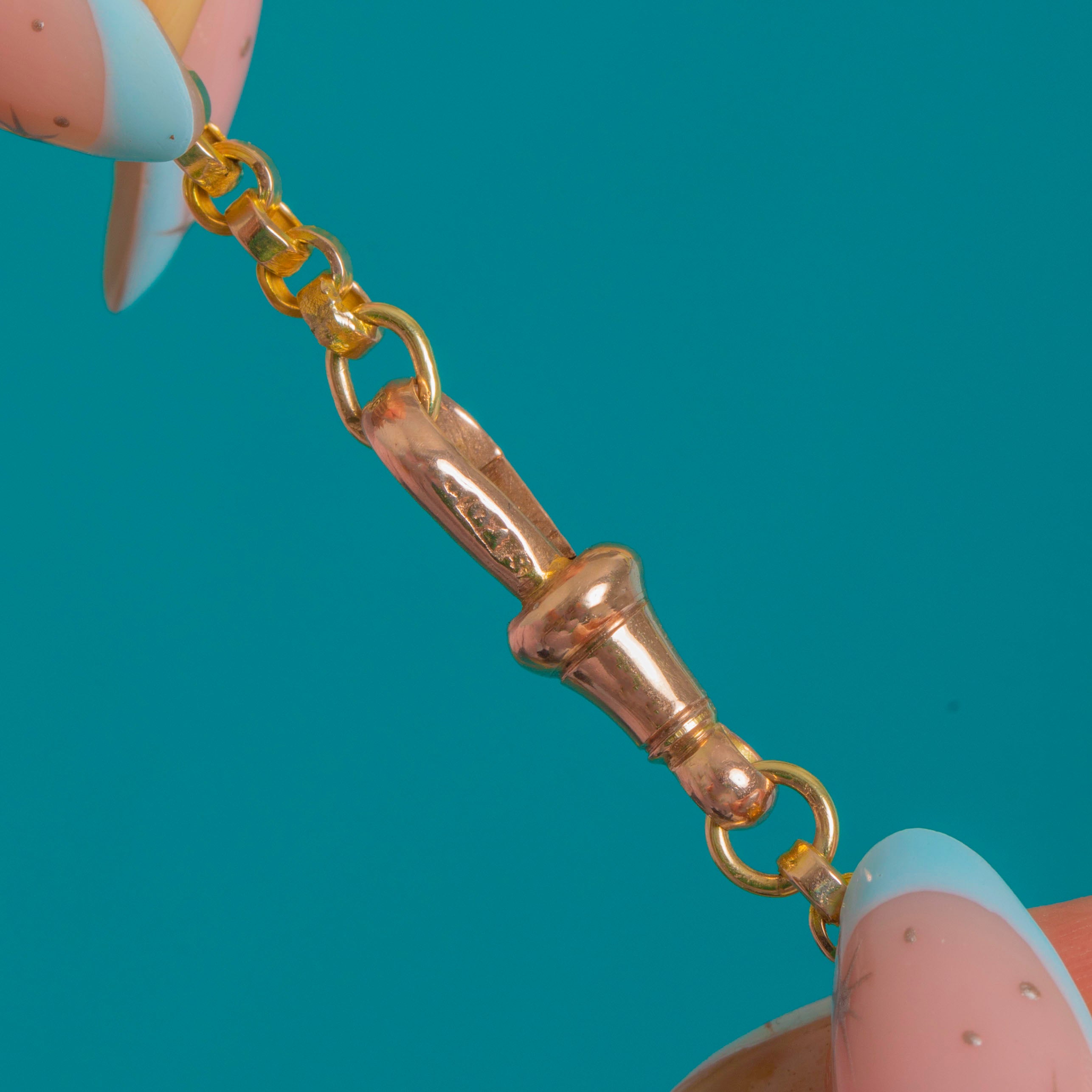 VERY GOOD: Light, even surface wear and minor abrasions to the links consistent with age and use. The links are secure and well-formed with some expected rubbing to a few links. The spring dog clip operates crisply and closes securely, with no visible repairs.