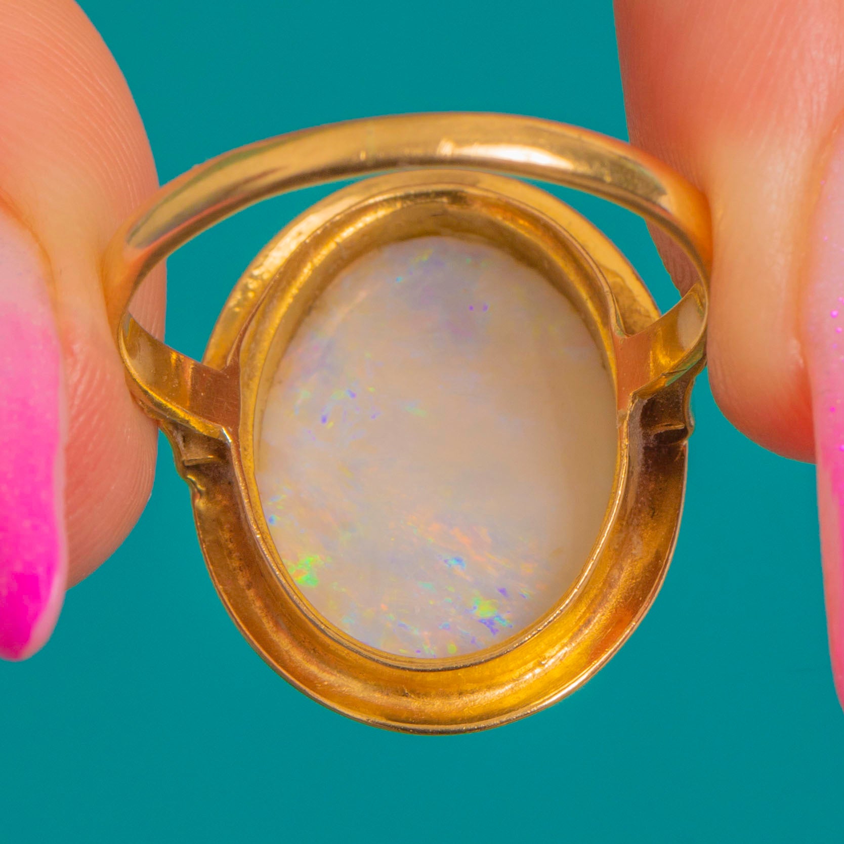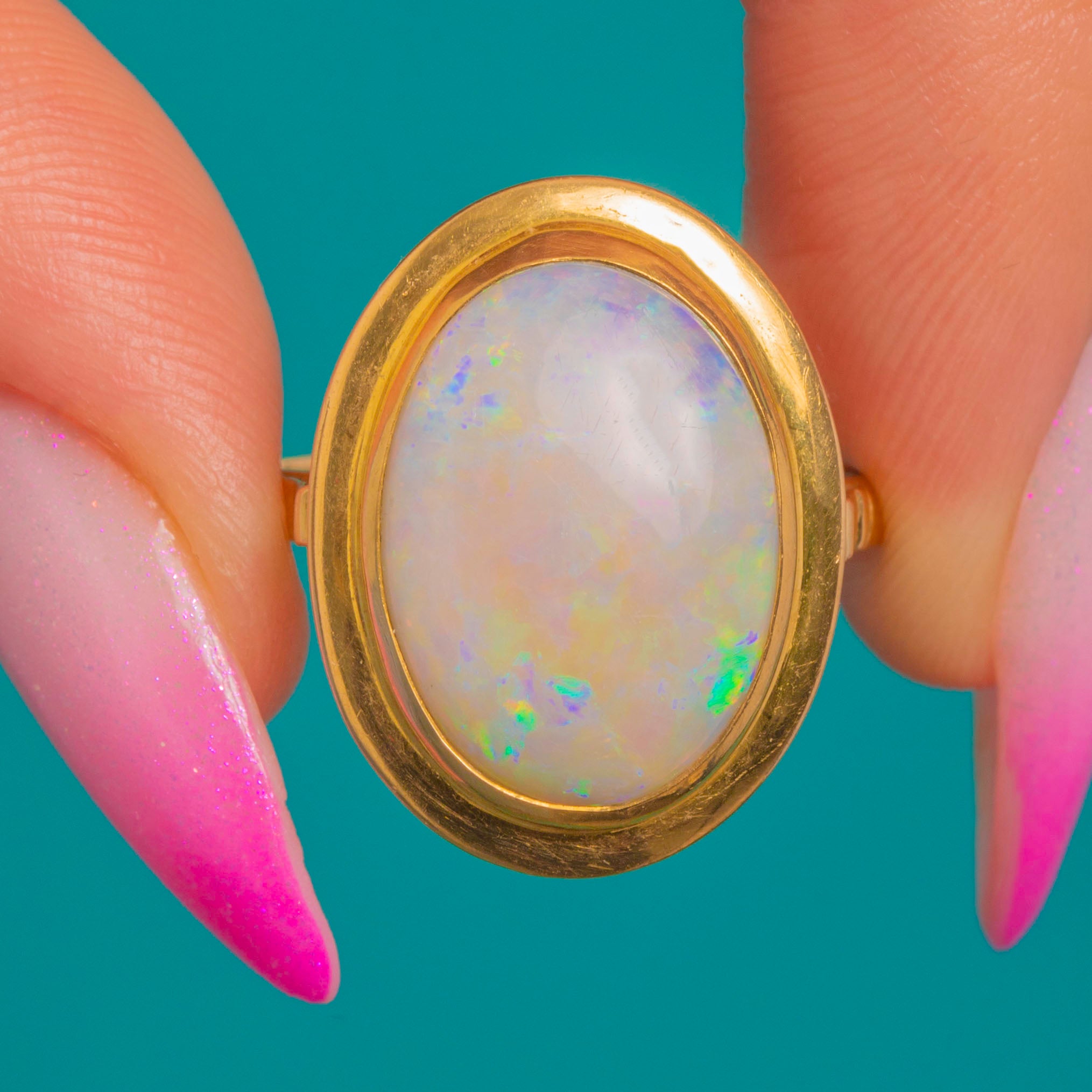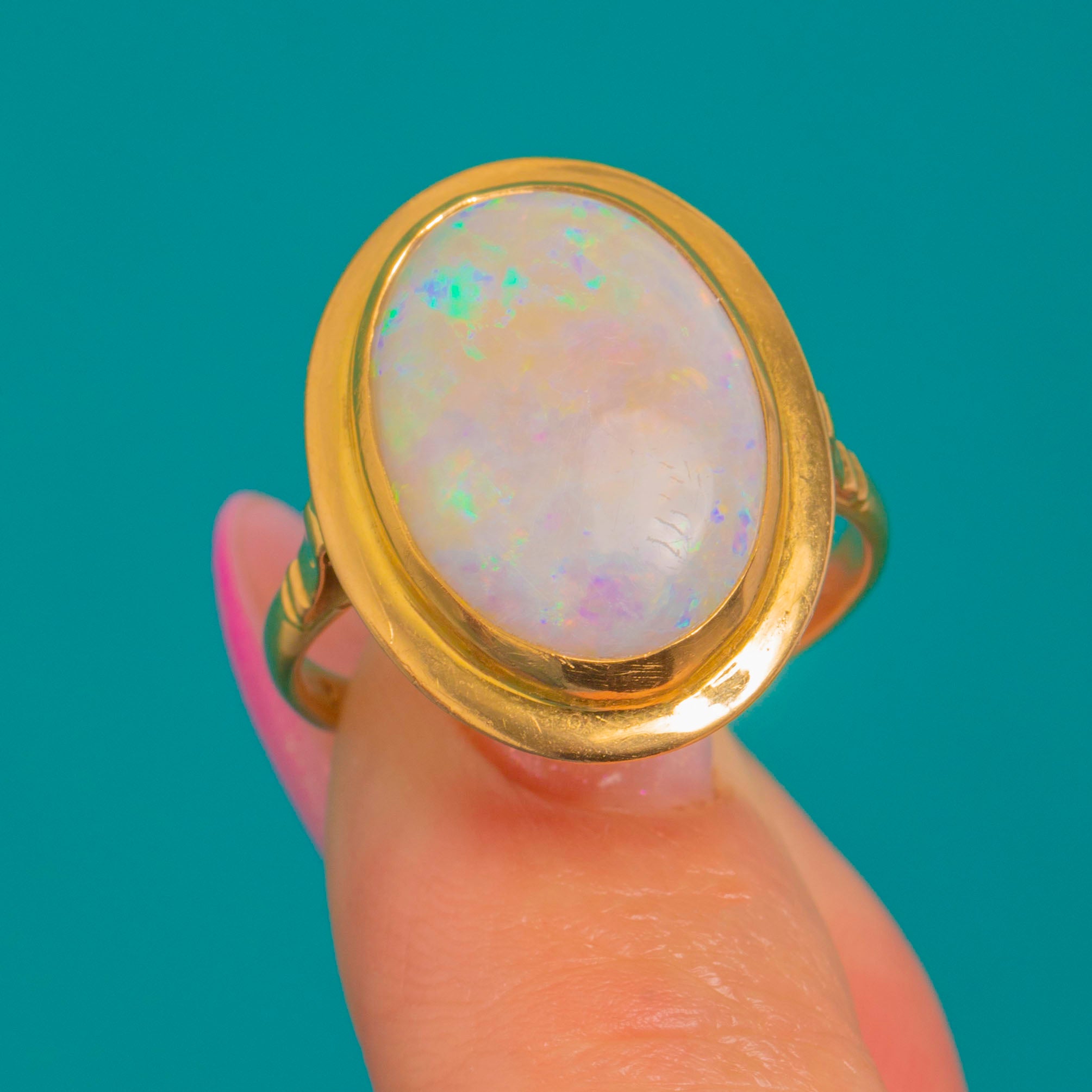 EXCELLENT: The Opal is smooth, well-protected in its bezel, and displays vibrant play-of-colour with no chips, cracks, or crazing; it is securely set. The Gold shows only minimal light surface wear with a high-shine polish, and there are no signs of previous resizing. Well cared for and ready to wear.