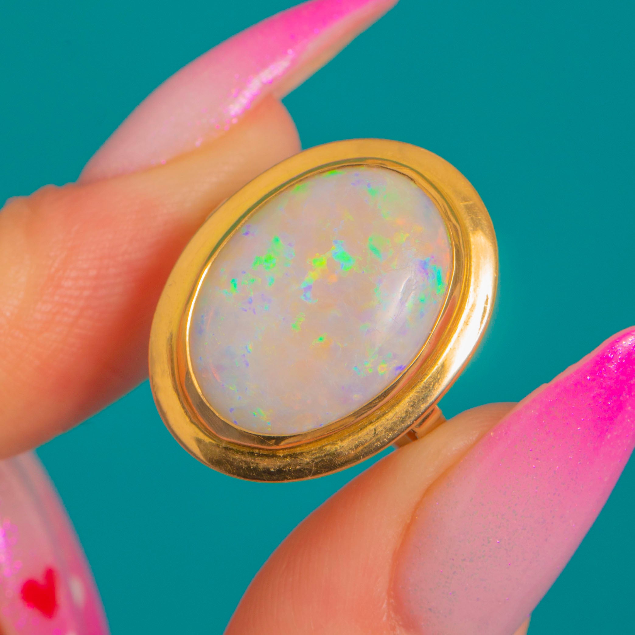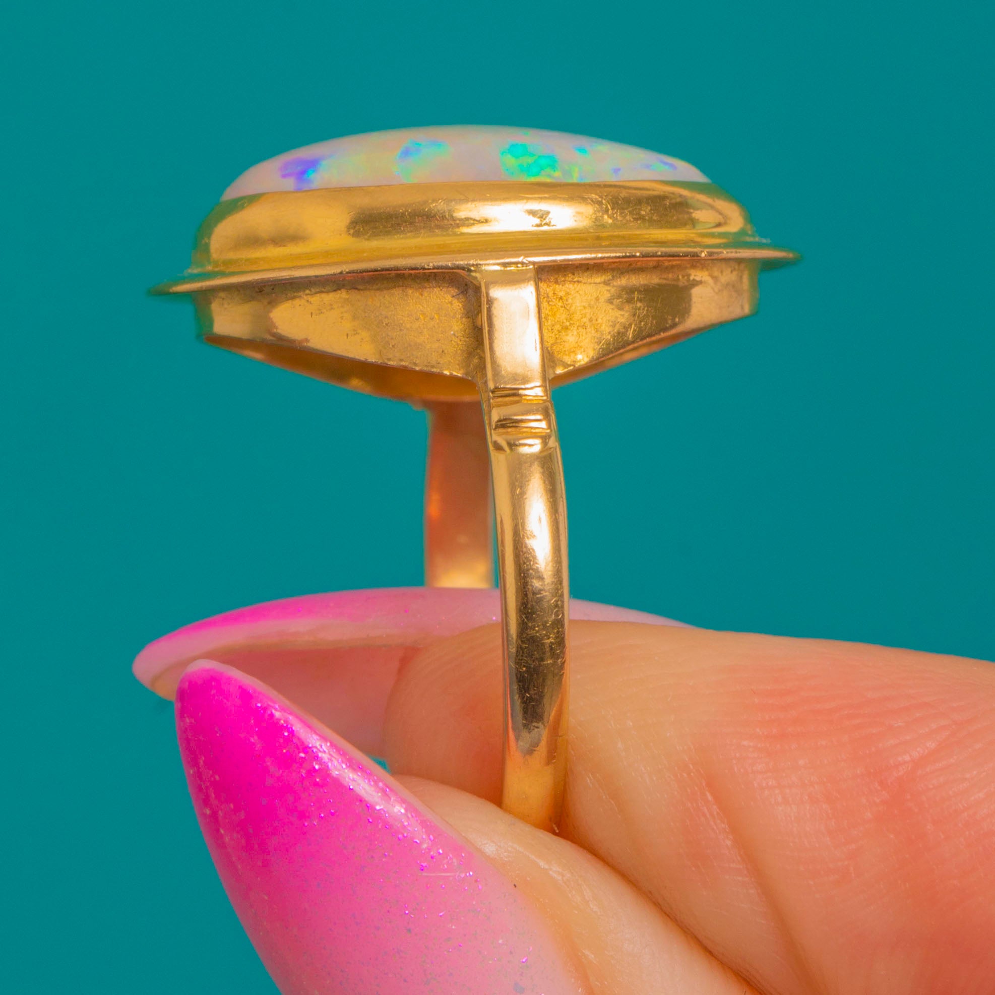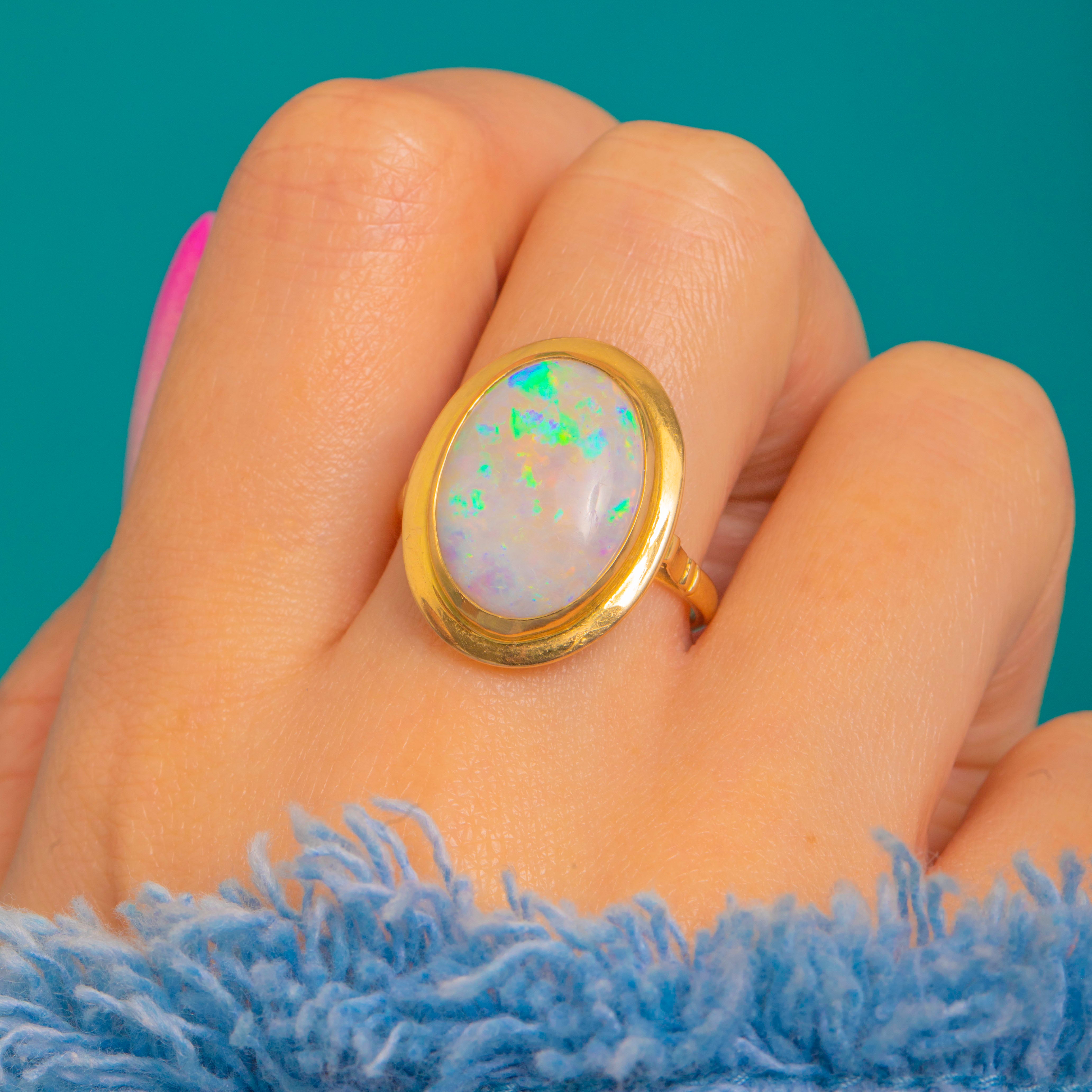 A luminous Mid-Century Opal ring in rich 18ct Gold, designed with that effortless modernist ease we adore. The large natural Opal cabochon glows with pastel play-of-colour, showing vibrant greens and blues with pretty flickers of pink and yellow as the light moves.