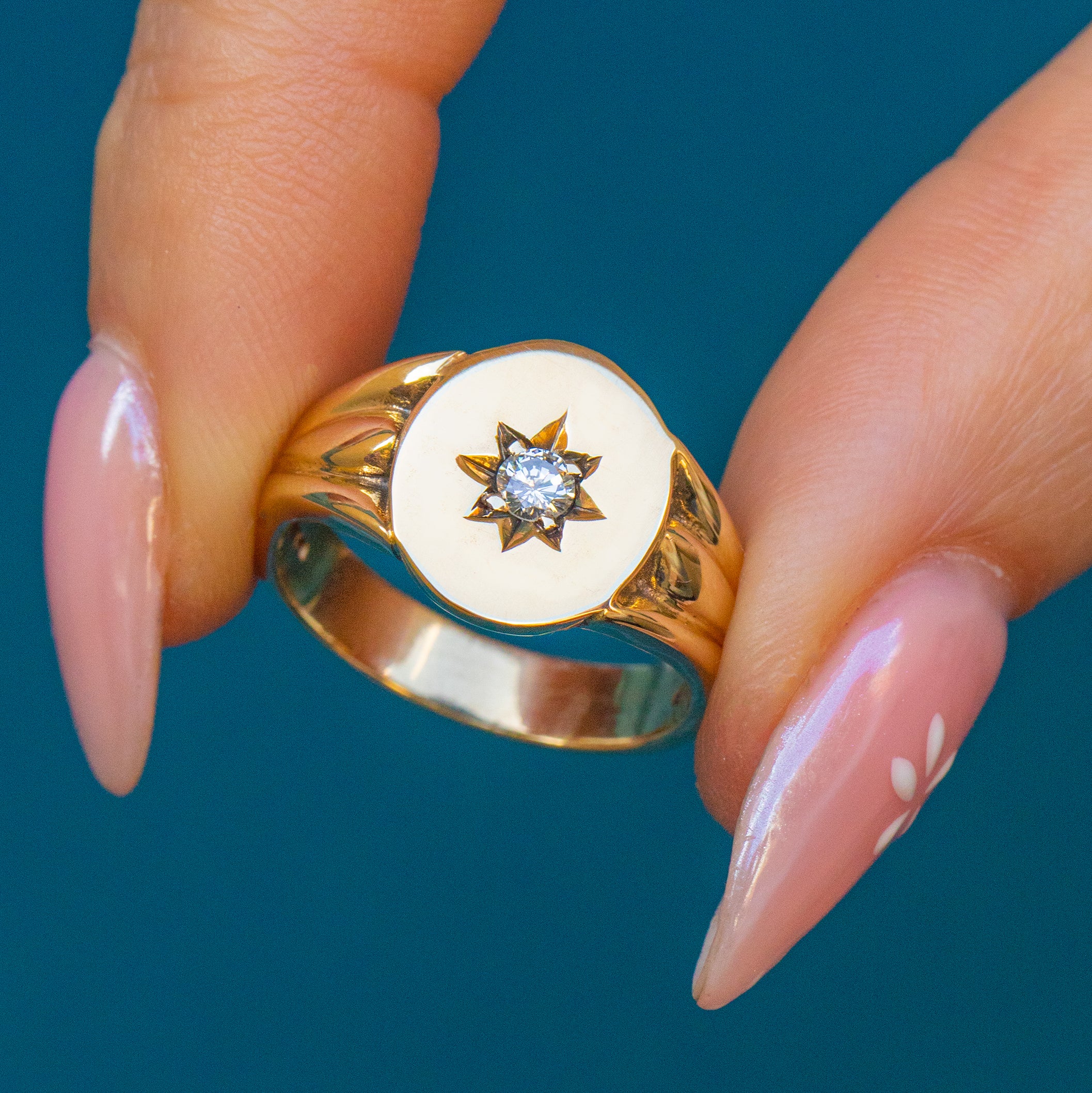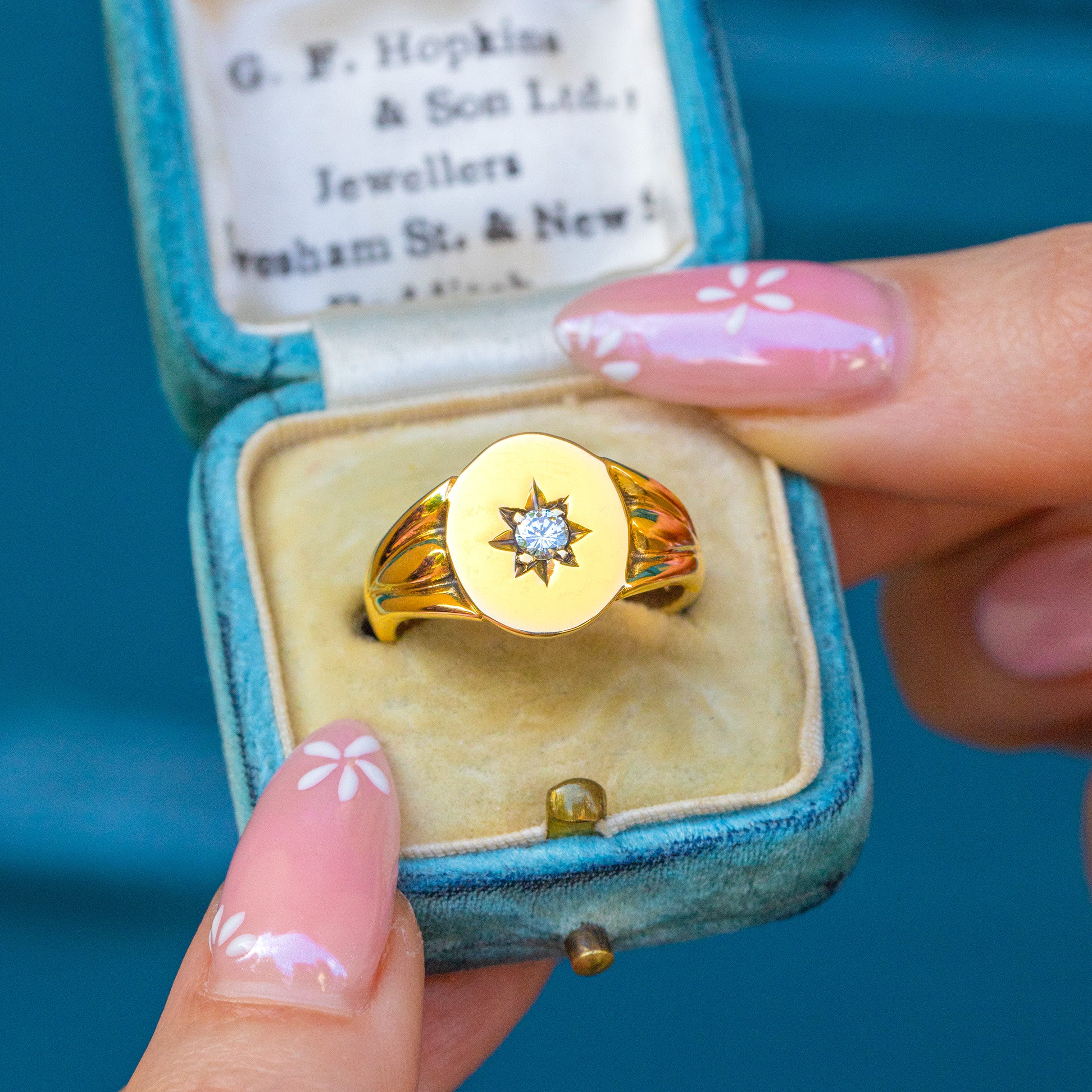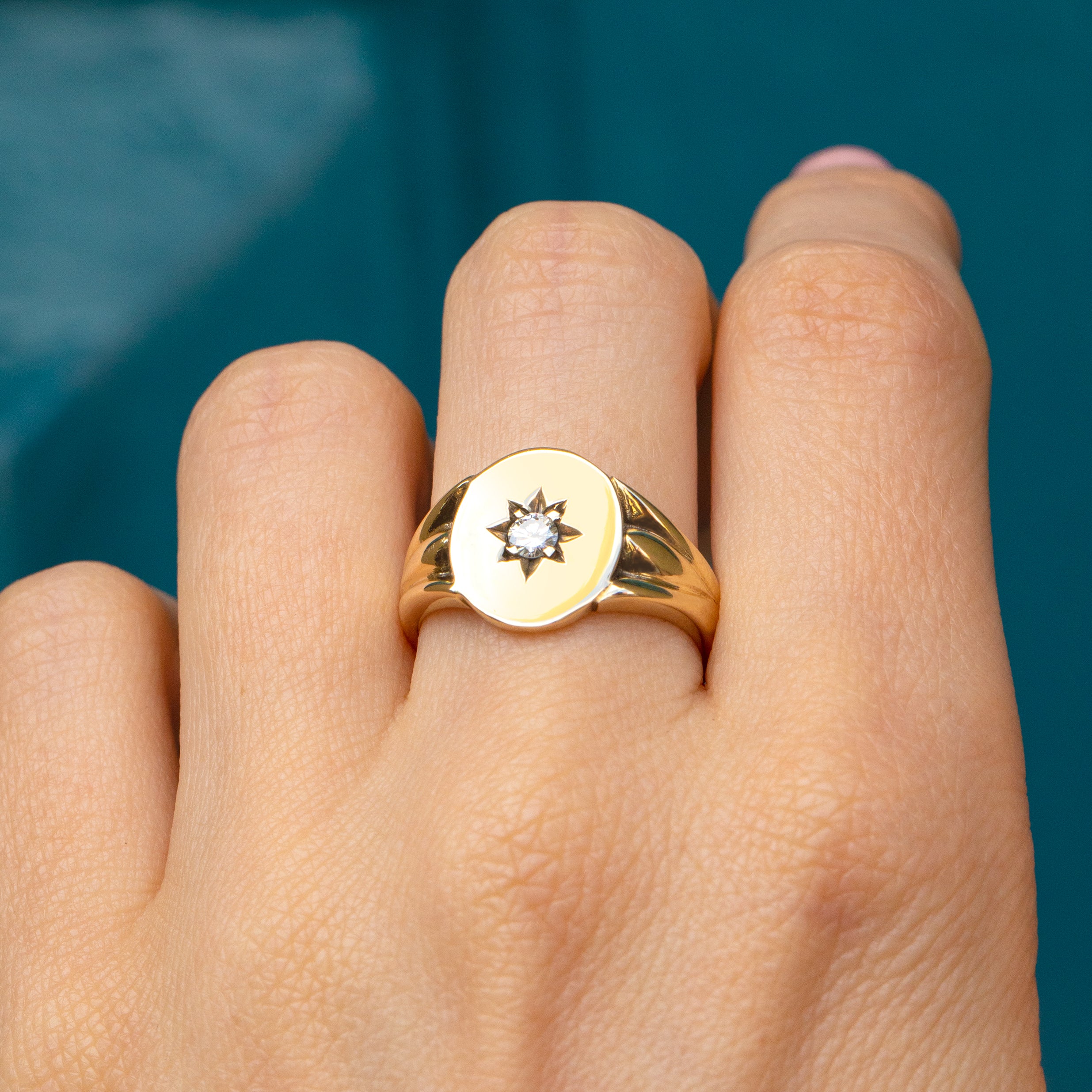 Feast your eyes on this chunky 9ct Gold Diamond star-set signet ring! This gorgeous Gold signet ring is home to a 0.30ct Diamond nestled in a star setting with a timeless celestial appeal.