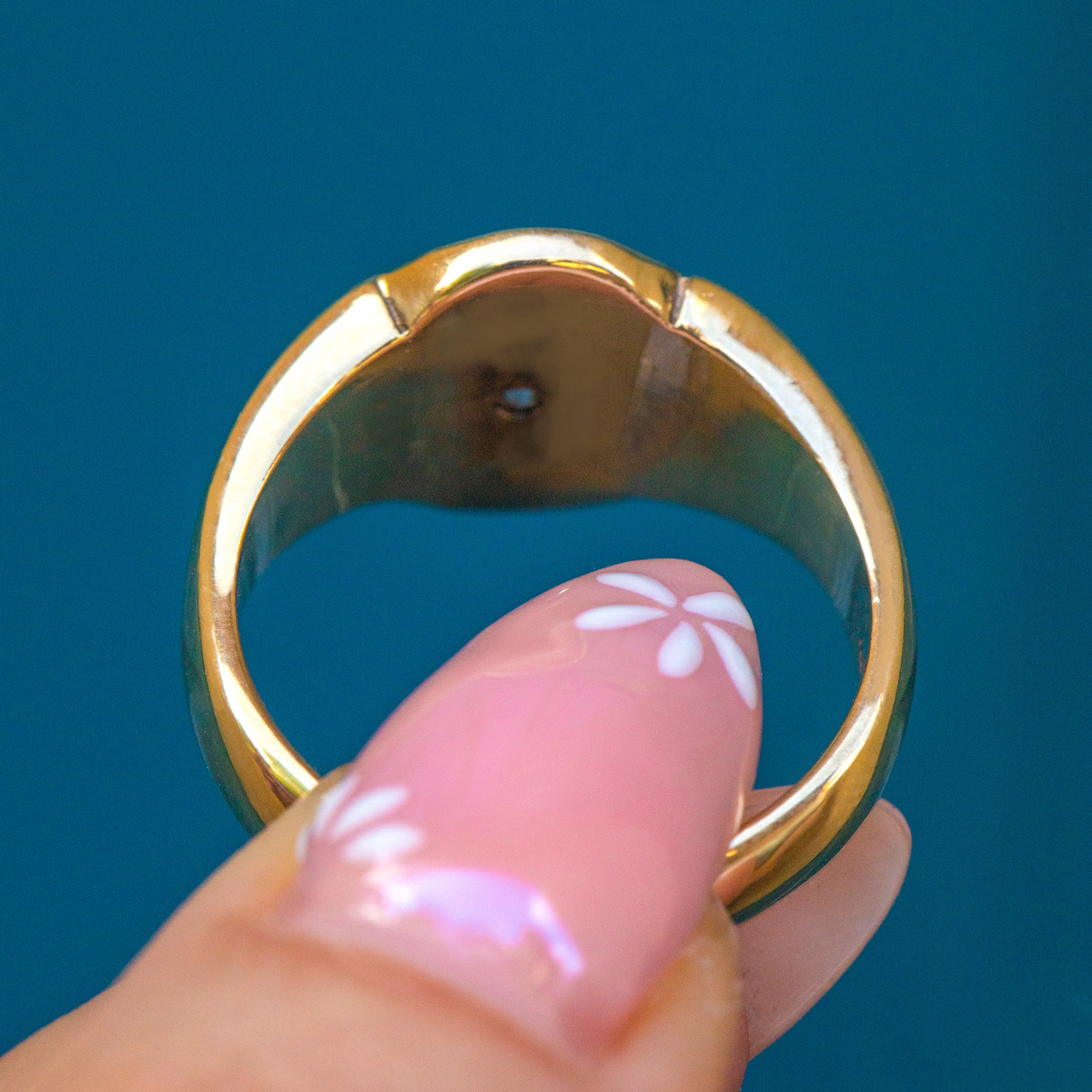 This chunky 9ct Gold ring has a classic oval signet ring face, tapering to form a sleek chunky band that wears comfortably on the finger. A vintage Gold ring like this can be worn every day to achieve that clean Gold aesthetic, and is one that you will never tire of wearing!