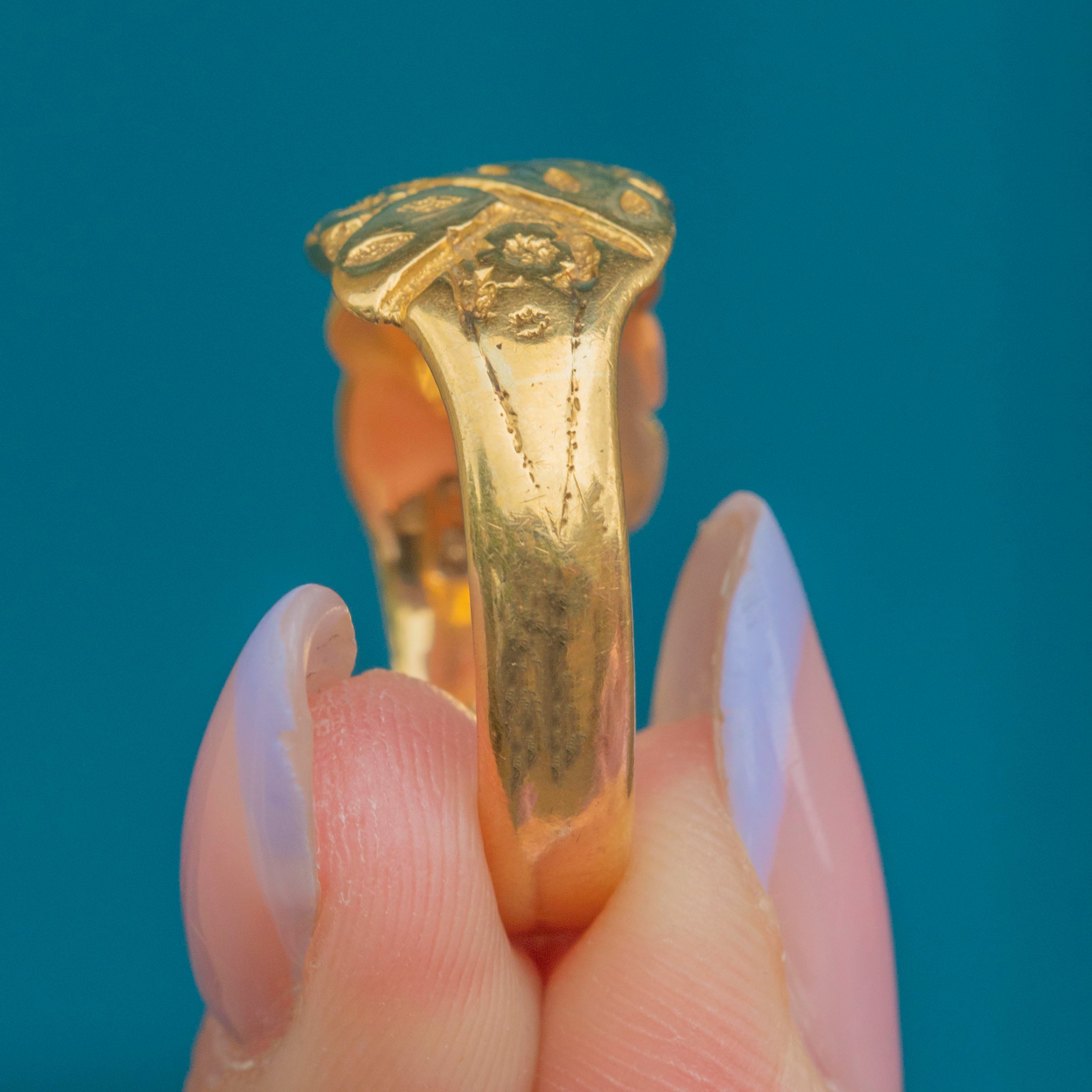 This chunky antique 18ct Gold engraved flower ring is a decadent delight! Crafted entirely from honey hued 18ct Gold, she is adorned with an array of floral engravings, providing a lovely texture and depth to this glossy ring.