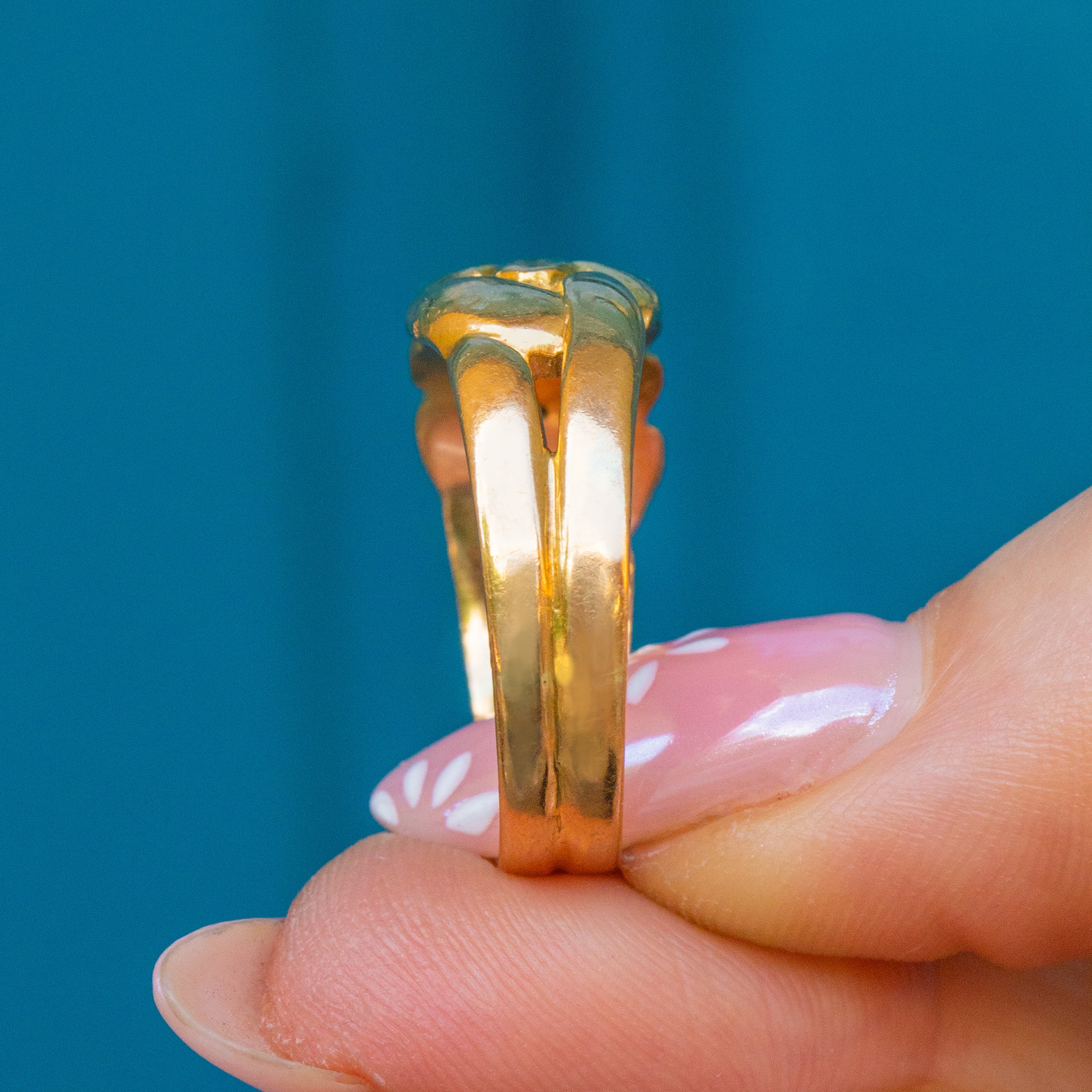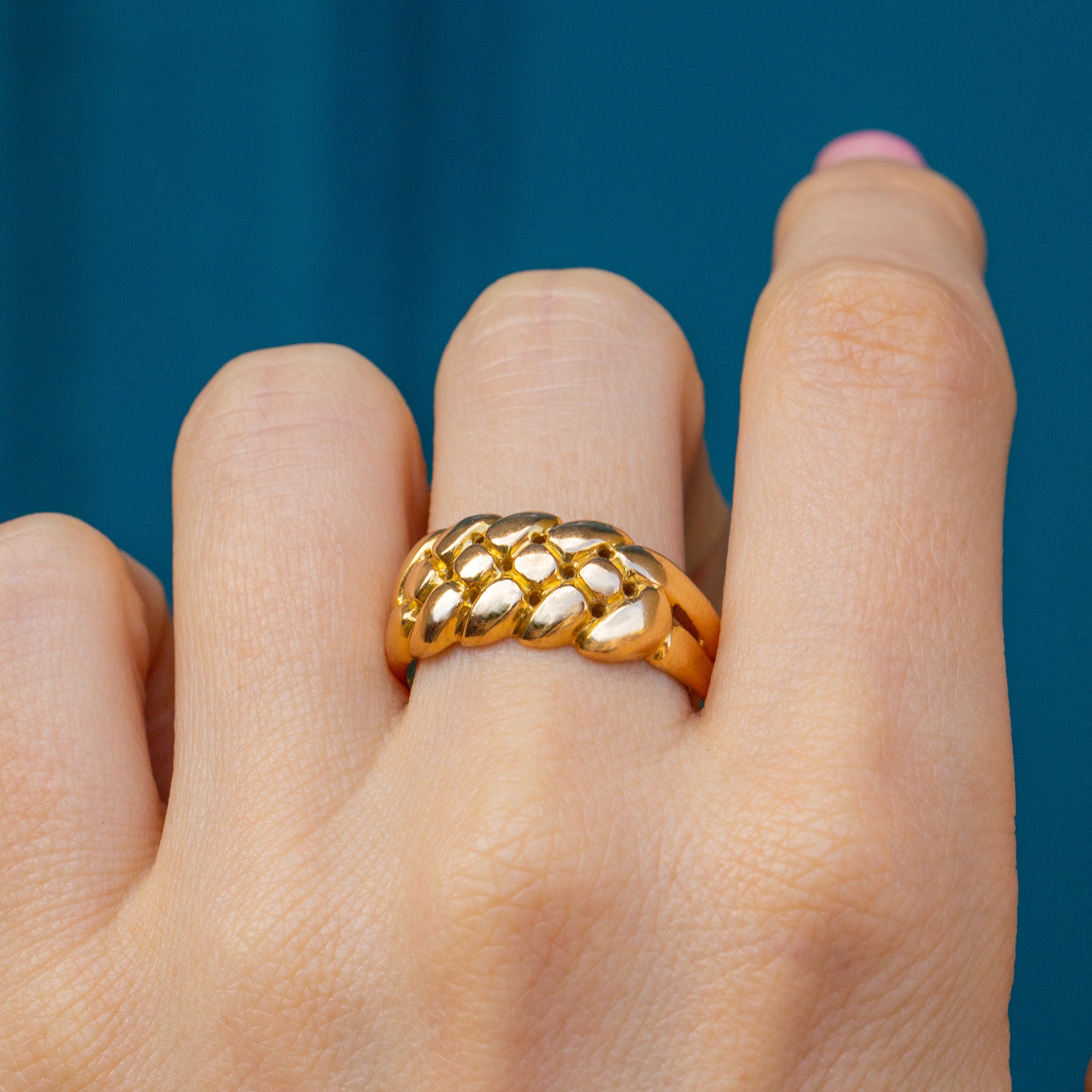 Wow, just look at this incredible chunky antique 18ct Gold keeper ring! Crafted entirely from richly saturated 18ct Gold forming her intricate knotted rows with pierced detailing, she's an eye-catching piece and perfect for daily wear.