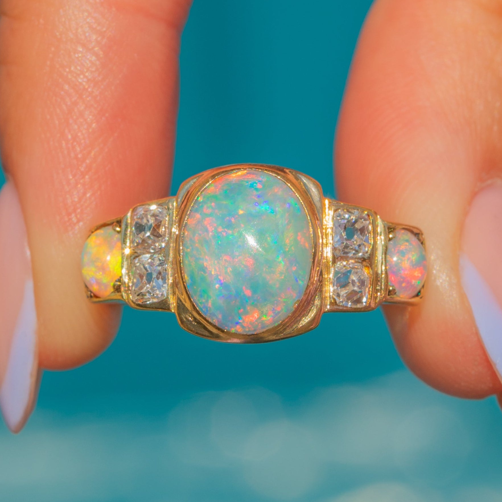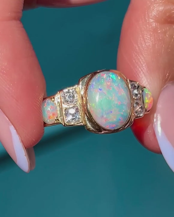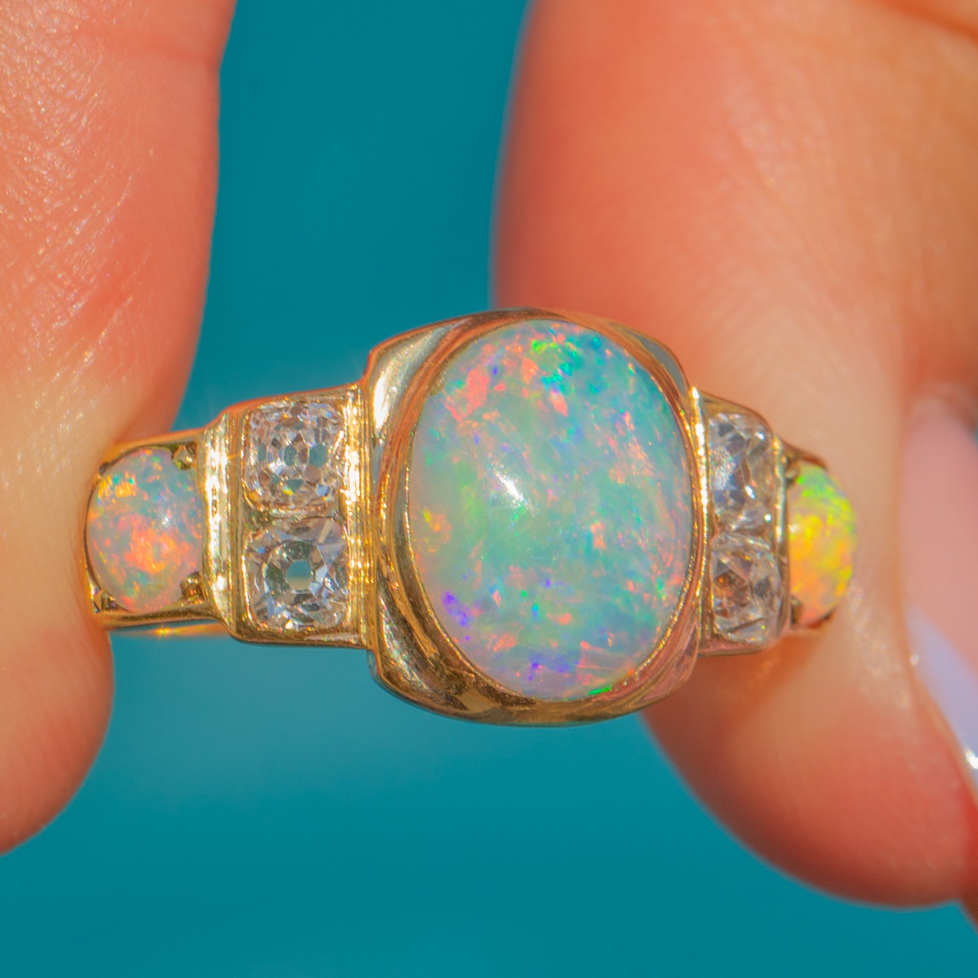 Chunky Antique 18ct Gold Opal Diamond Seven Stone Ring, 2.05ct Natural Solid Opal