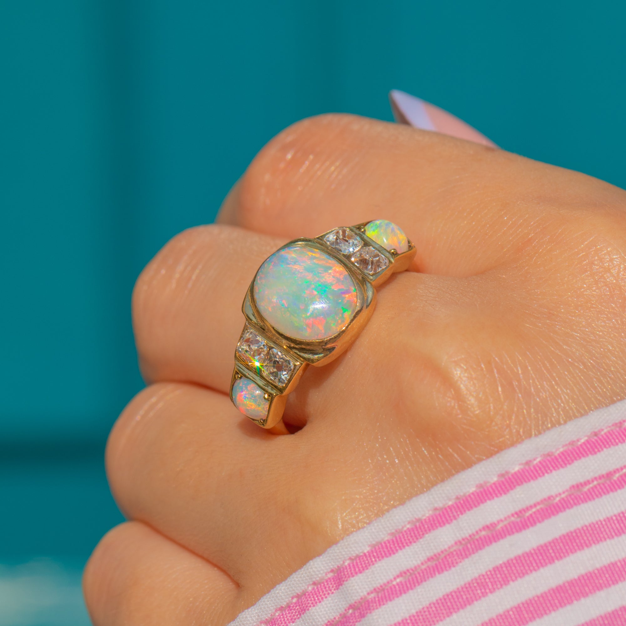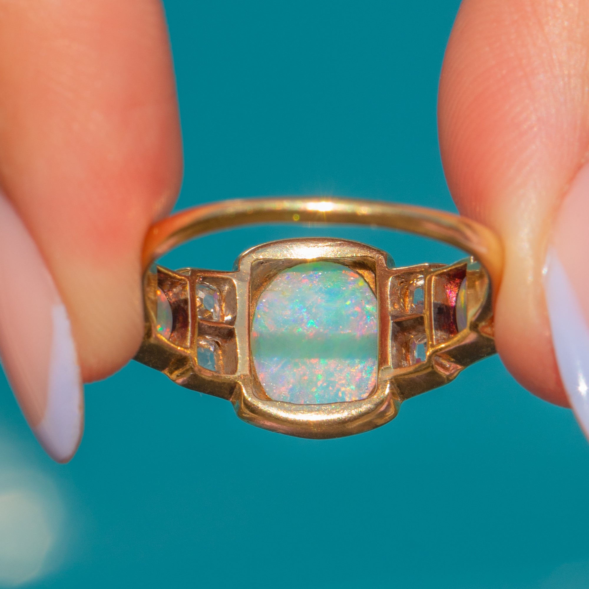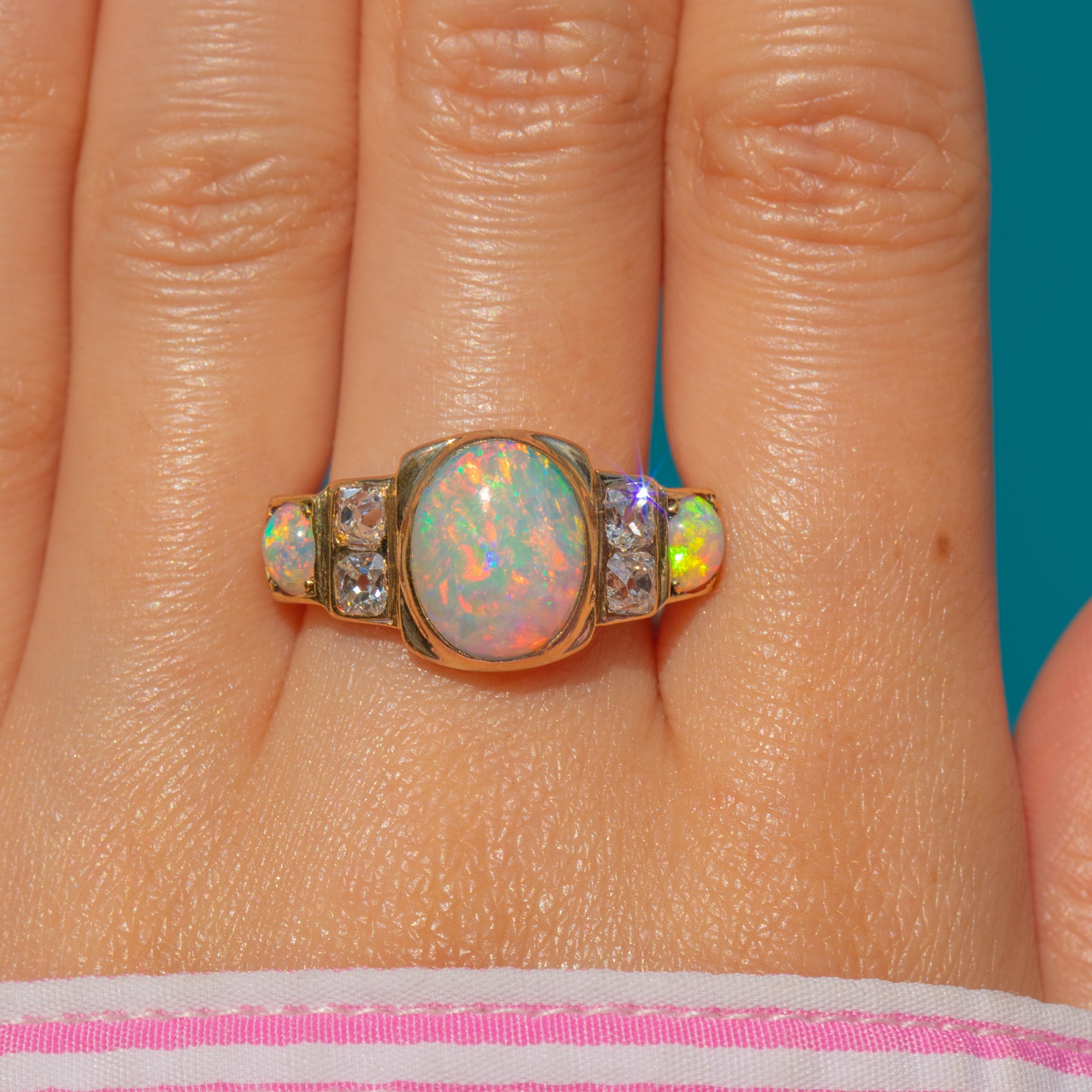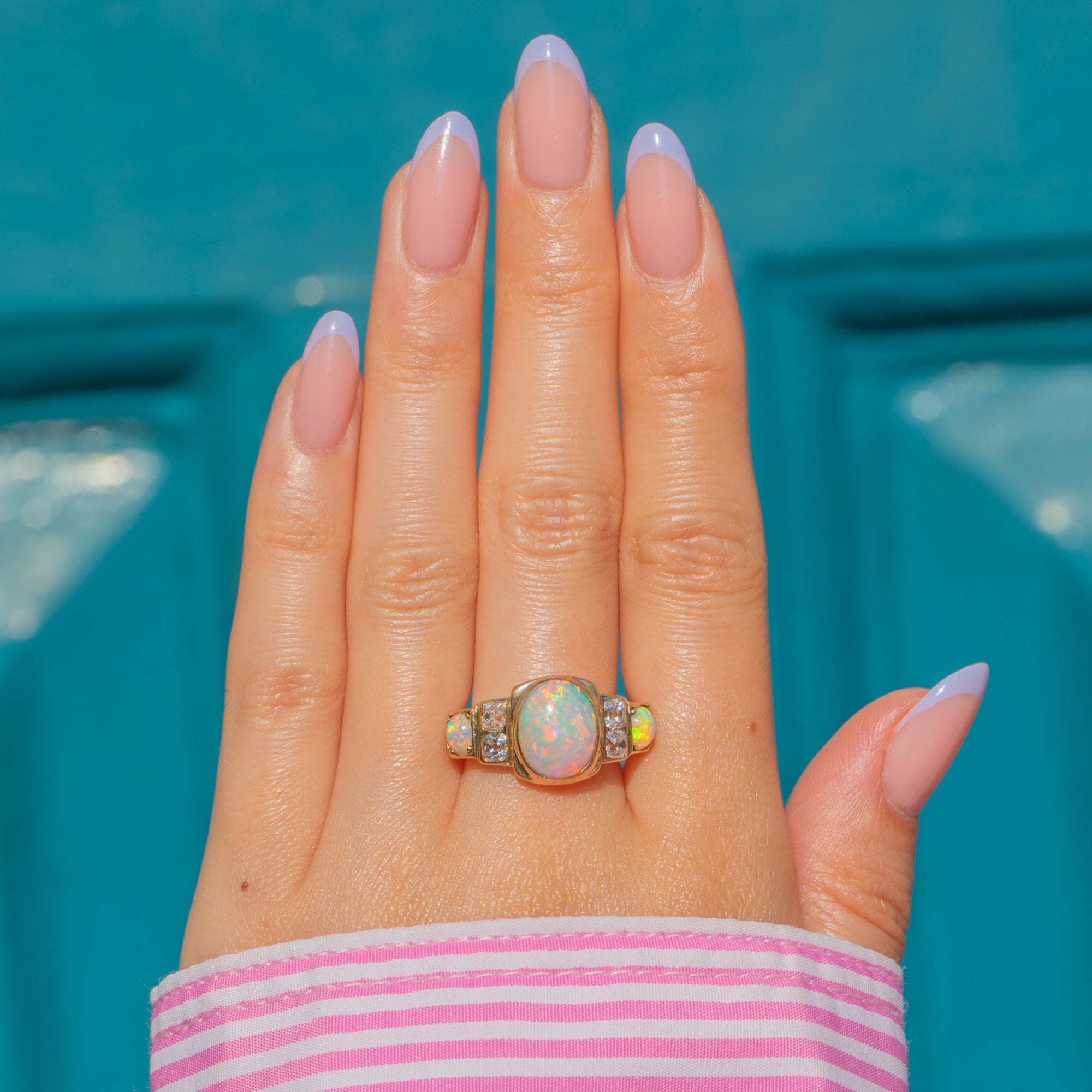 The Opals are all chunky cabochon cuts with excellent fire and radiance. They have a rare play of kaleidoscopic colours; all full of pinks, lilac and orange, and with the occasional flash of luminous bright green - like your very own galaxy resting on your finger. Nestled between the Opals are four whopping great old-cut Diamonds, adding brilliant sparkle and grandeur to this already show-stopping piece.