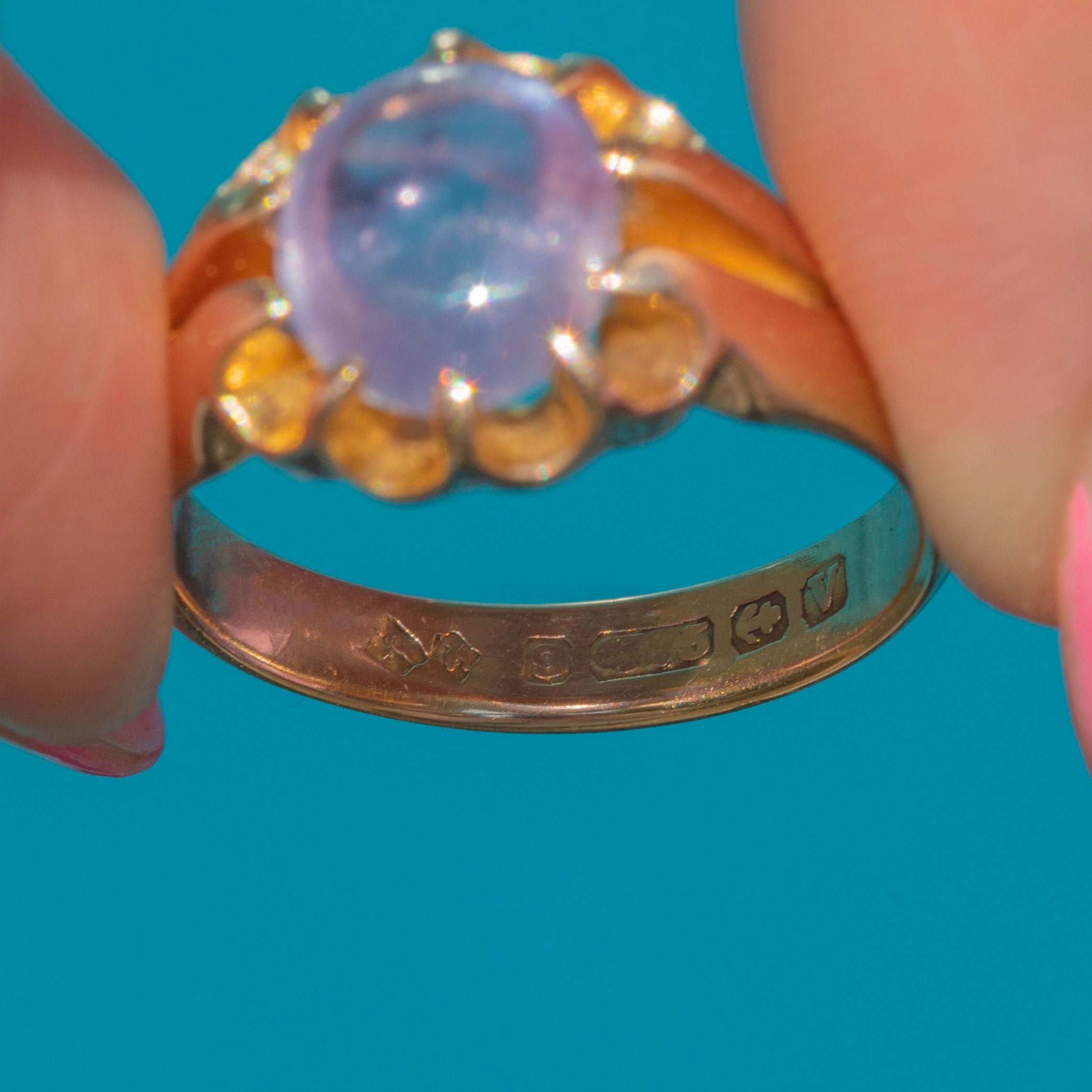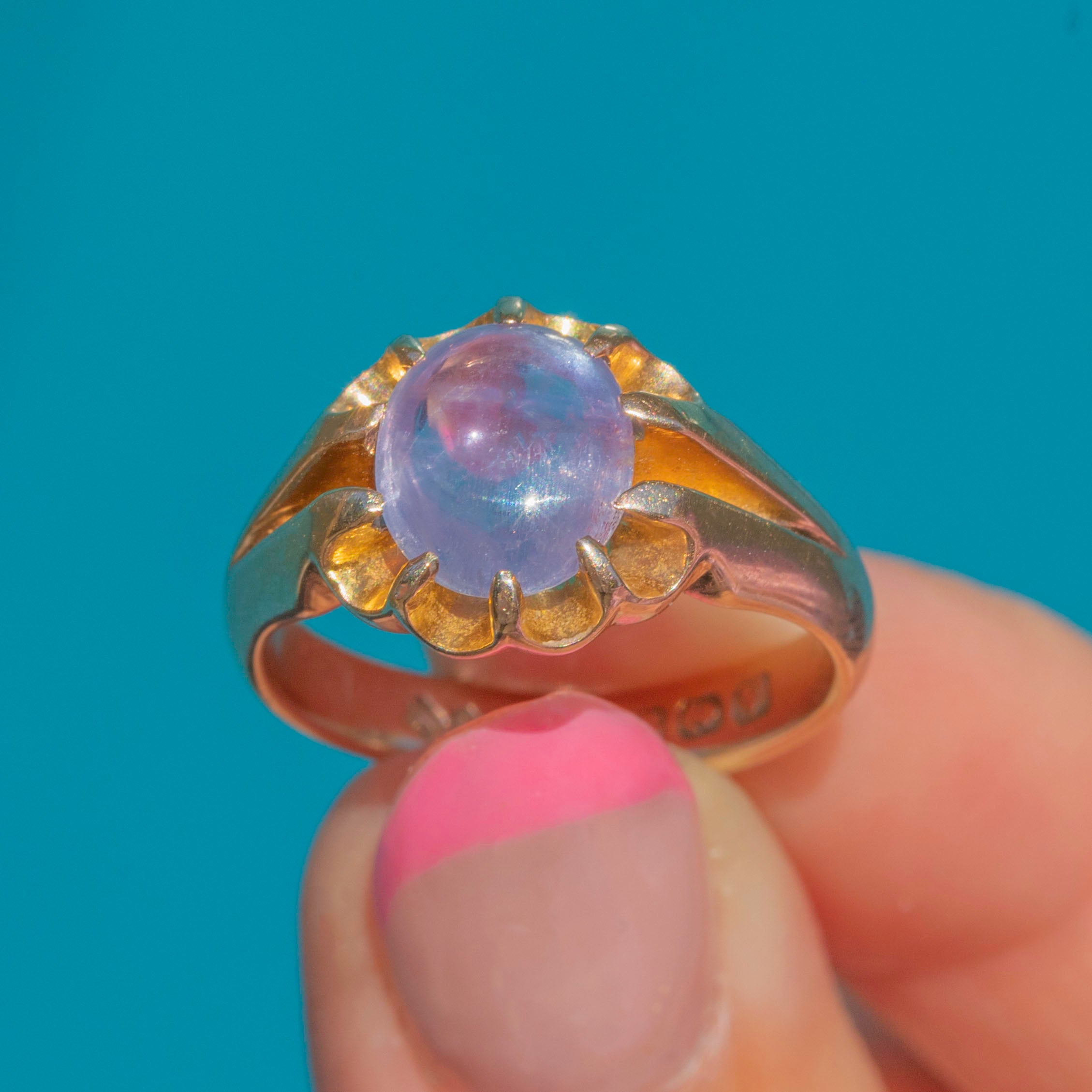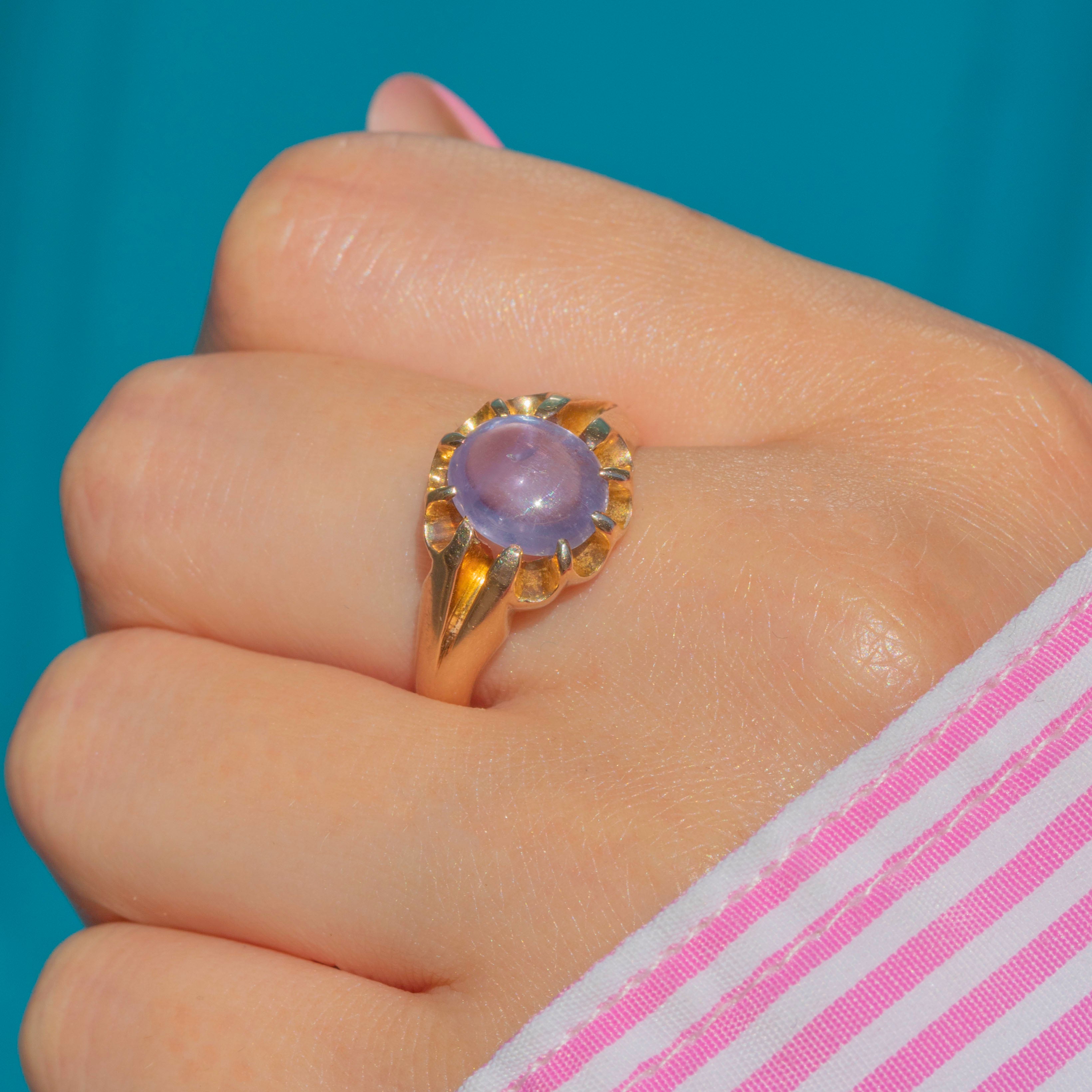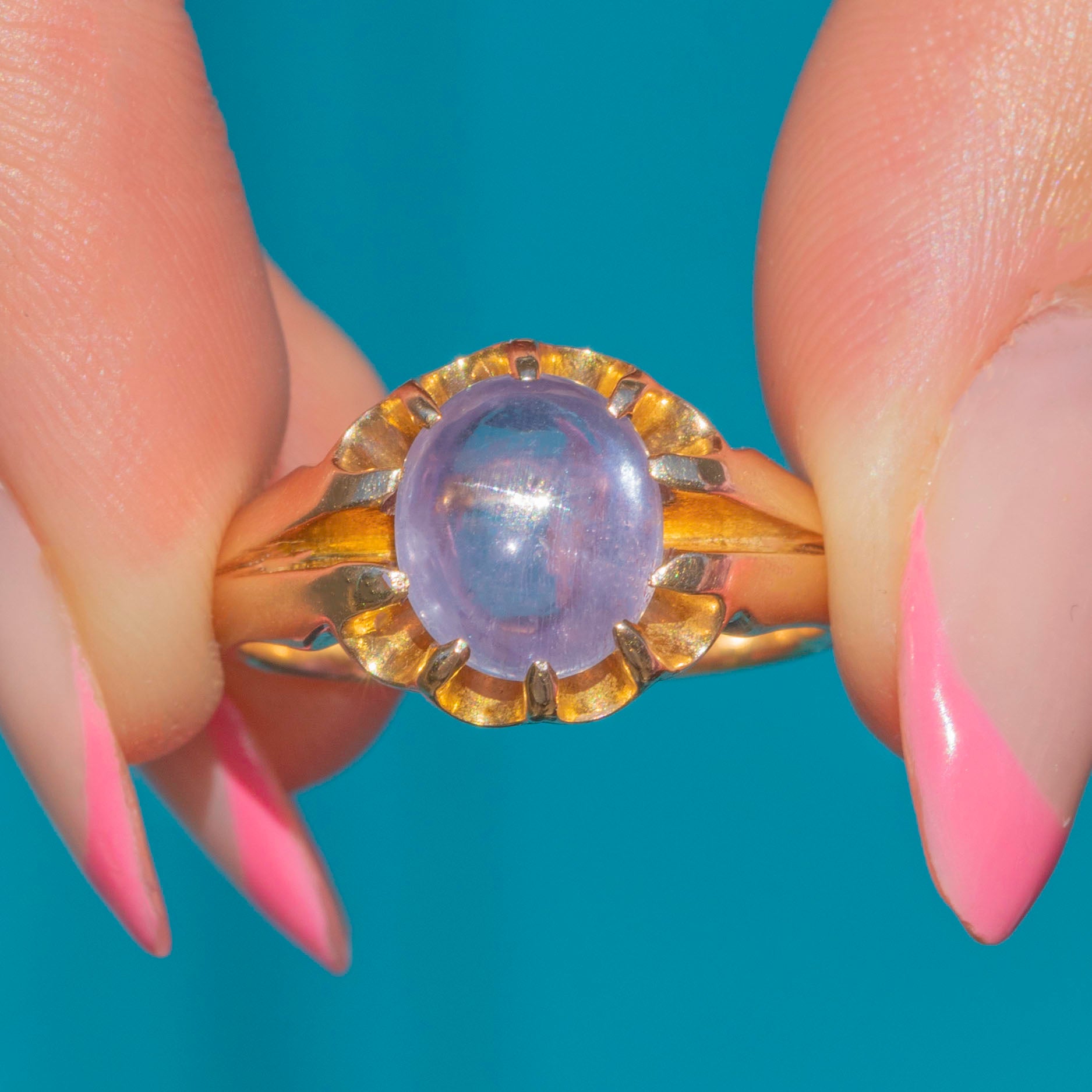 VERY GOOD-EXCELLENT: This chunky antique 9ct Gold lilac Star Sapphire buttercup set ring is in wonderful condition! The Sapphire is set securely within the claw settings, with only one small nick to the cabochon, otherwise, she is smooth to the touch. The Gold is in pristine condition with each claw present, ready to wear straight from your pink Lillicoco box!