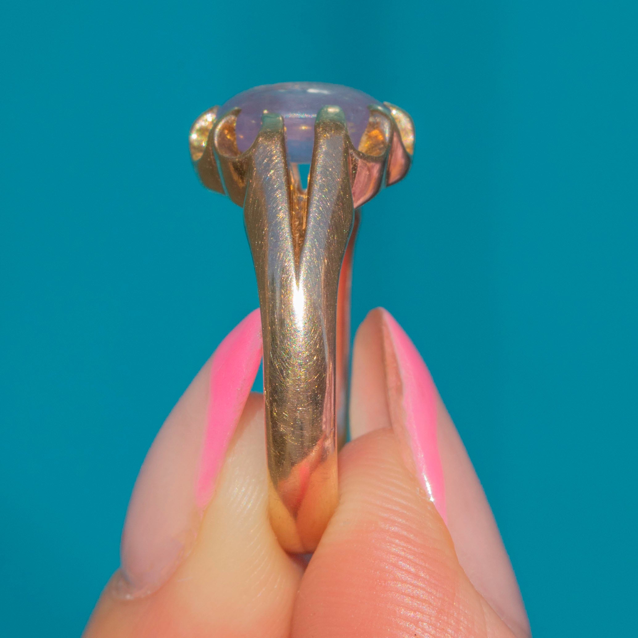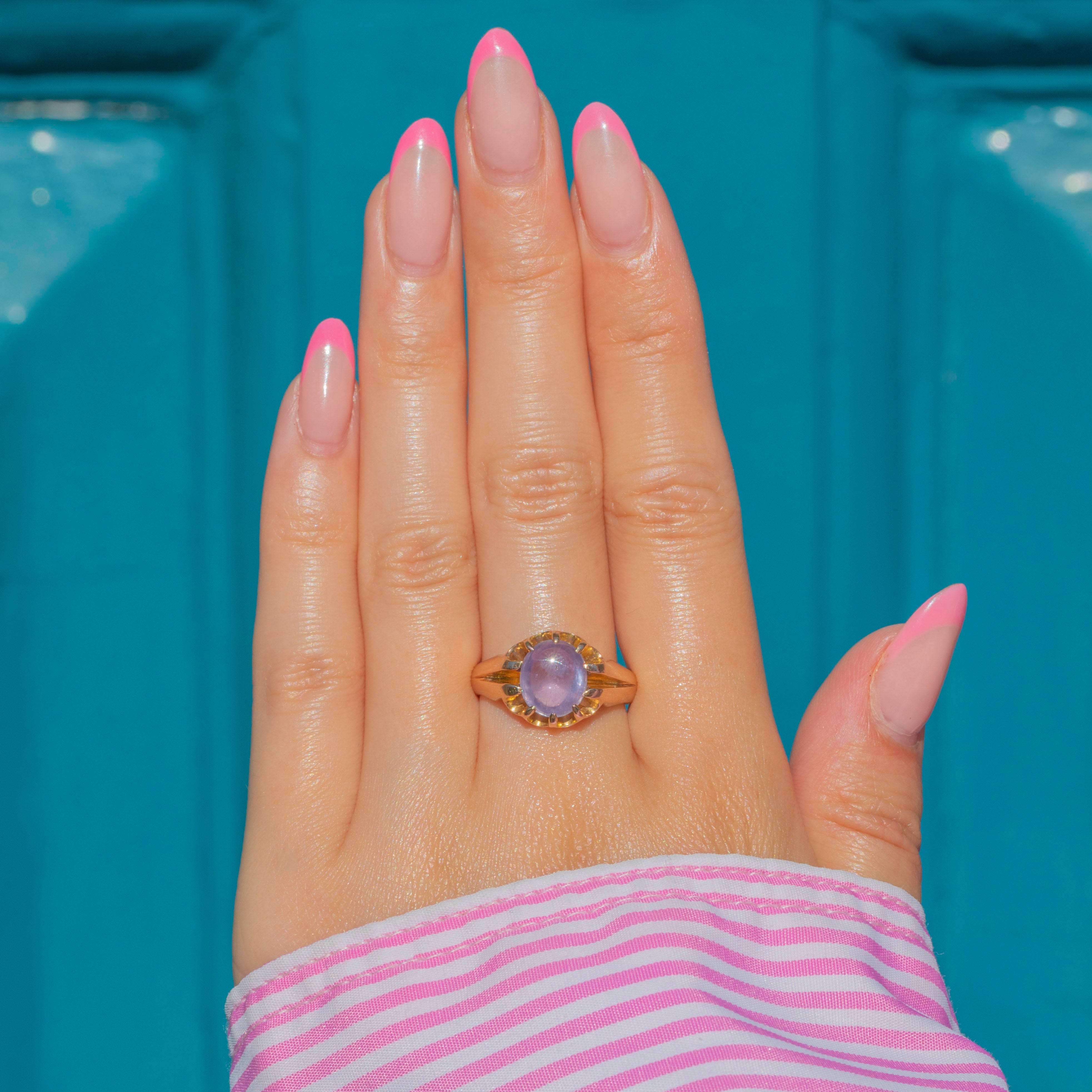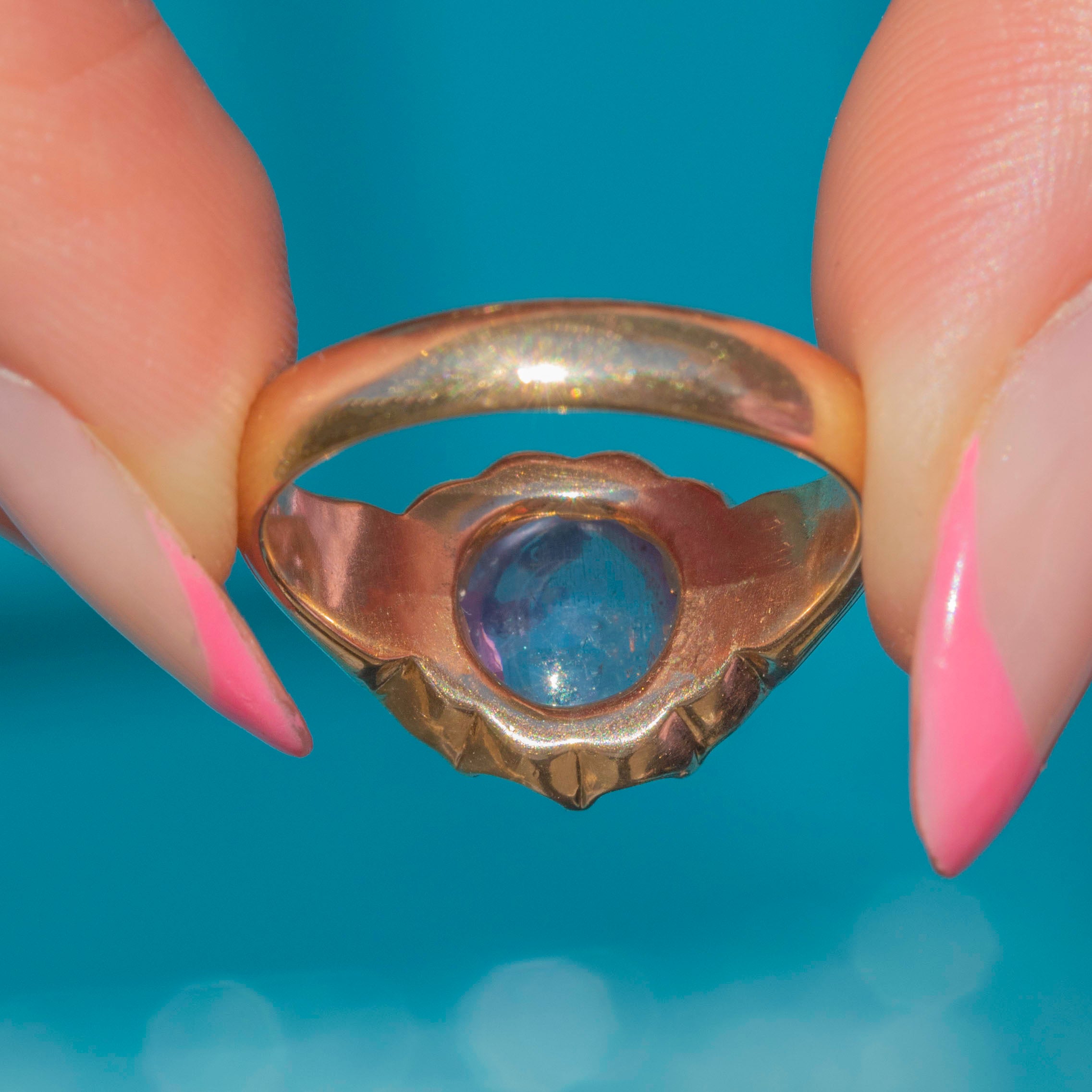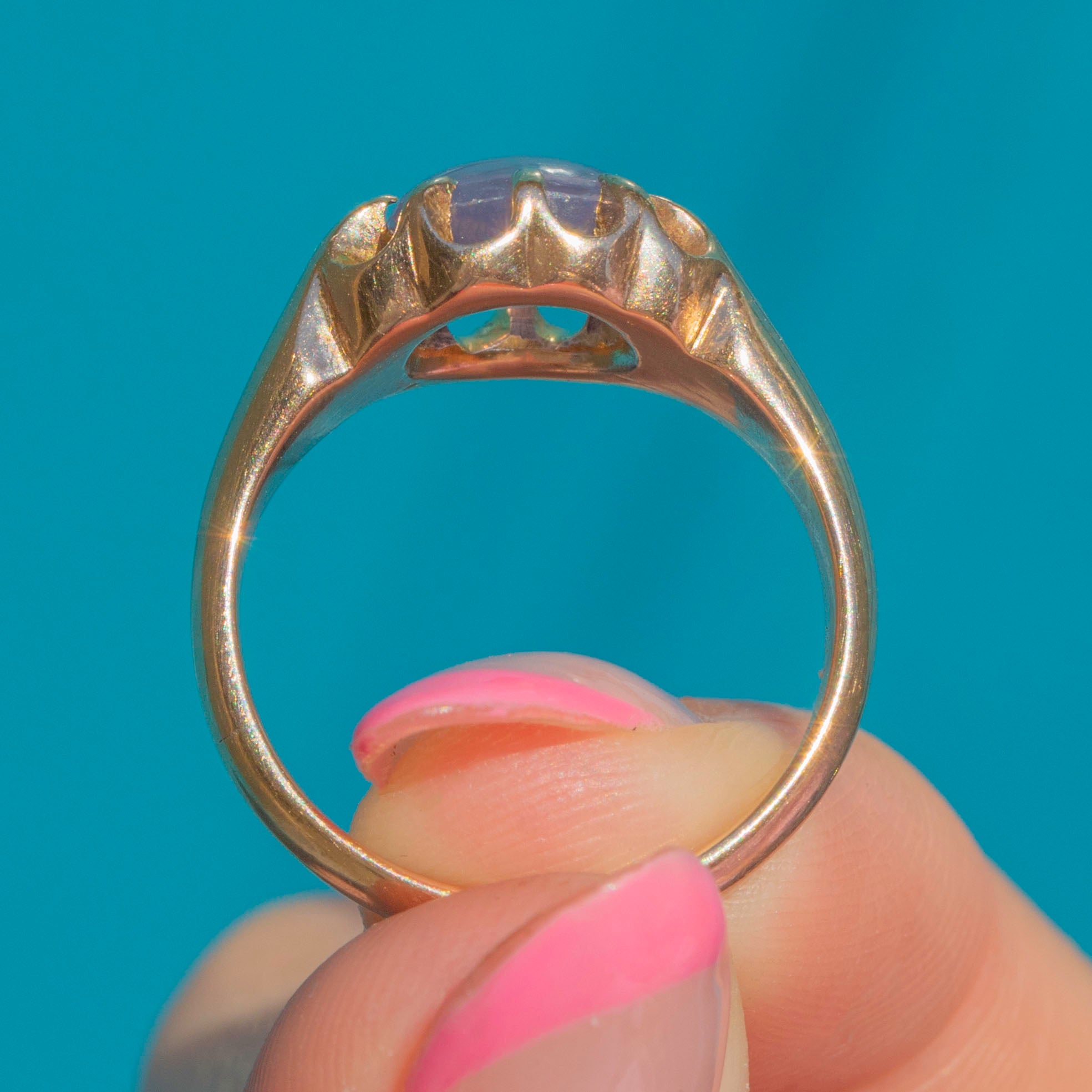 VERY GOOD-EXCELLENT: This chunky antique 9ct Gold lilac Star Sapphire buttercup set ring is in wonderful condition! The Sapphire is set securely within the claw settings, with only one small nick to the cabochon, otherwise, she is smooth to the touch. The Gold is in pristine condition with each claw present, ready to wear straight from your pink Lillicoco box!