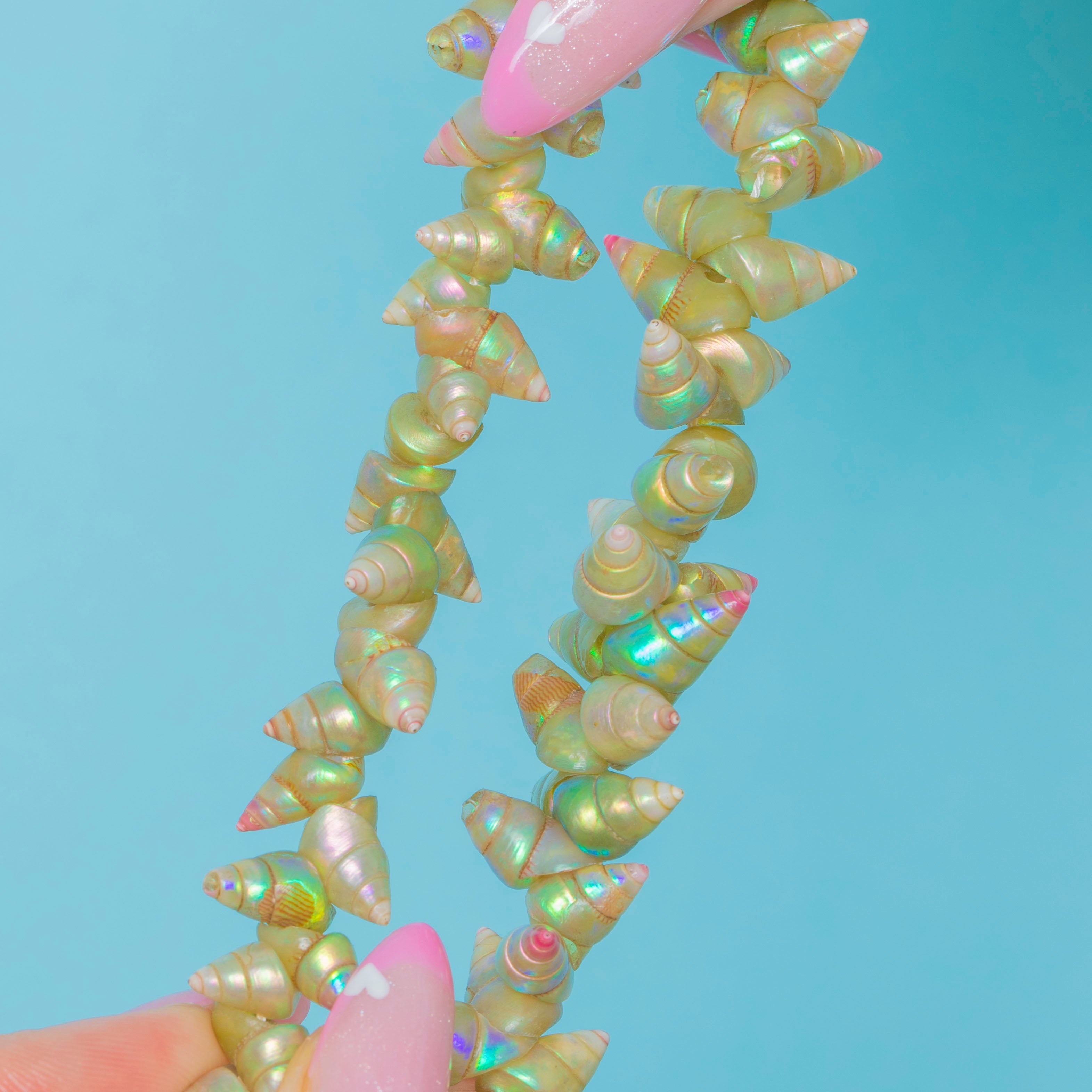 This striking Victorian necklace is strung with naturally iridescent Tasmanian Maireener shells, prized for their distinctive lustre and subtle colour variations. The shells graduate beautifully in size, forming an organic rhythm along the neckline and fastening with a charming pierced star barrel clasp typical of 19th-century craftsmanship.