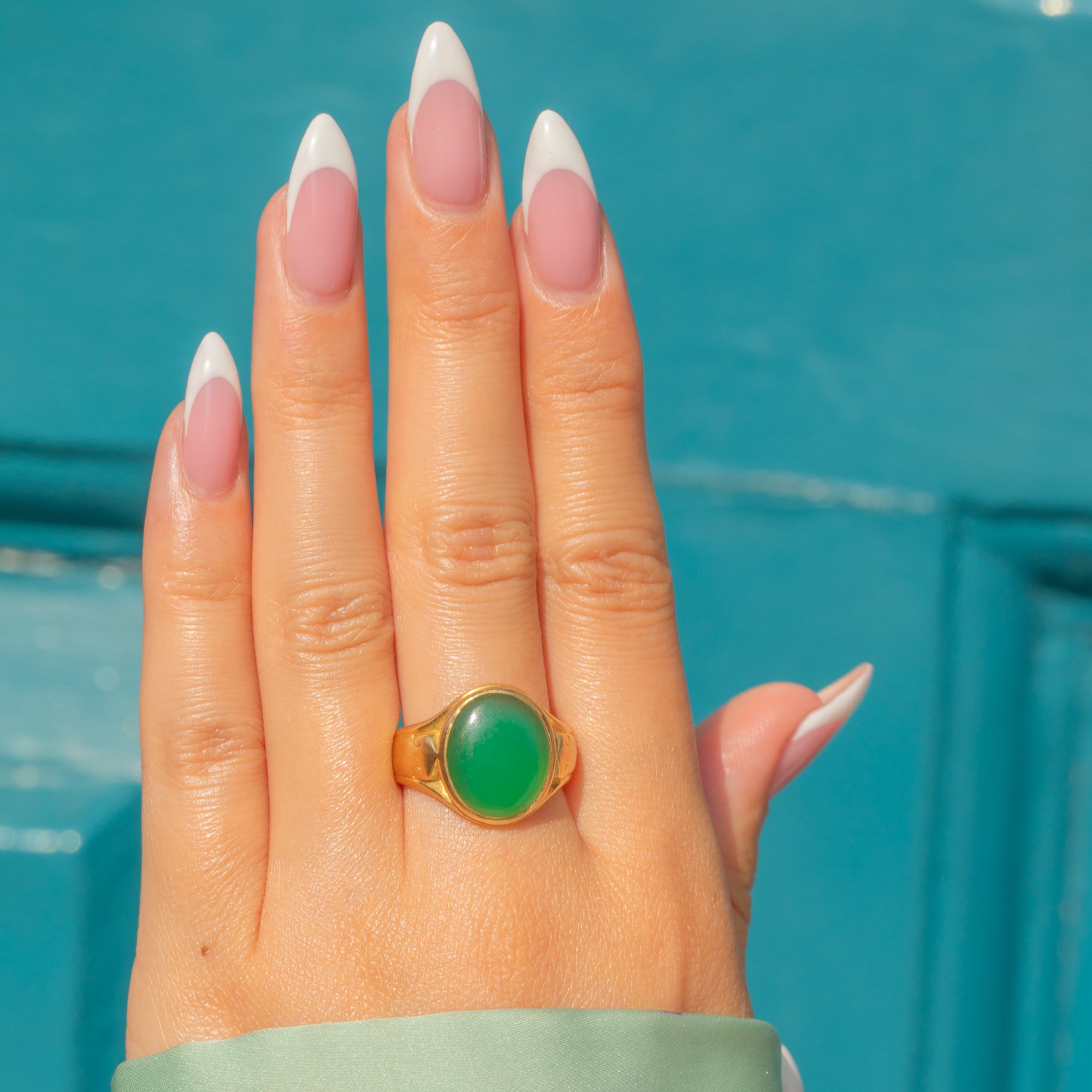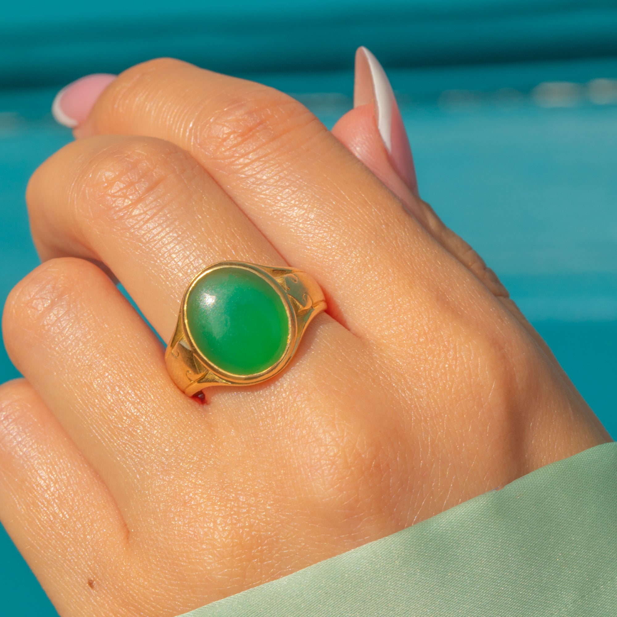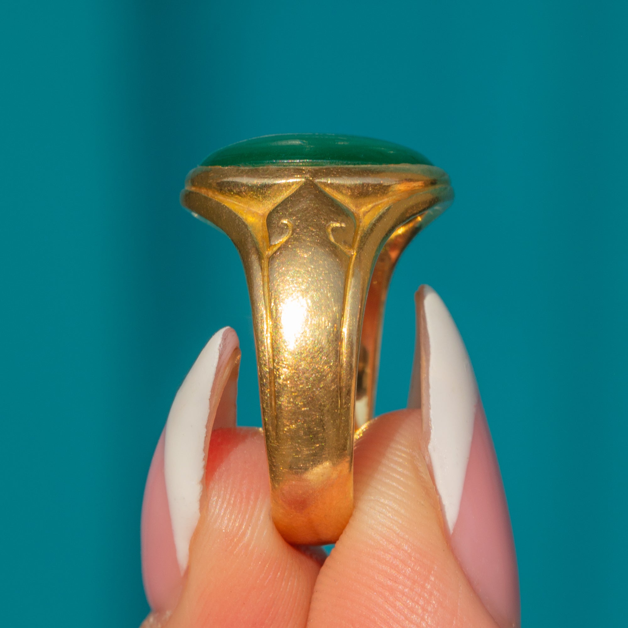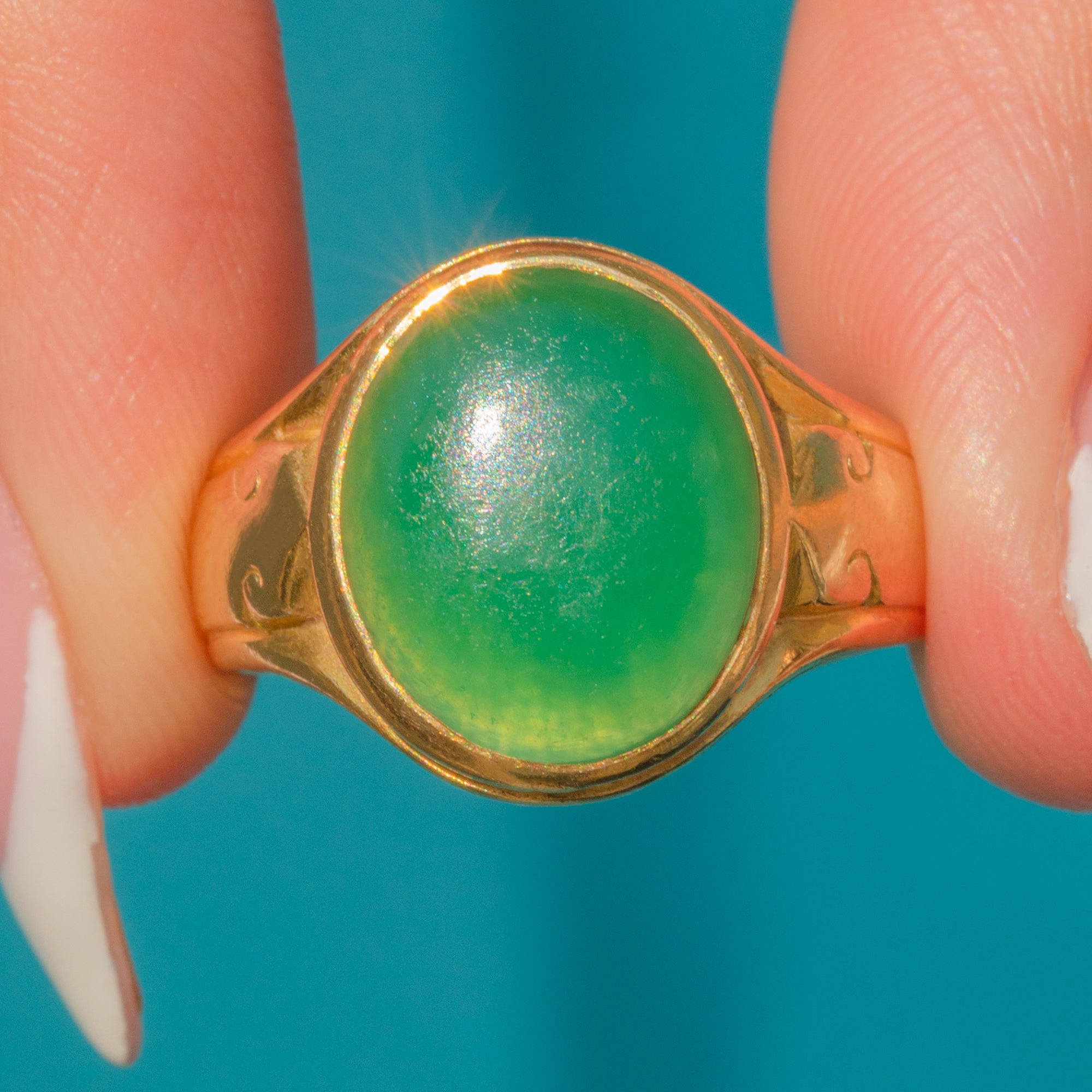 This Victorian ring features a vibrant Chrysoprase set in 18ct Gold, offering a striking pop of green in a classic antique silhouette. The richly coloured stone is the focal point, complemented by a sleek, softly domed band.