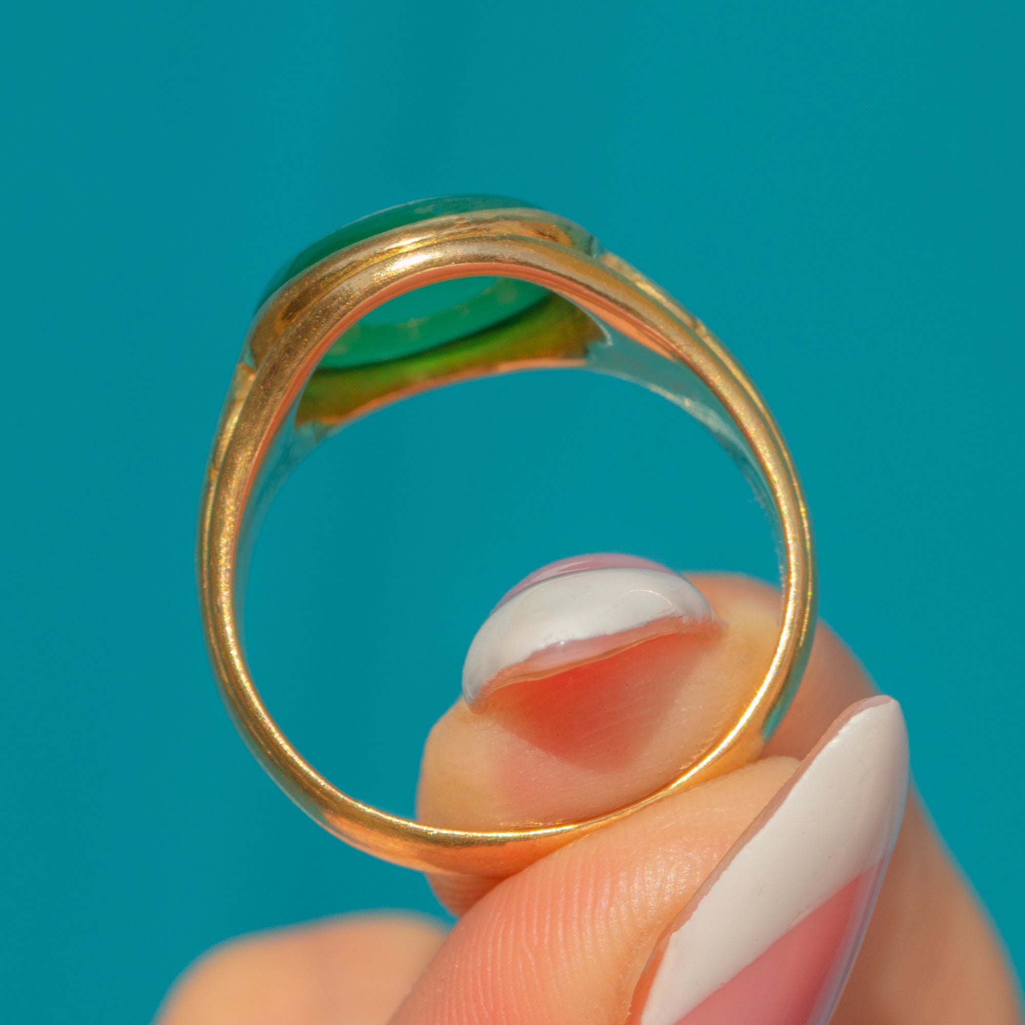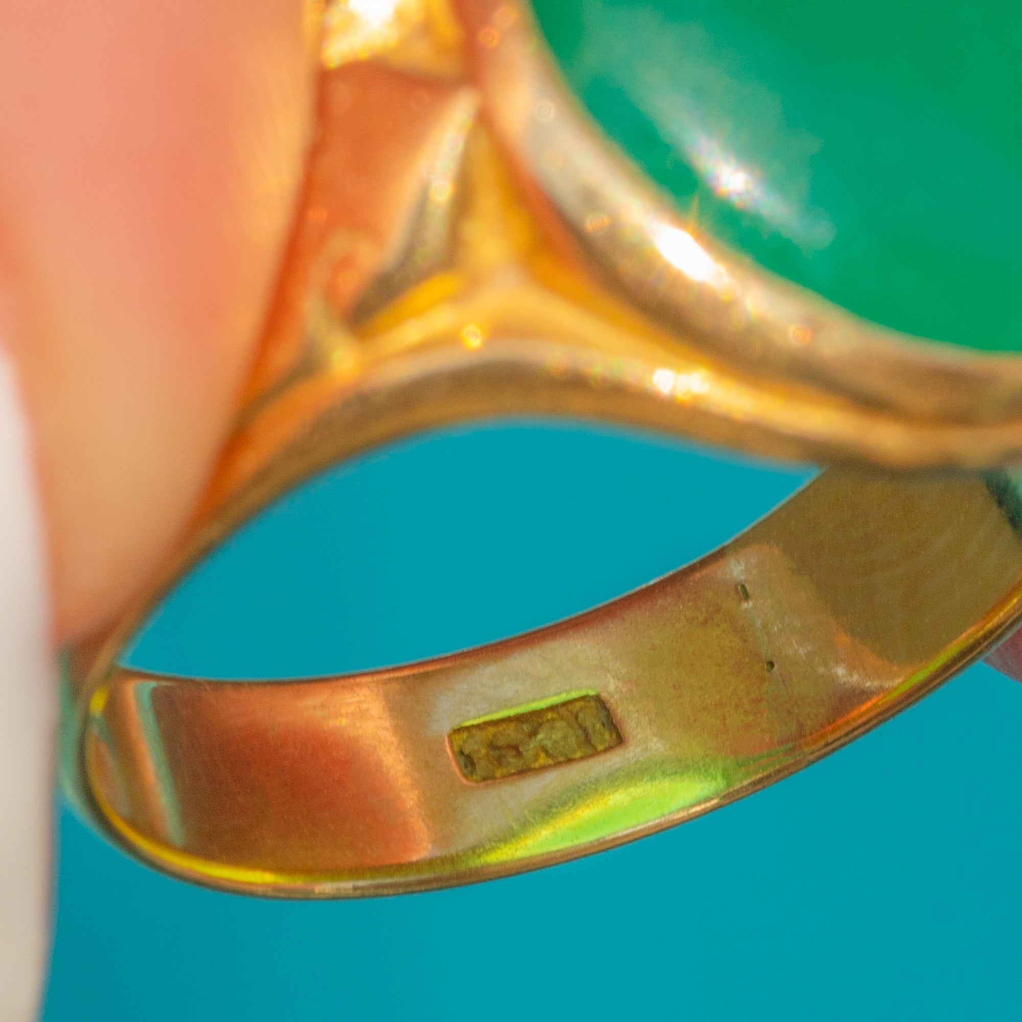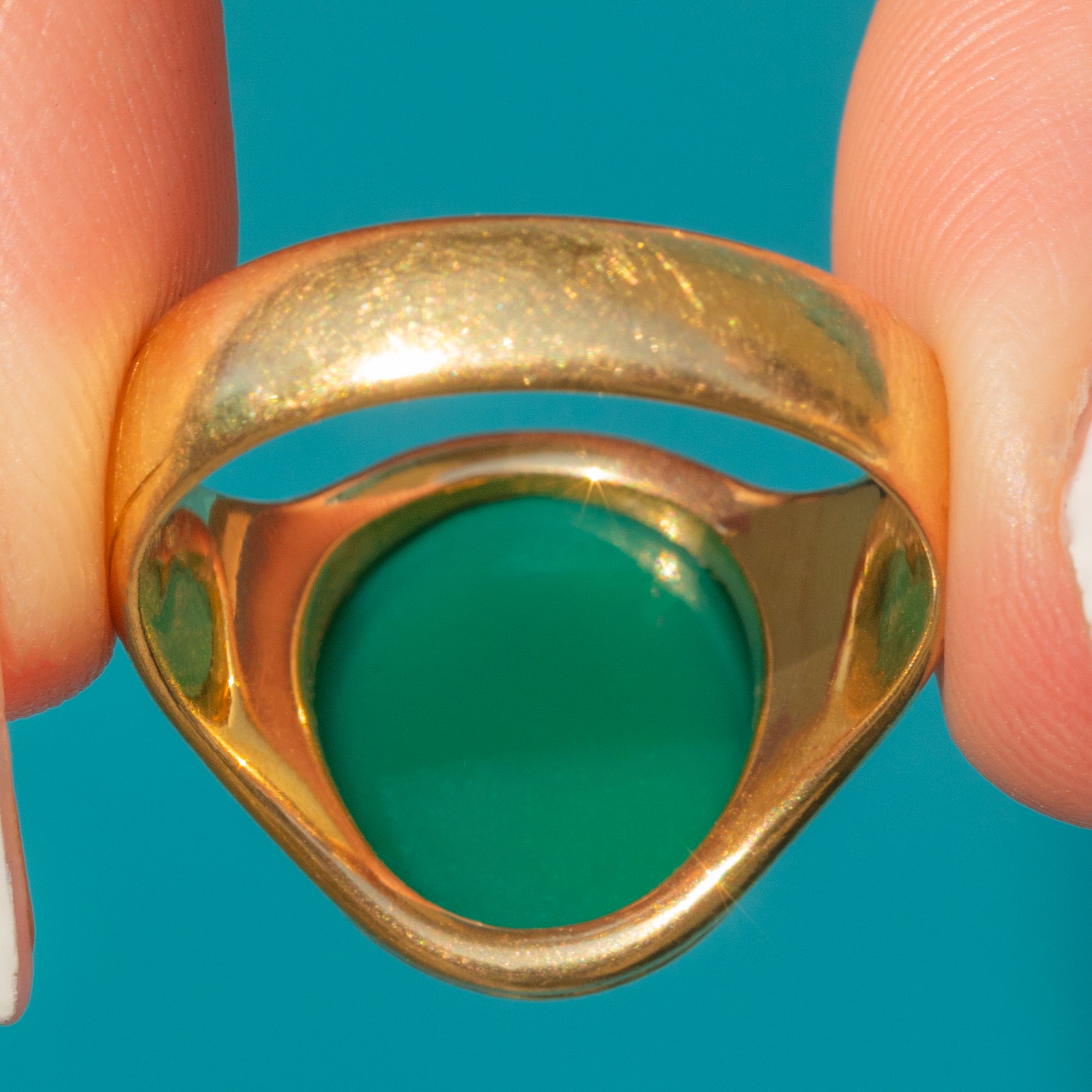 EXCELLENT: The Chrysoprase is free from chips or scratches, and the Gold band shows no signs of wear. The ring has been very well cared for, retaining its original brilliance.