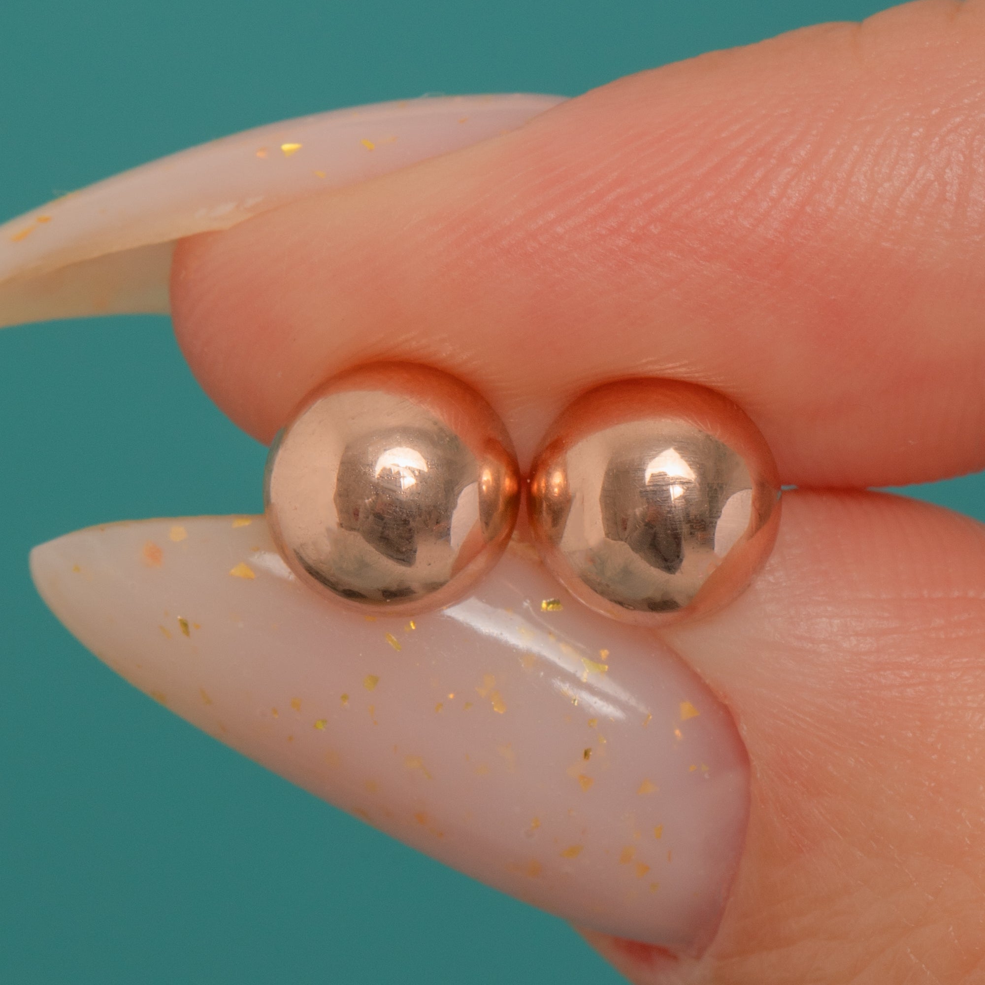 Understated and irresistibly classic, these vintage 9ct Rose Gold stud earrings are plump, softly domed buttons with a mirror-bright polish. Their smooth, minimalist silhouette captures the sleek elegance of mid-century design in a timeless, easy-to-wear form.
