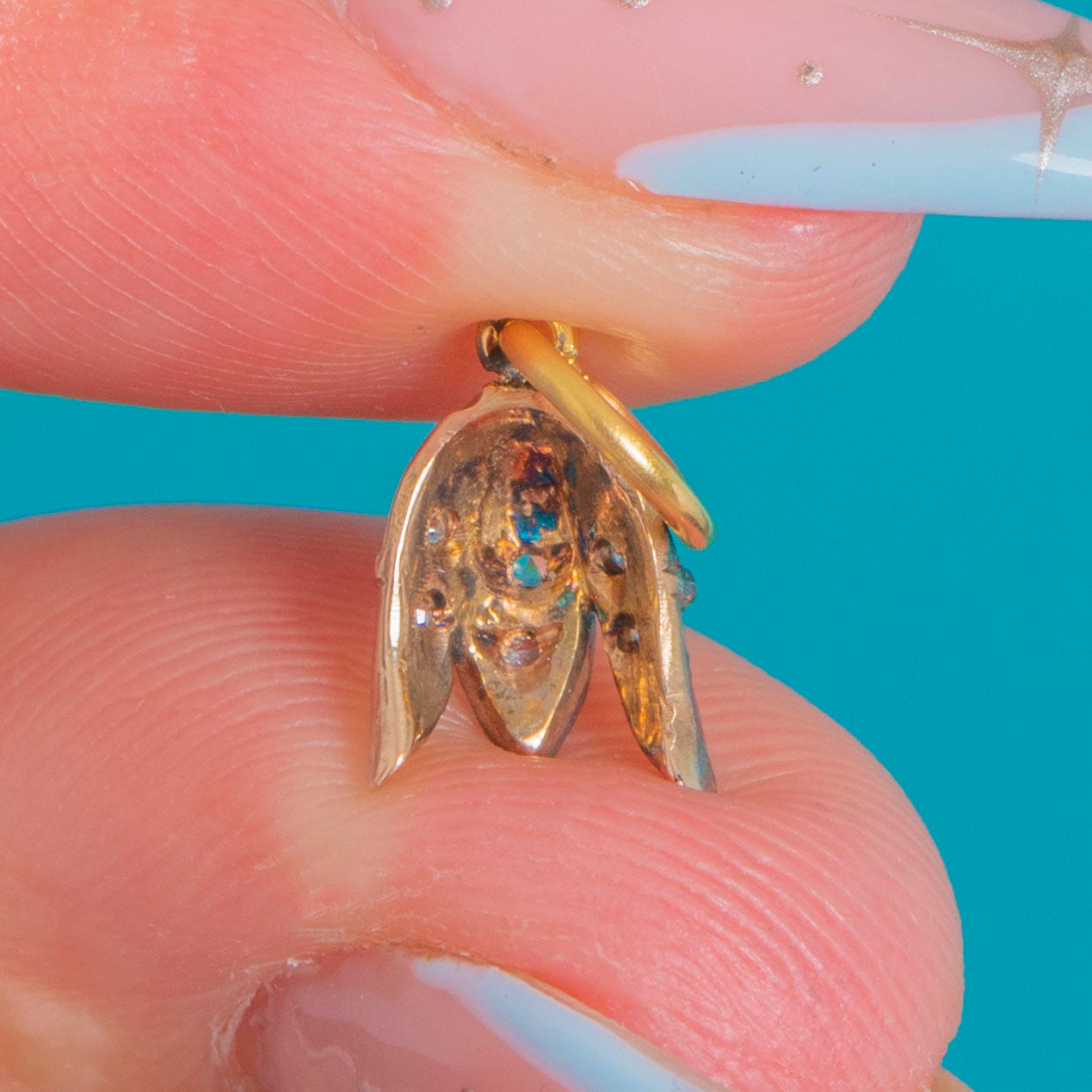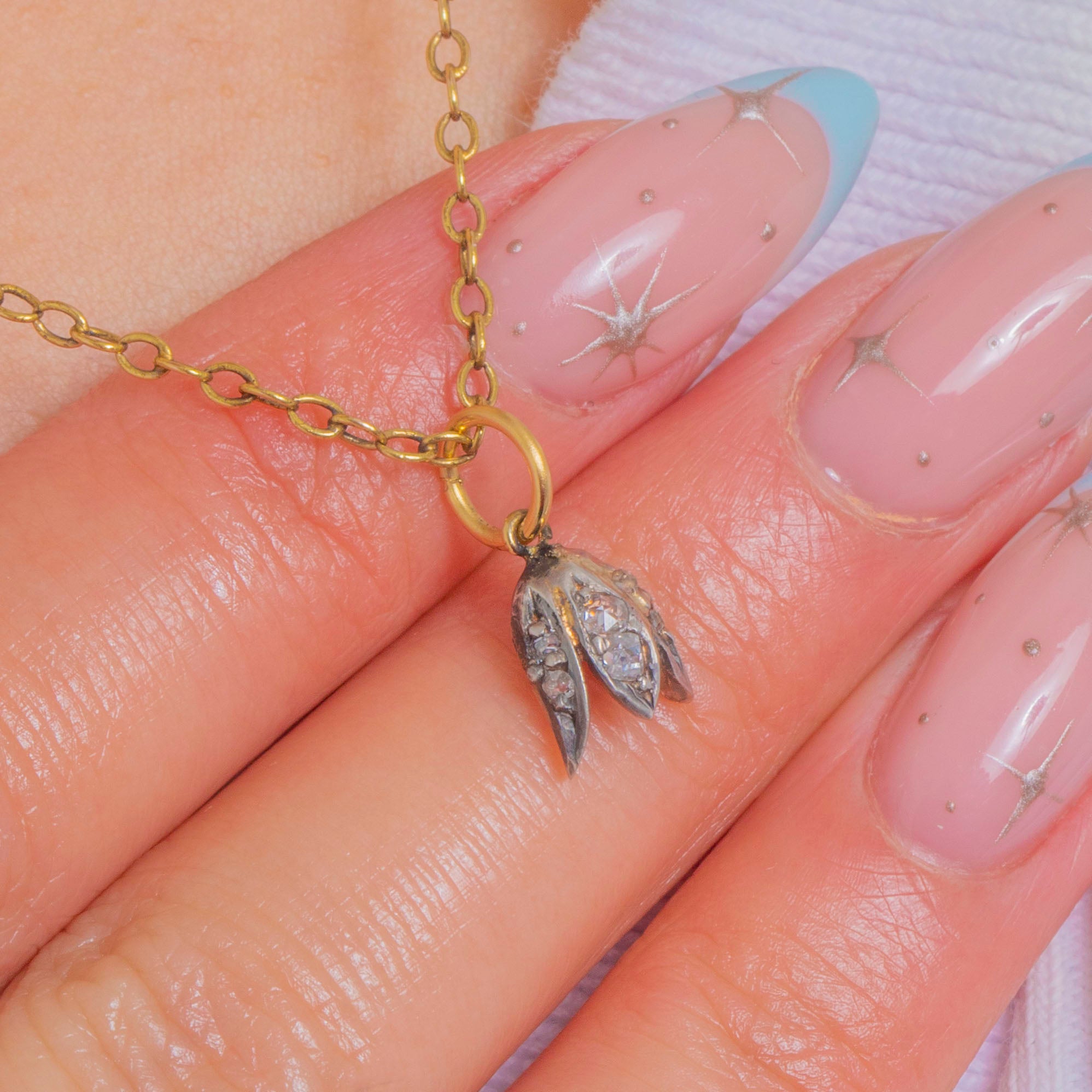 A dainty Victorian treasure, this tiny flower charm is fashioned as a three‑petalled bud, its softly domed petals Silver‑topped and set with twinkling rose-cut Diamonds. The two‑tone palette—cool Silver over warm 18ct Gold—creates that coveted antique shimmer, delicate yet distinctive.