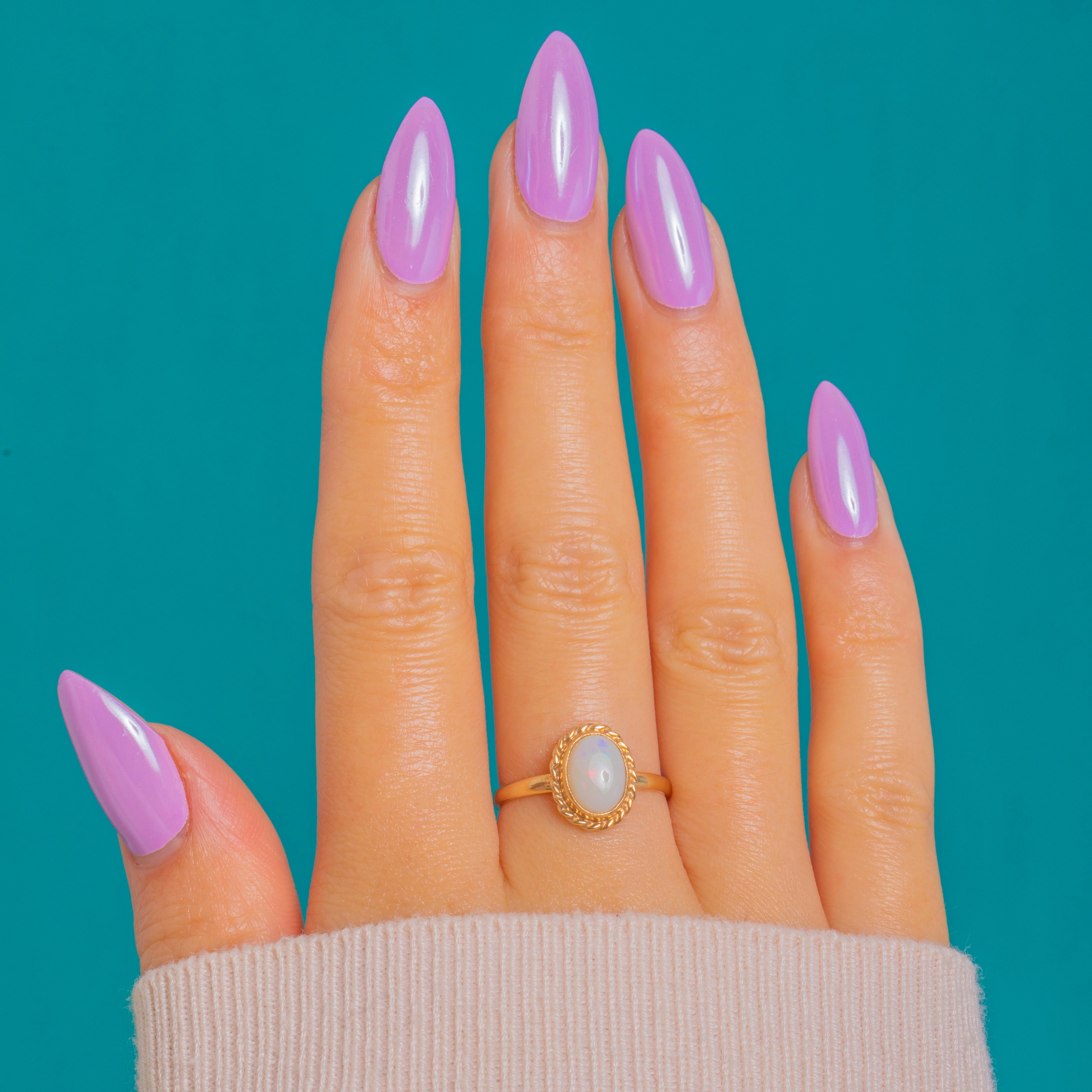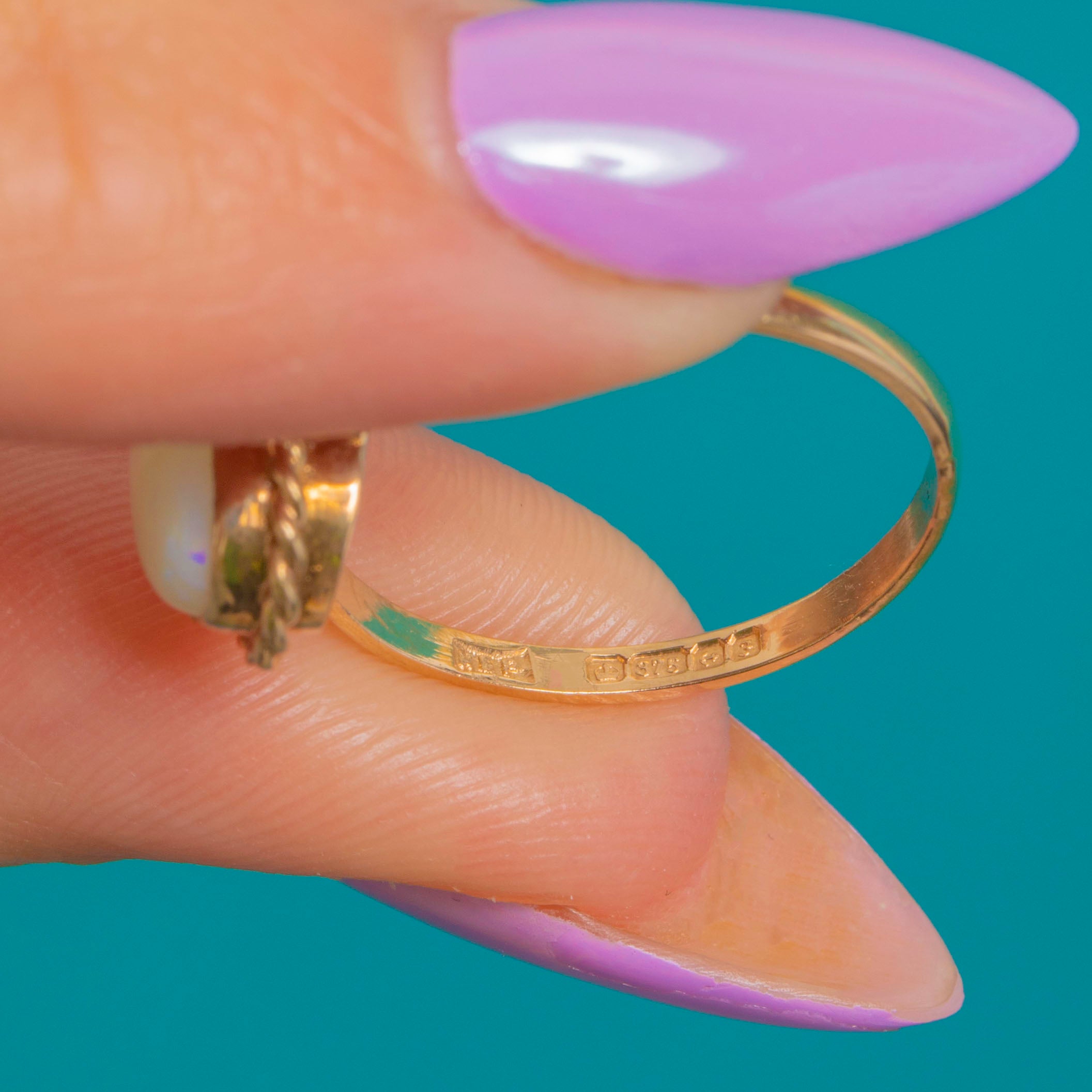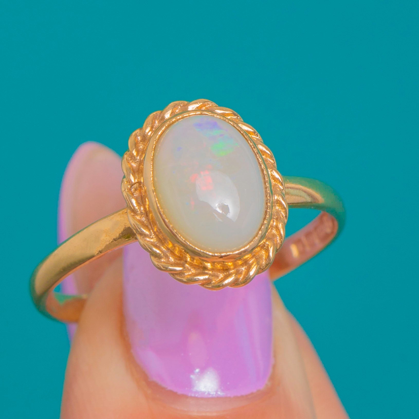 Petite and poised, this Vintage 9ct Gold ring showcases a natural solid Opal cabochon bezel-set within a charming twisted-rope border. The Opal’s creamy body shimmers with delicate flashes of red, green, blue and hints of orange, lending a soft, ethereal glow against the warm Yellow Gold.
