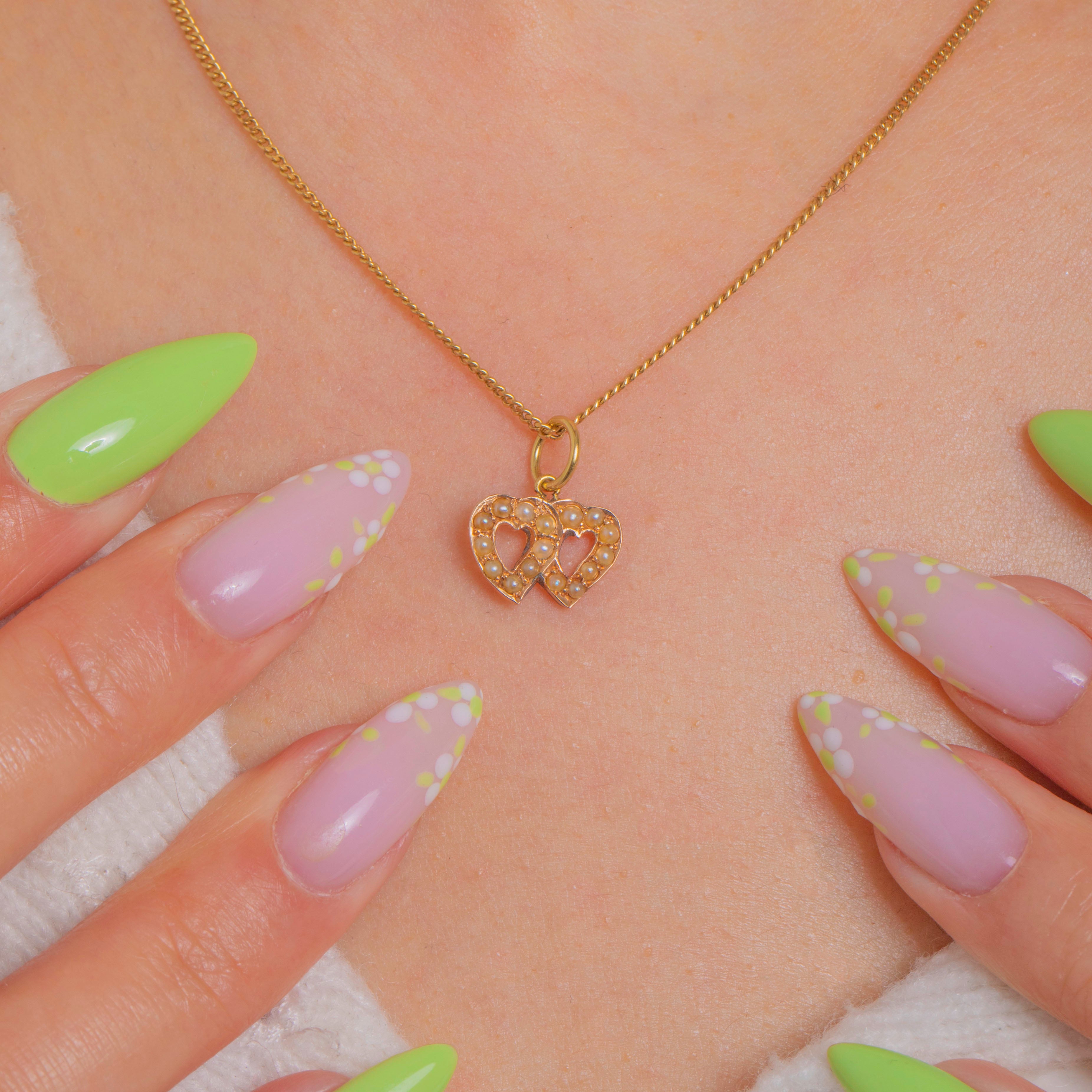 Romantic and refined, this dainty Victorian double Witches’ heart charm is sculpted in glowing 15ct Gold and edged with a luminous halo of tiny Seed Pearls. The openwork hearts sit sweetly side-by-side, their softly curving outlines brought to life by a delicate, even row of creamy gems.