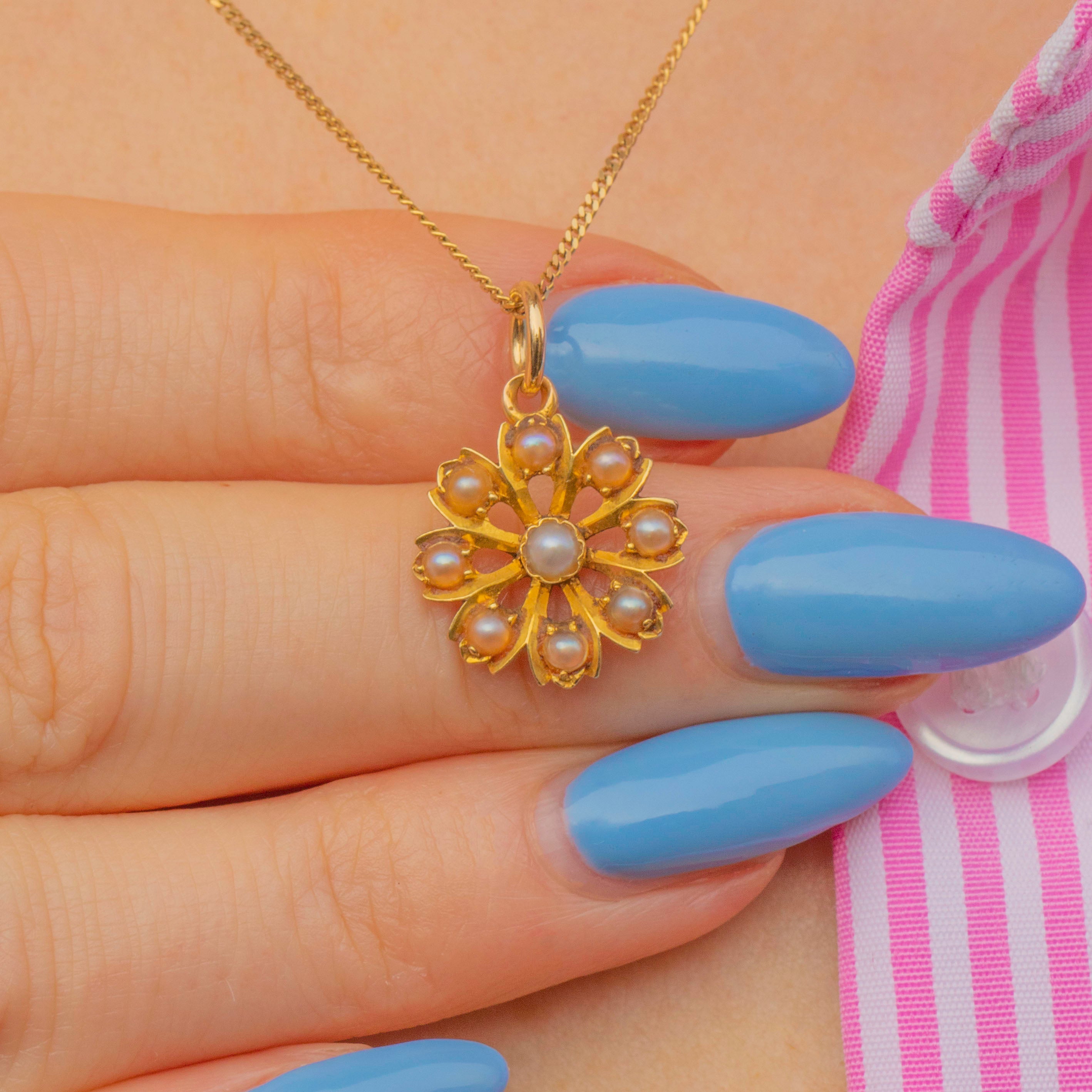 Adorned with iridescent Pearls, this Edwardian flower pendant catches the light wonderfully. Her 18ct Gold is lustrous, securely holding the Pearls in place.
