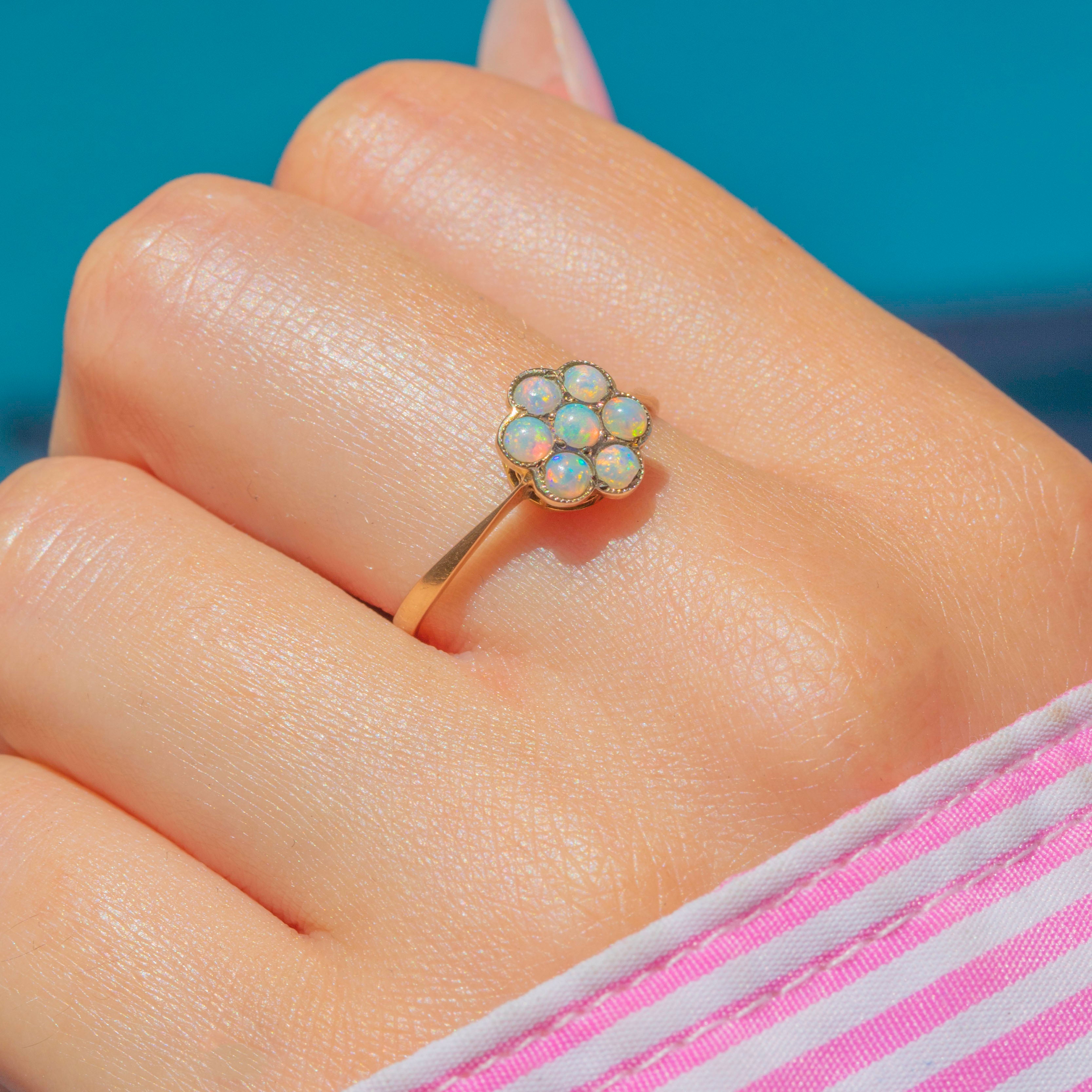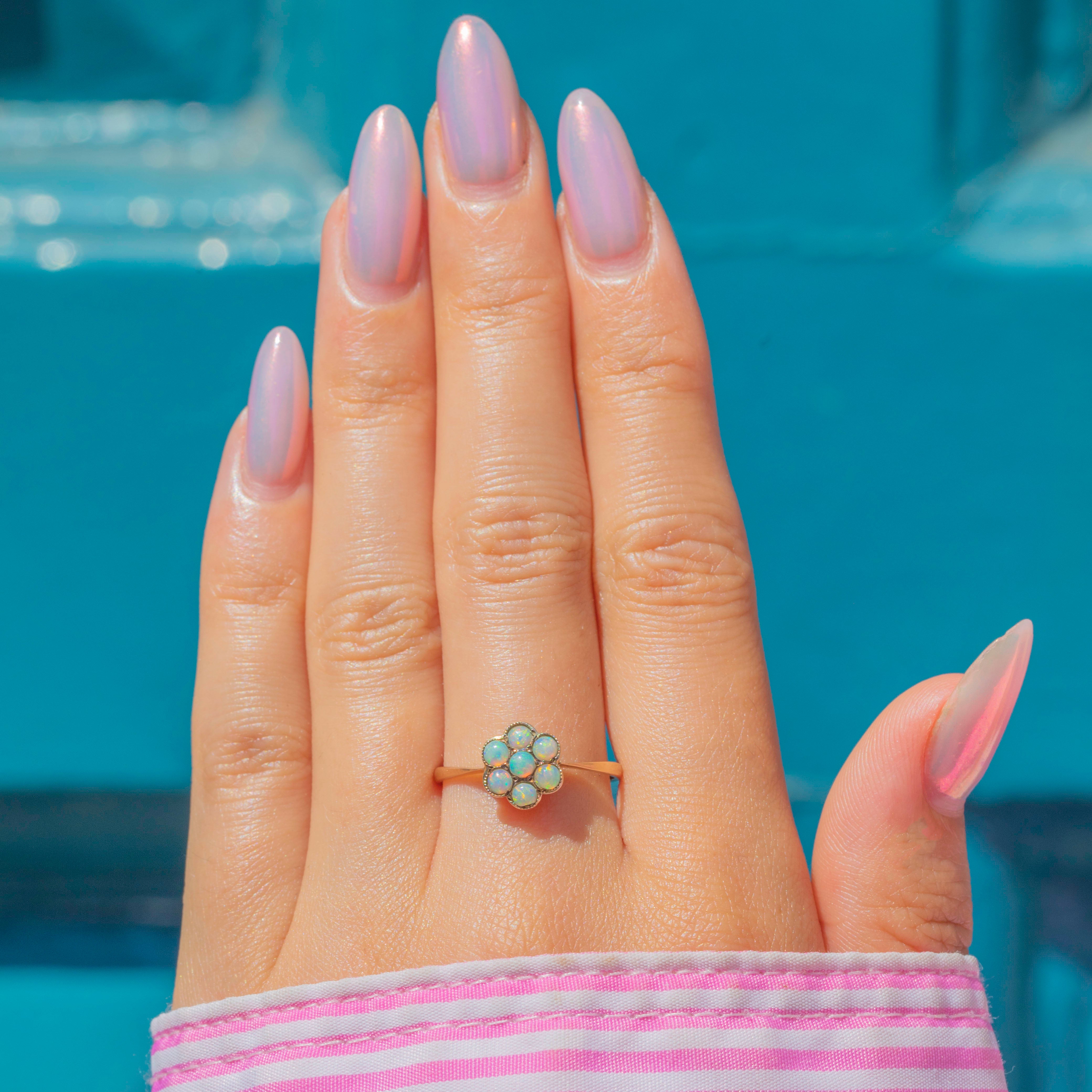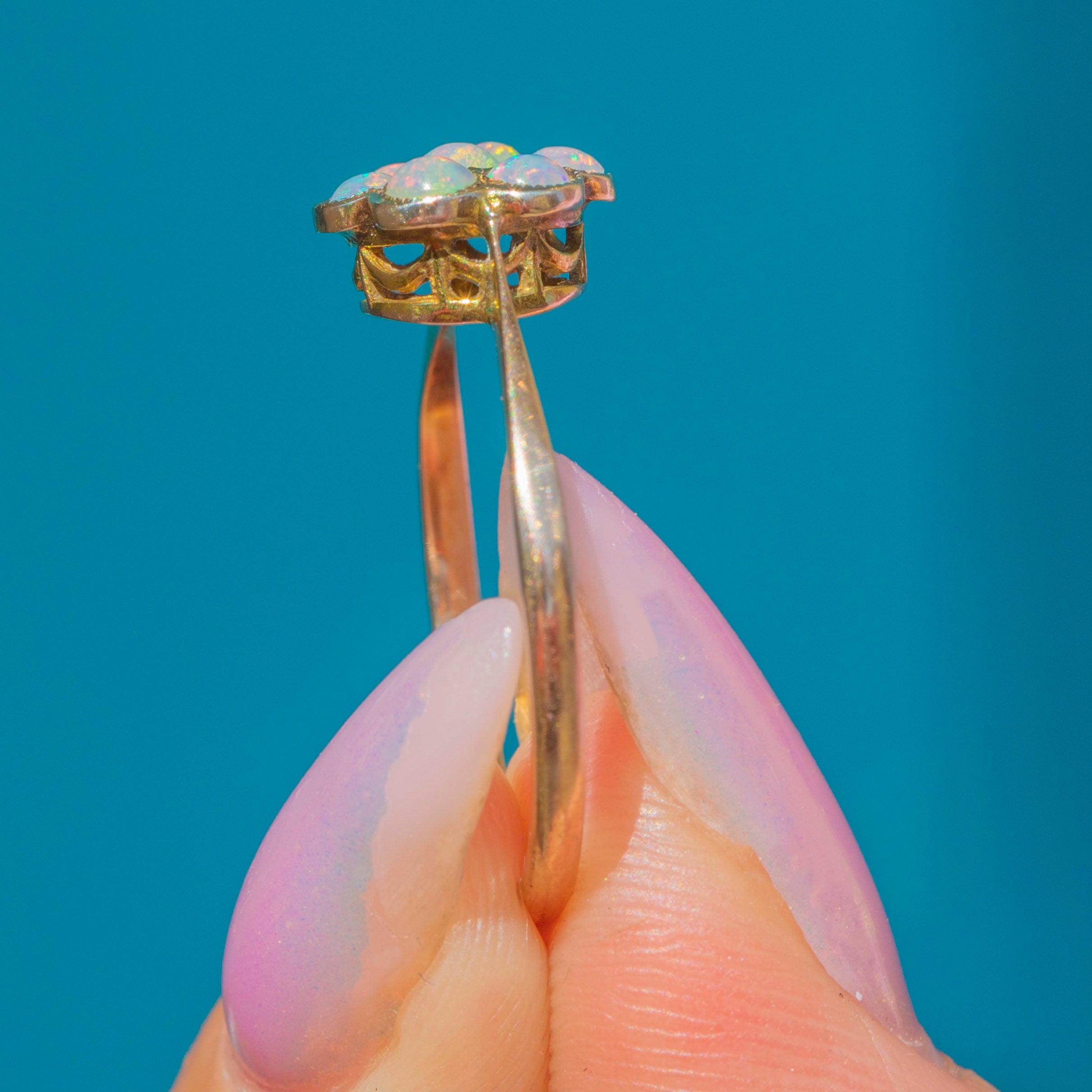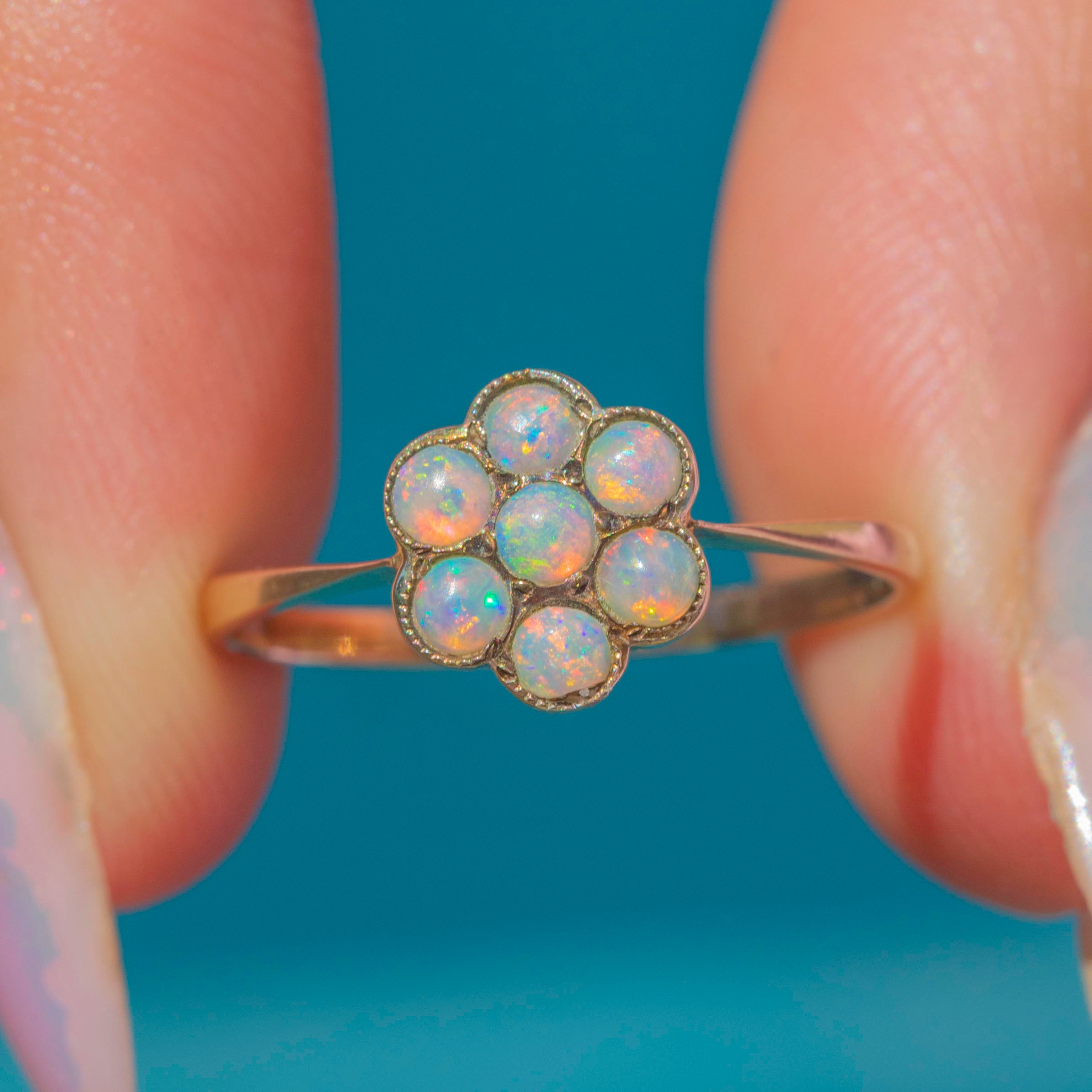 This mesmerising Victorian ring displays seven Opals arranged into a floral cluster, resting on a 9ct Gold band!