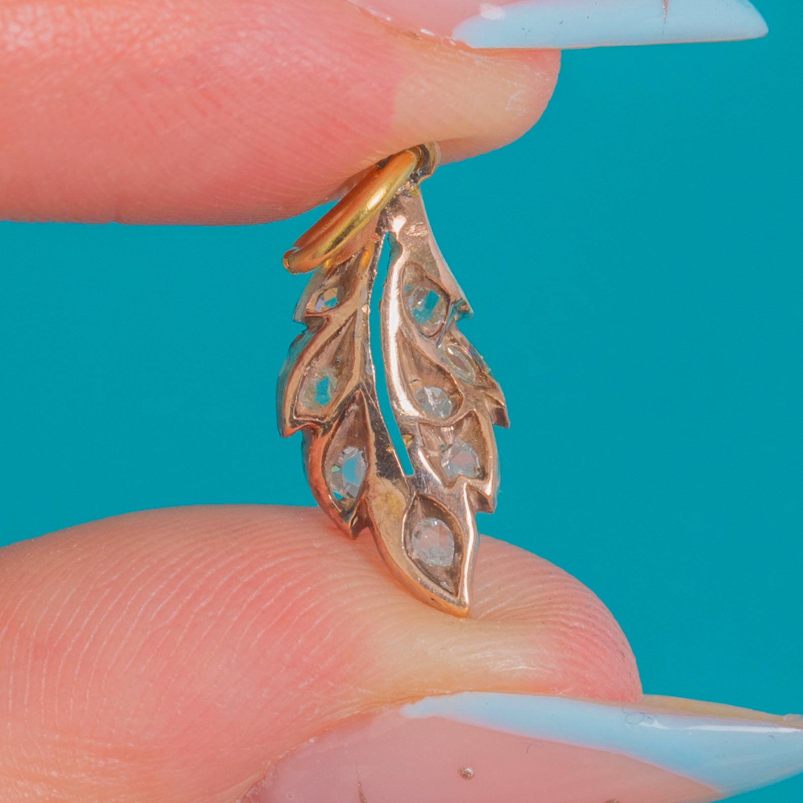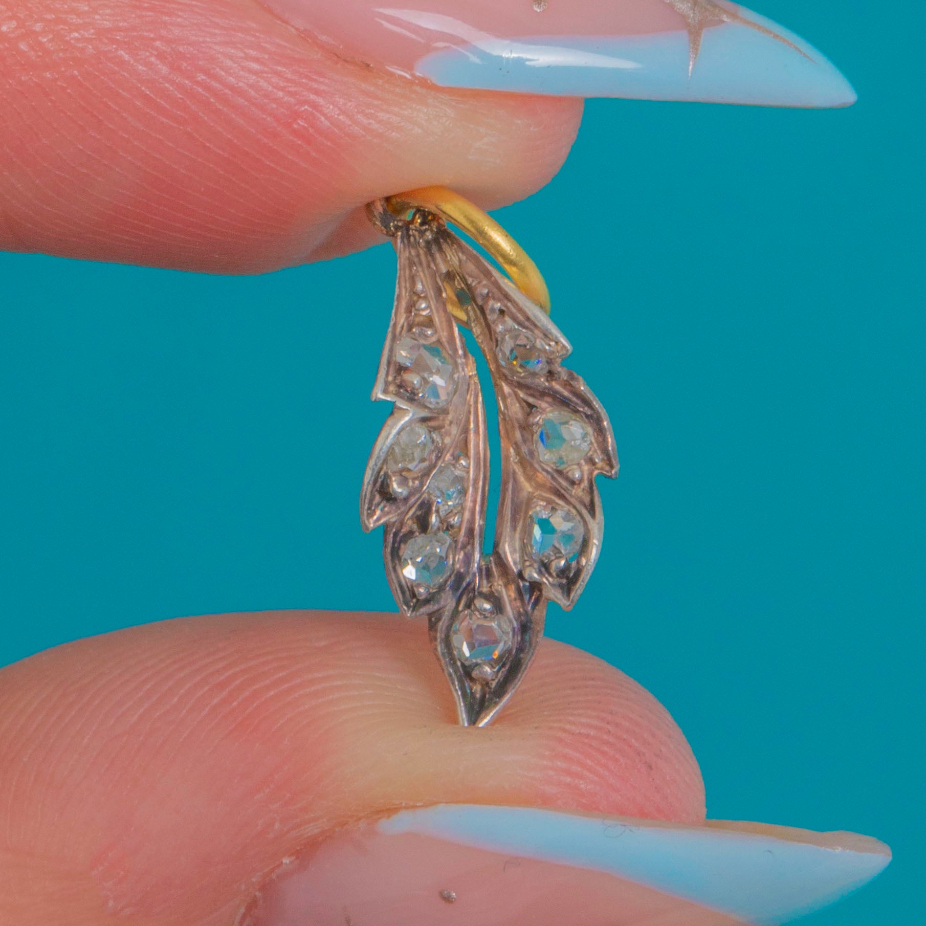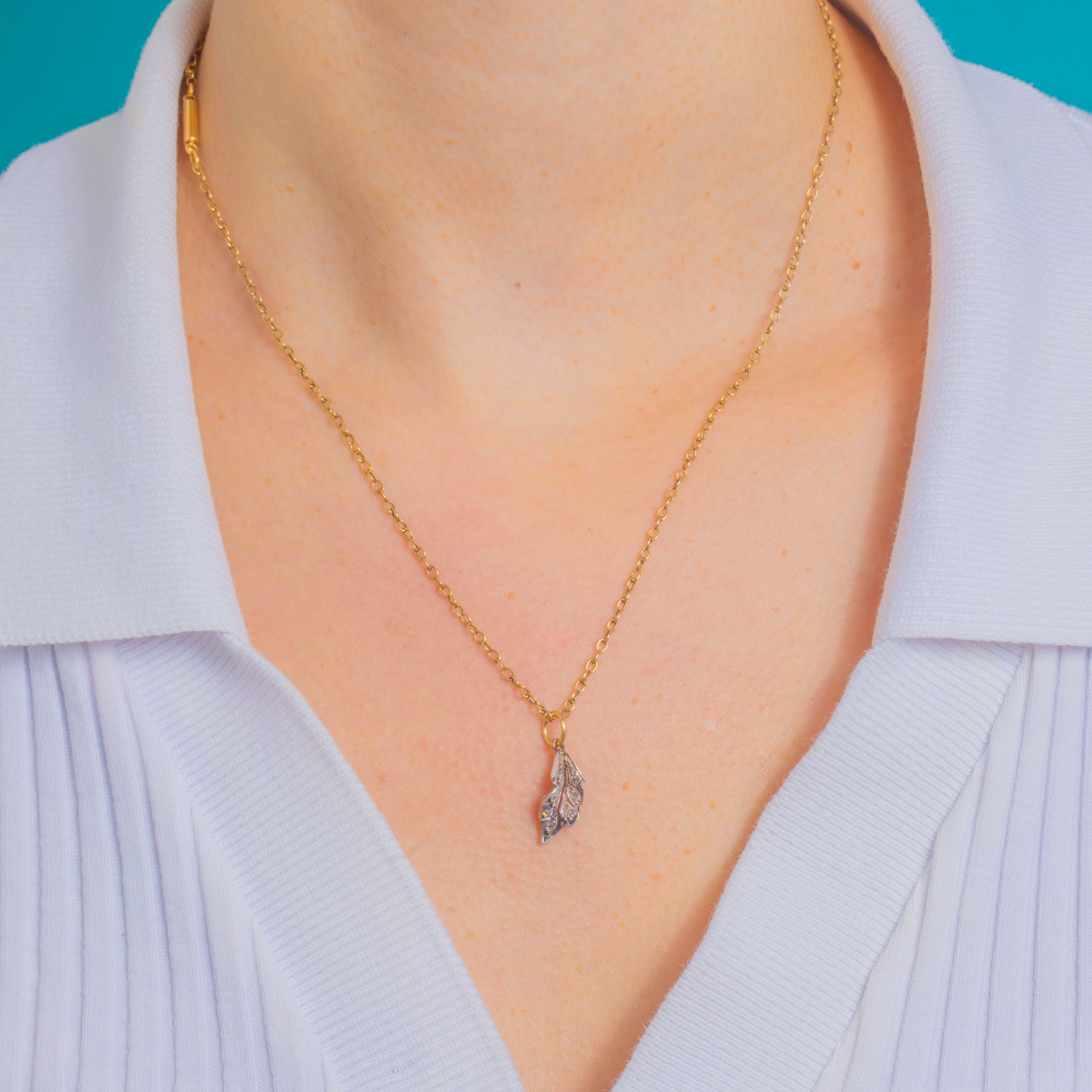 A perfectly dainty Victorian leaf charm, set with glittering rose-cut Diamonds that catch the light with that unmistakable old-world sparkle. With its elegant, nature-inspired silhouette, it’s the kind of piece that adds instant character—whether worn solo on a fine chain or layered into a curated charm story.
