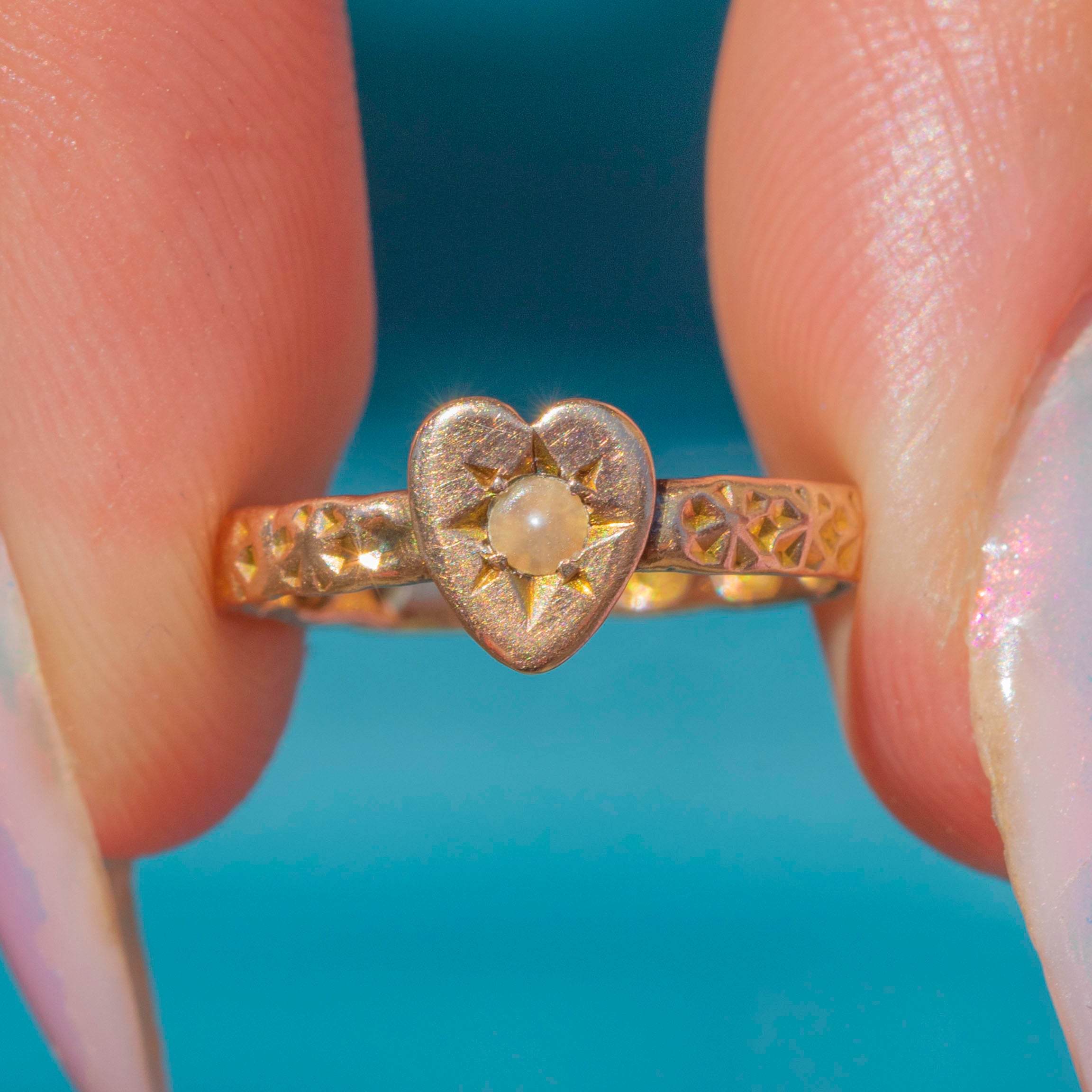 GOOD-VERY GOOD: This dainty Victorian 9ct Gold heart pinky ring is in good to very good condition. There is notable signs of wear to the Gold and her Pearl is less lustrous than she once was and her band has taken on a gentle curve with time . However, this ring is dated to 1898 and considering her age, is a lovely piece! Her Gold has remained warm and with gorgeous engravings, she is an antique beauty.