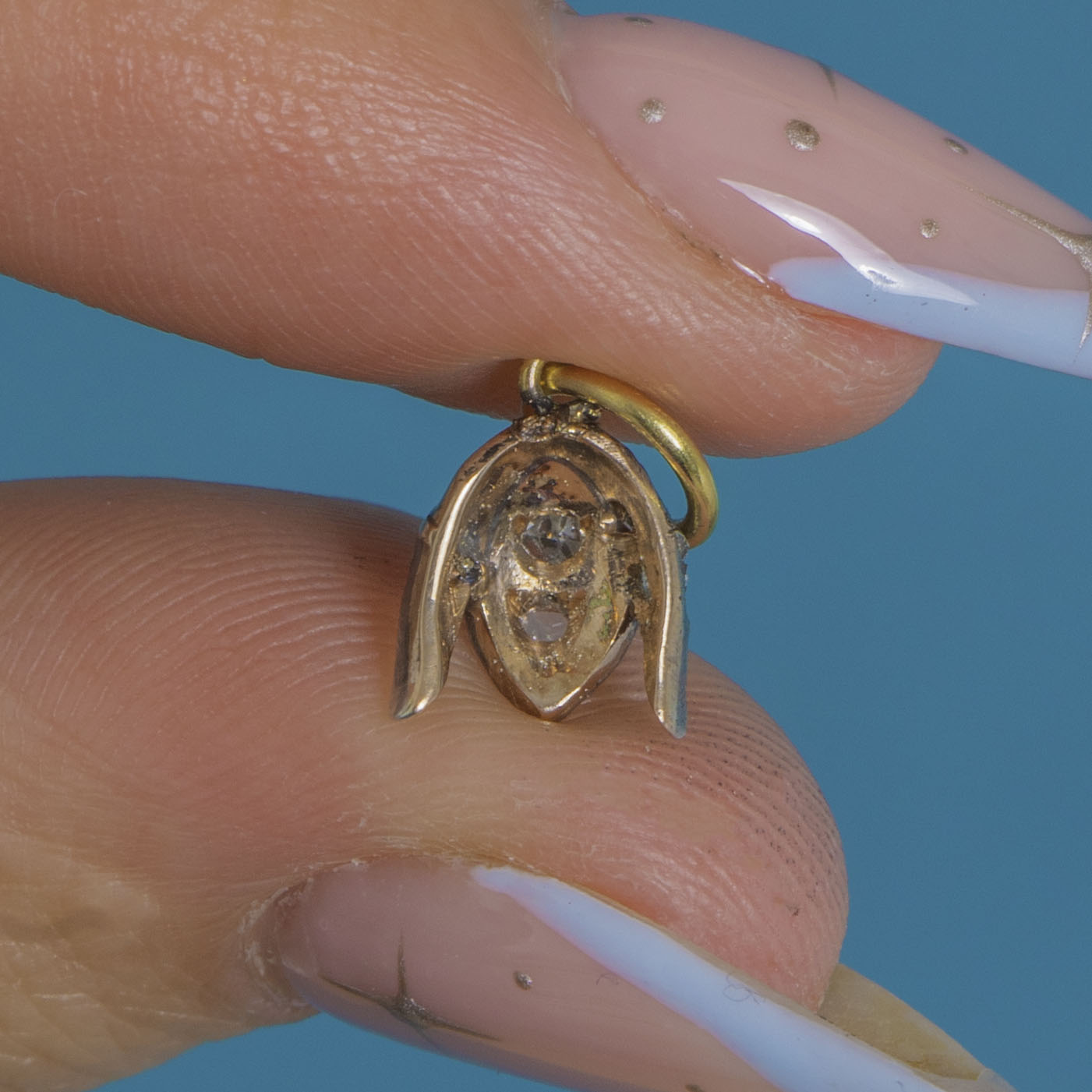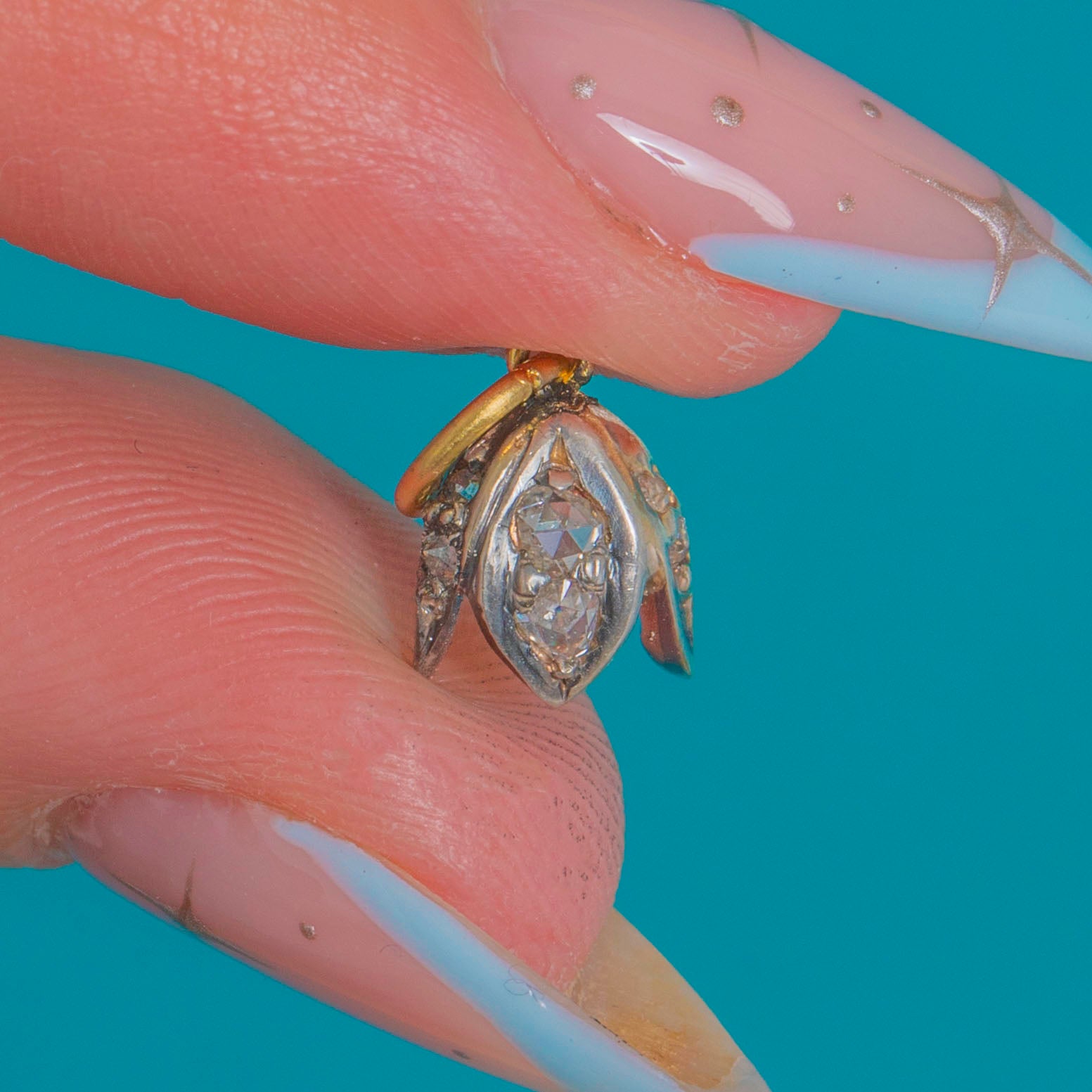 A dainty Victorian flower-bud charm crafted in the classic Silver-topped 18ct Gold and set with glinting rose-cut Diamonds. Three softly contoured petal panels embrace the Diamonds, creating a romantic bloom silhouette with antique allure.