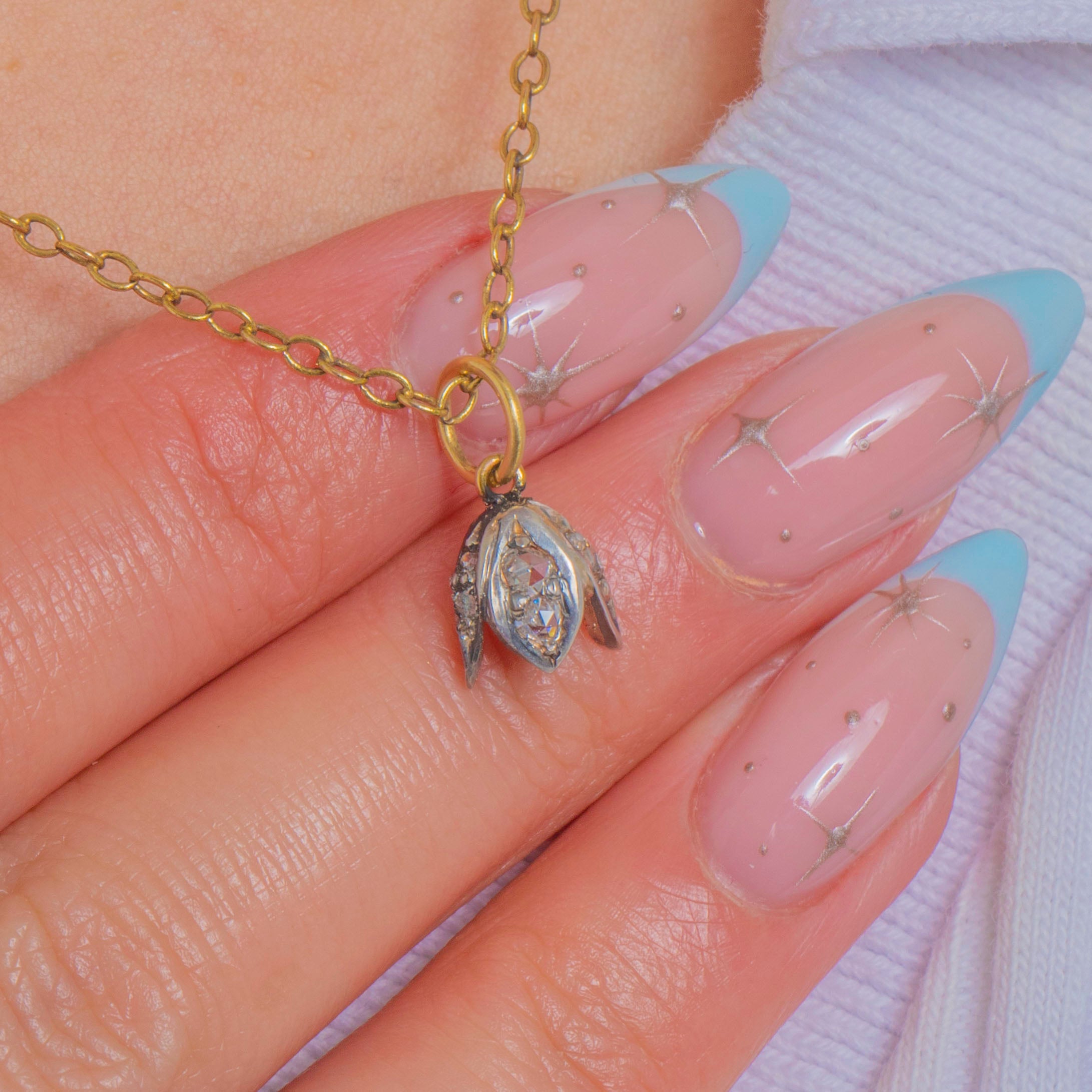 A dainty Victorian floral charm, hand-crafted in luminous Silver over rich 18ct Gold and set with twinkling rose-cut Diamonds. Petite yet radiant, its two-tone palette beautifully elevates the Diamonds, giving that soft, antique shimmer collectors adore.