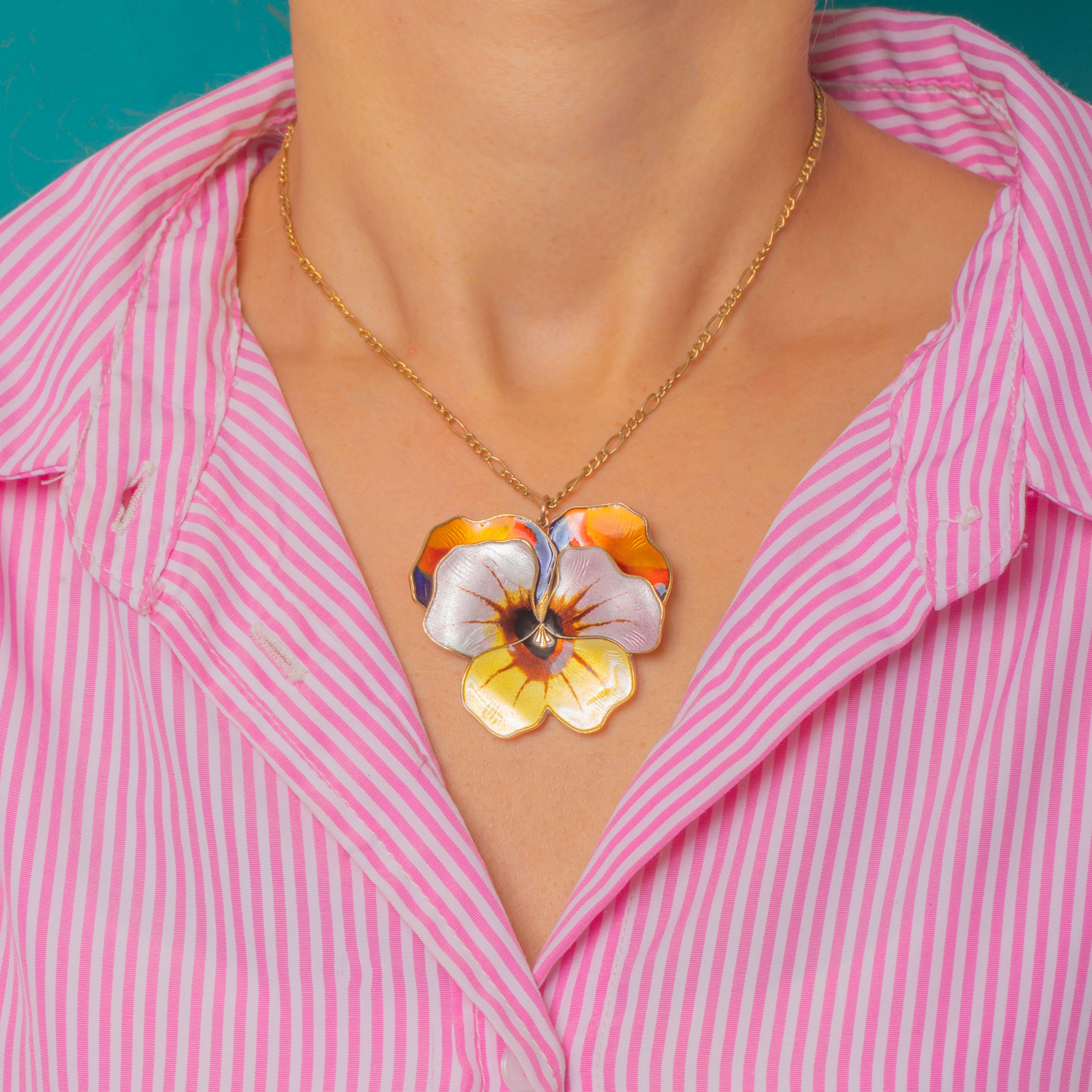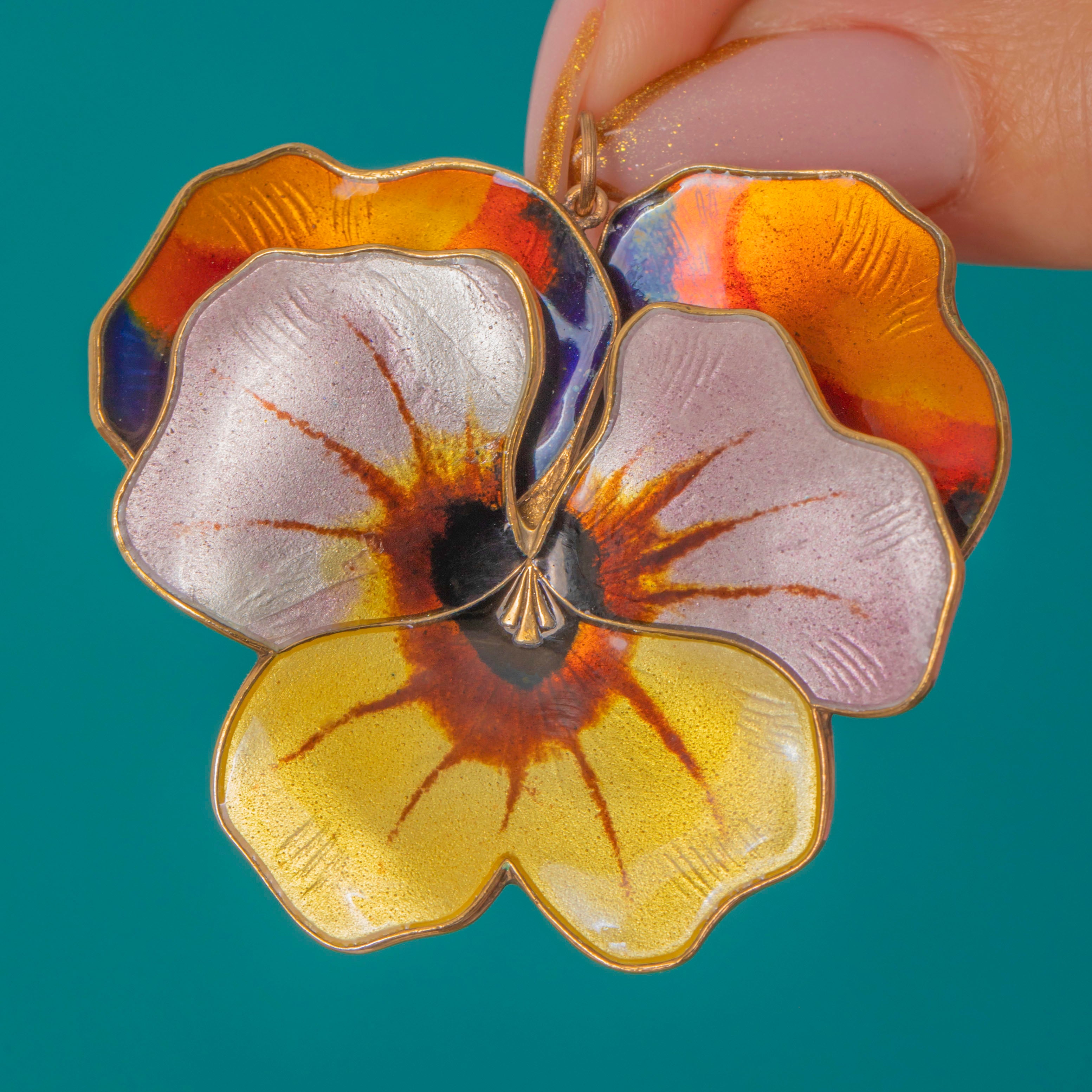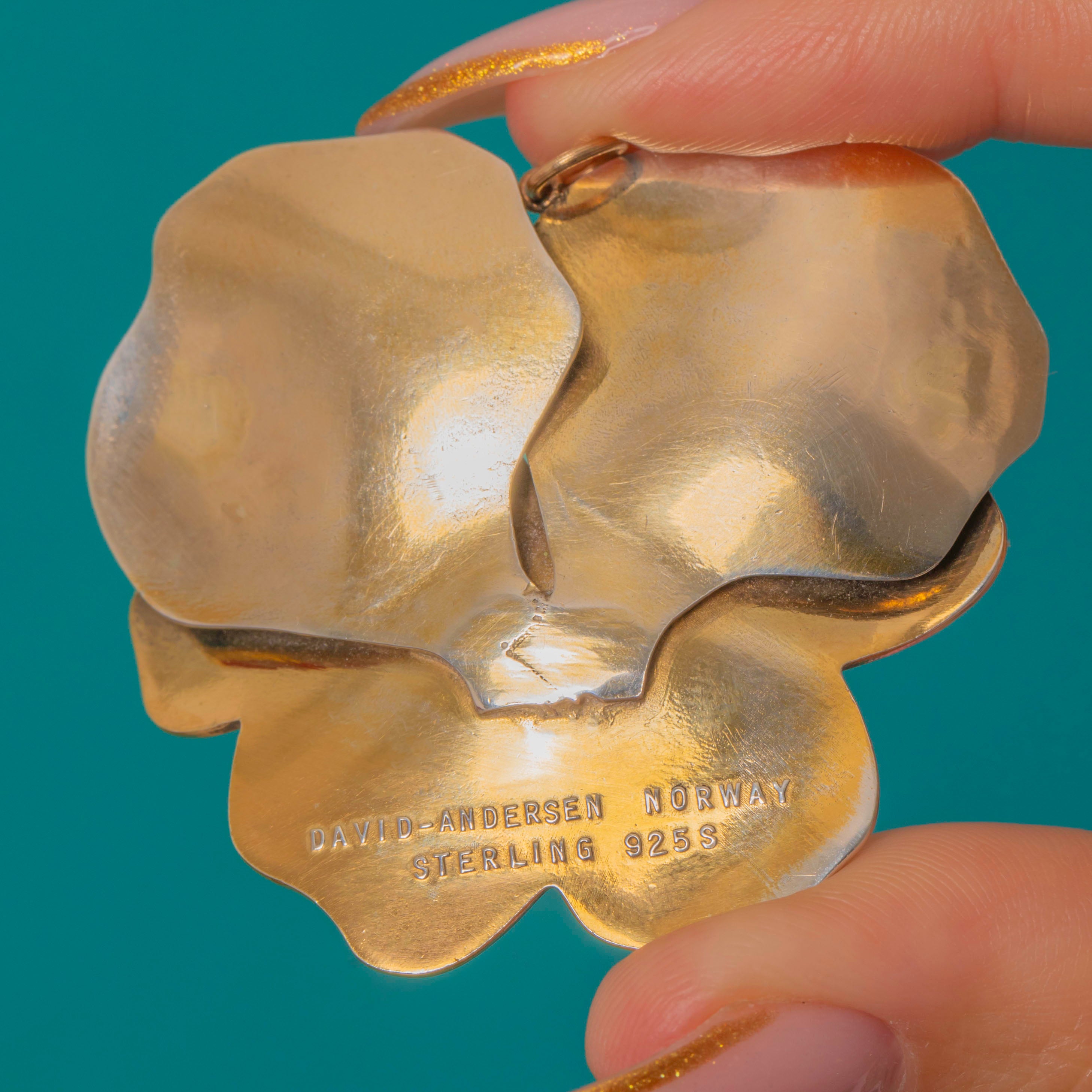 This exquisite mid-century pansy pendant showcases the bold colour and craftsmanship that made the David Andersen world-famous. Formed in solid Sterling Silver- (cleverly gilded with Gold on the reverse to avoid tarnishing!), its lifelike petals are painted with layers of translucent Enamel in glowing orange, soft pink and lemon yellow — each shaded by hand to create a luminous, naturalistic finish.