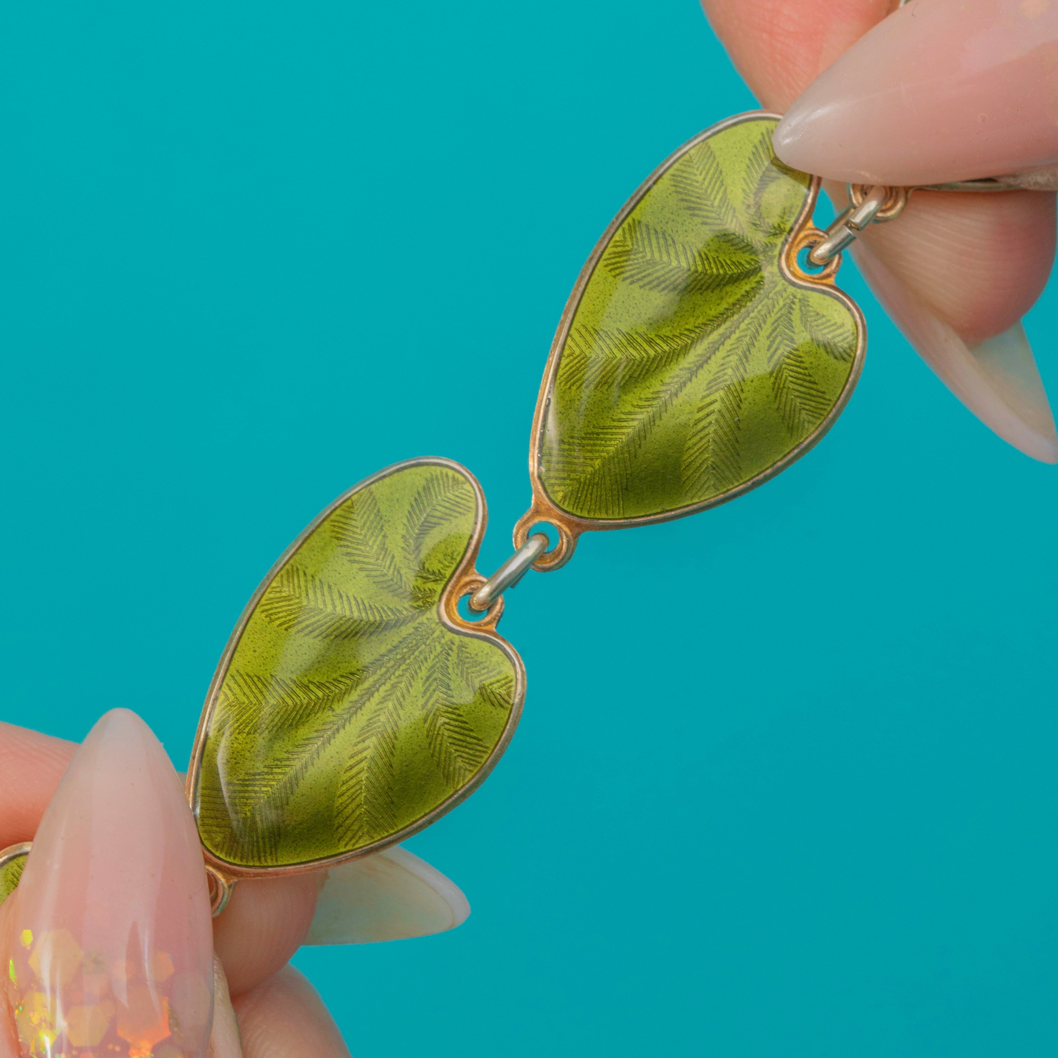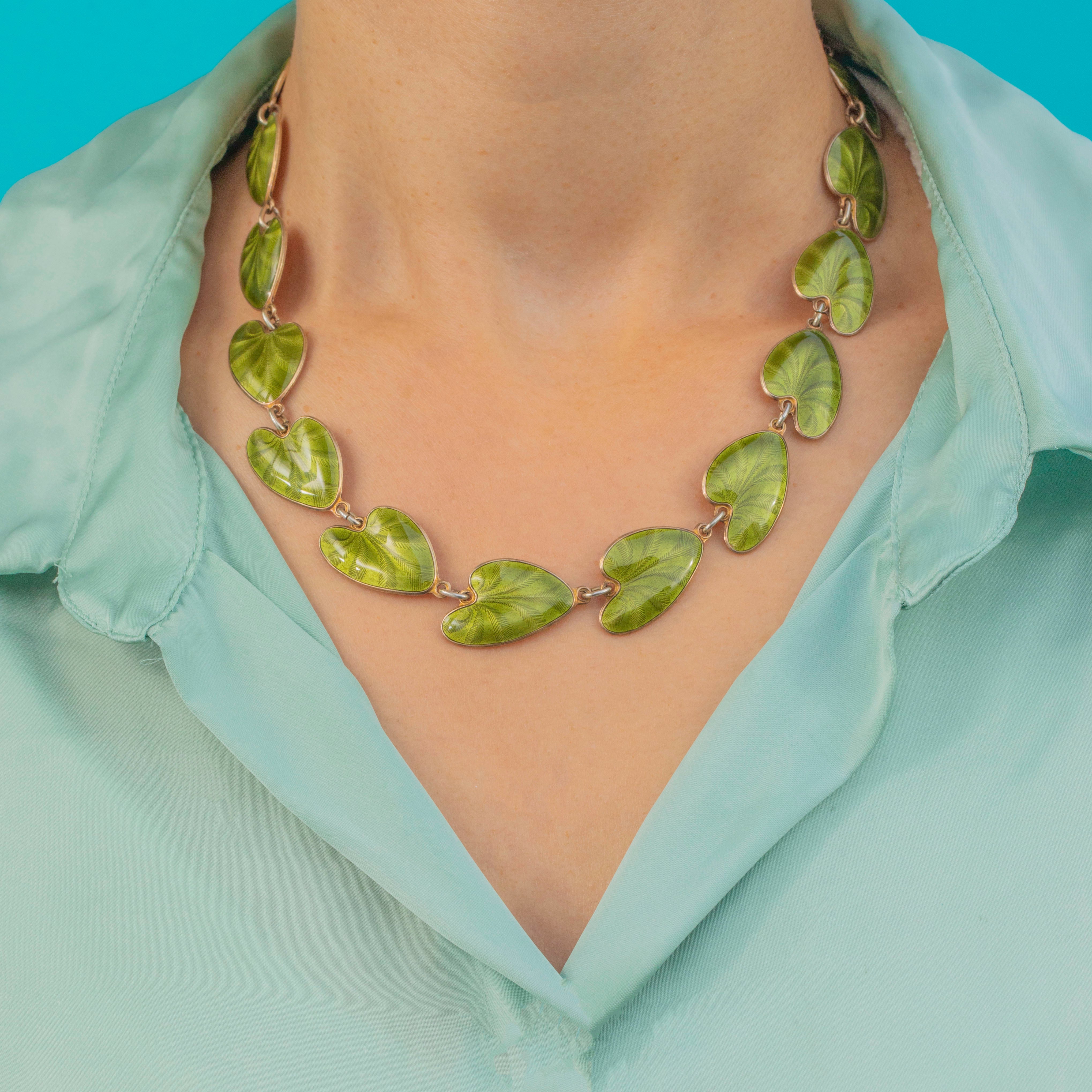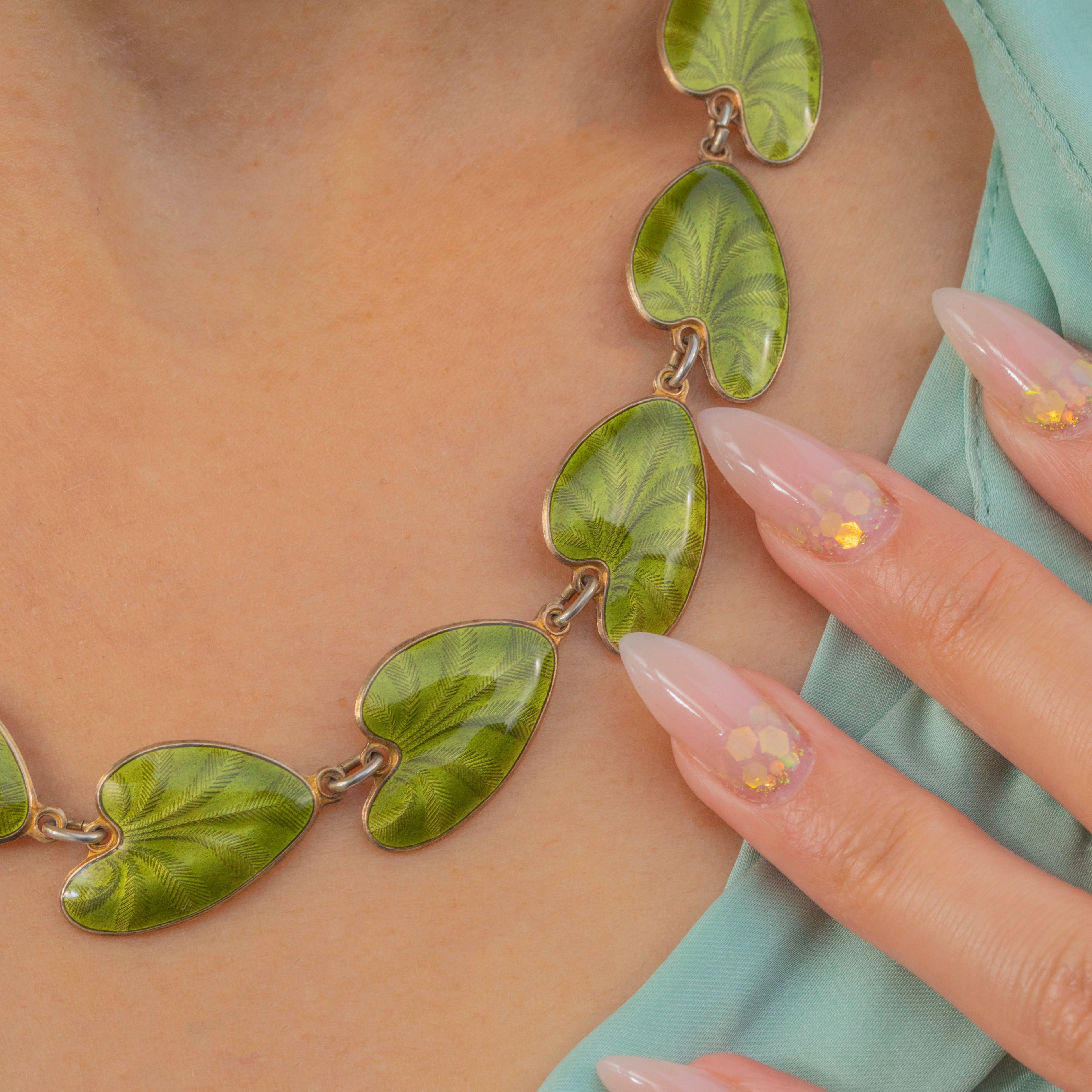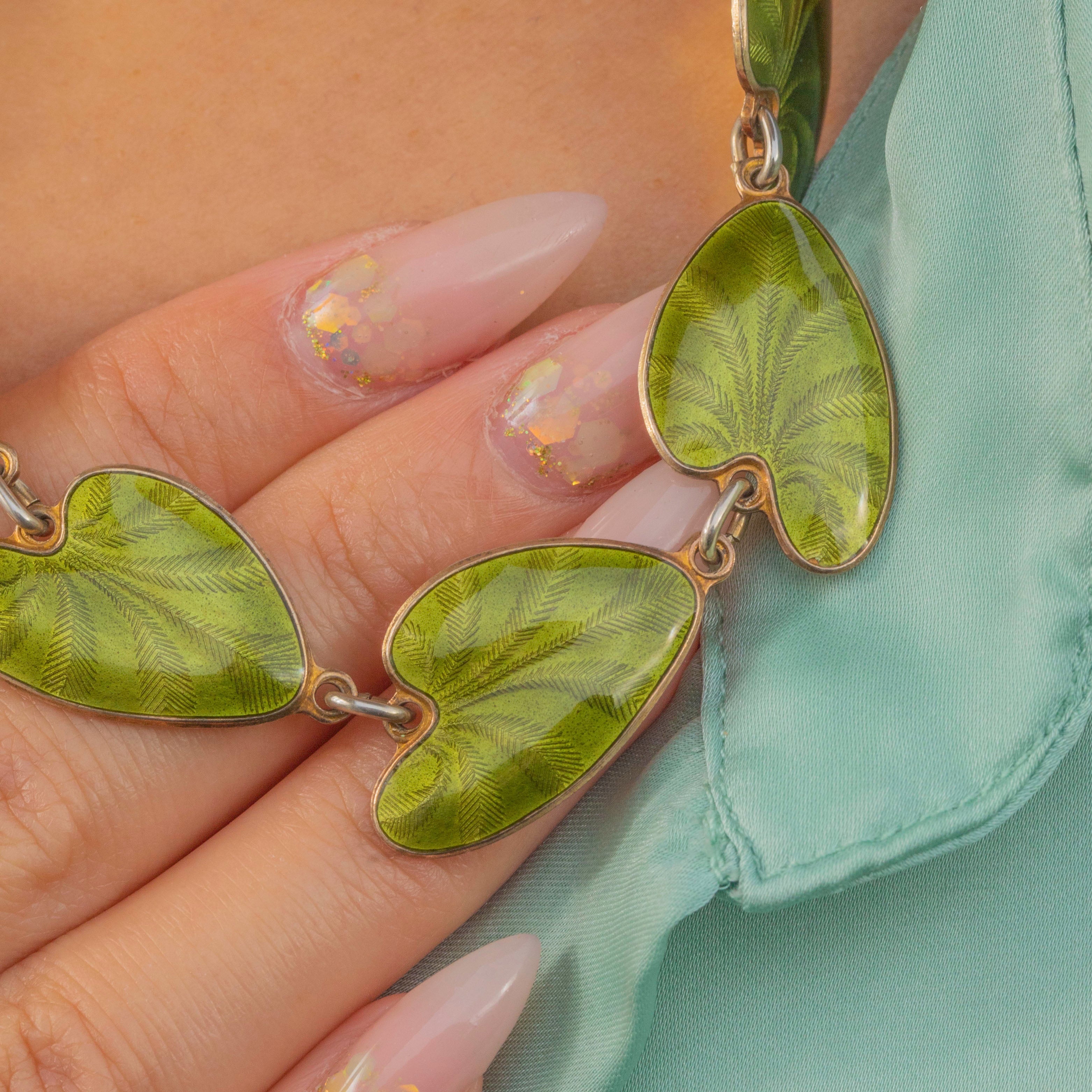 A beautiful Vintage David Andersen enamel leaf necklace in gilded Silver. This iconic design features a series of softly curved leaves, each coated in vibrant enamel with fine vein detailing that shimmers as they catch the light. The necklace drapes elegantly around the neck, measuring 16.5" in length and 15mm wide, with each leaf a statement in itself.