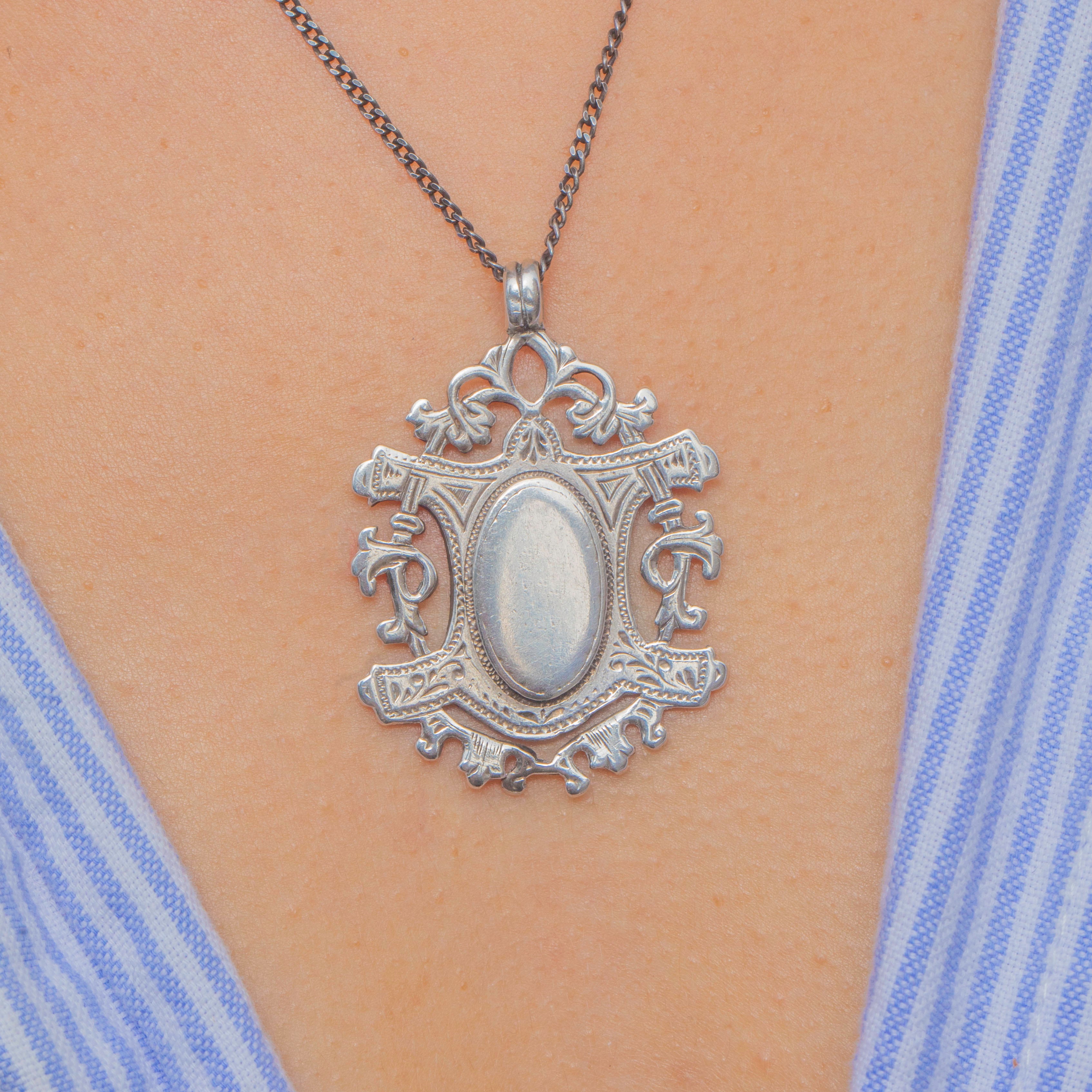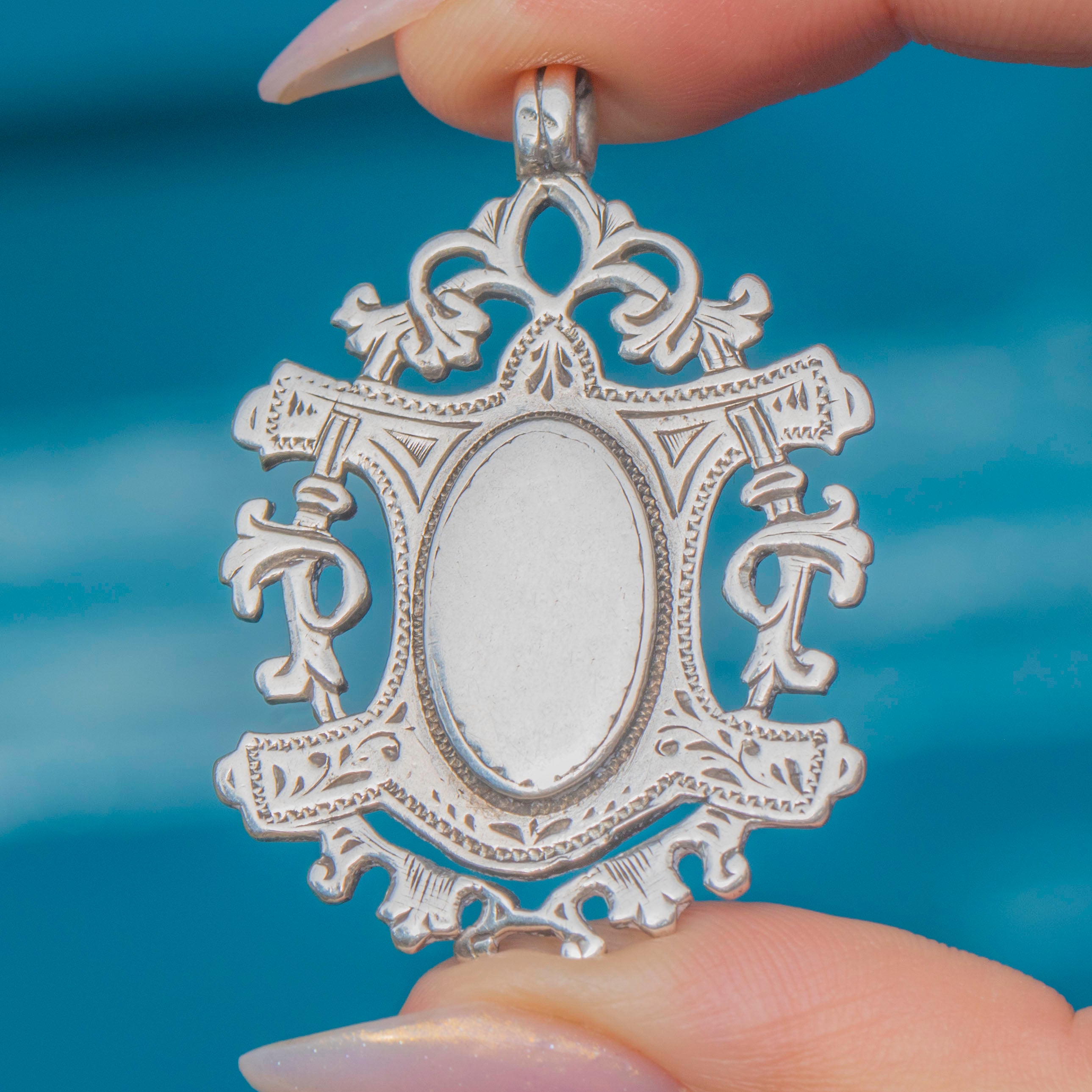 Crafted entirely from glossy Sterling Silver, this large Victorian fob pendant is crafted in a quintessential Victorian style, providing a lovely visual depth.